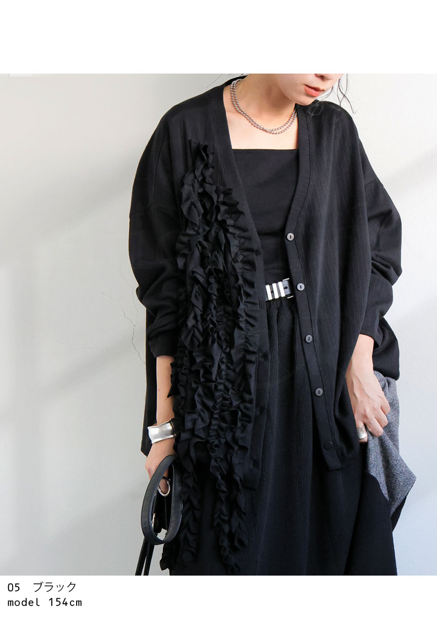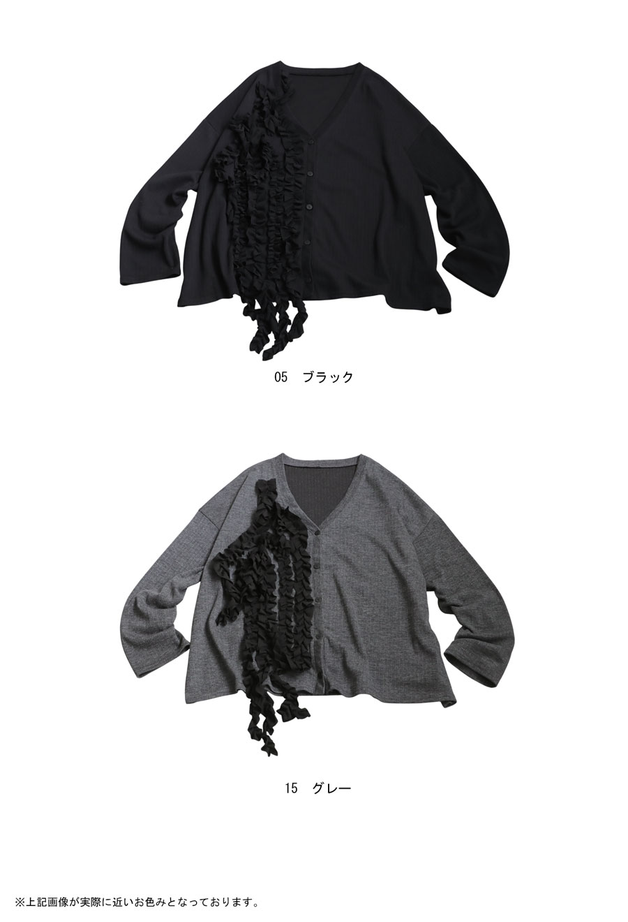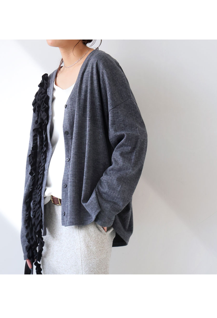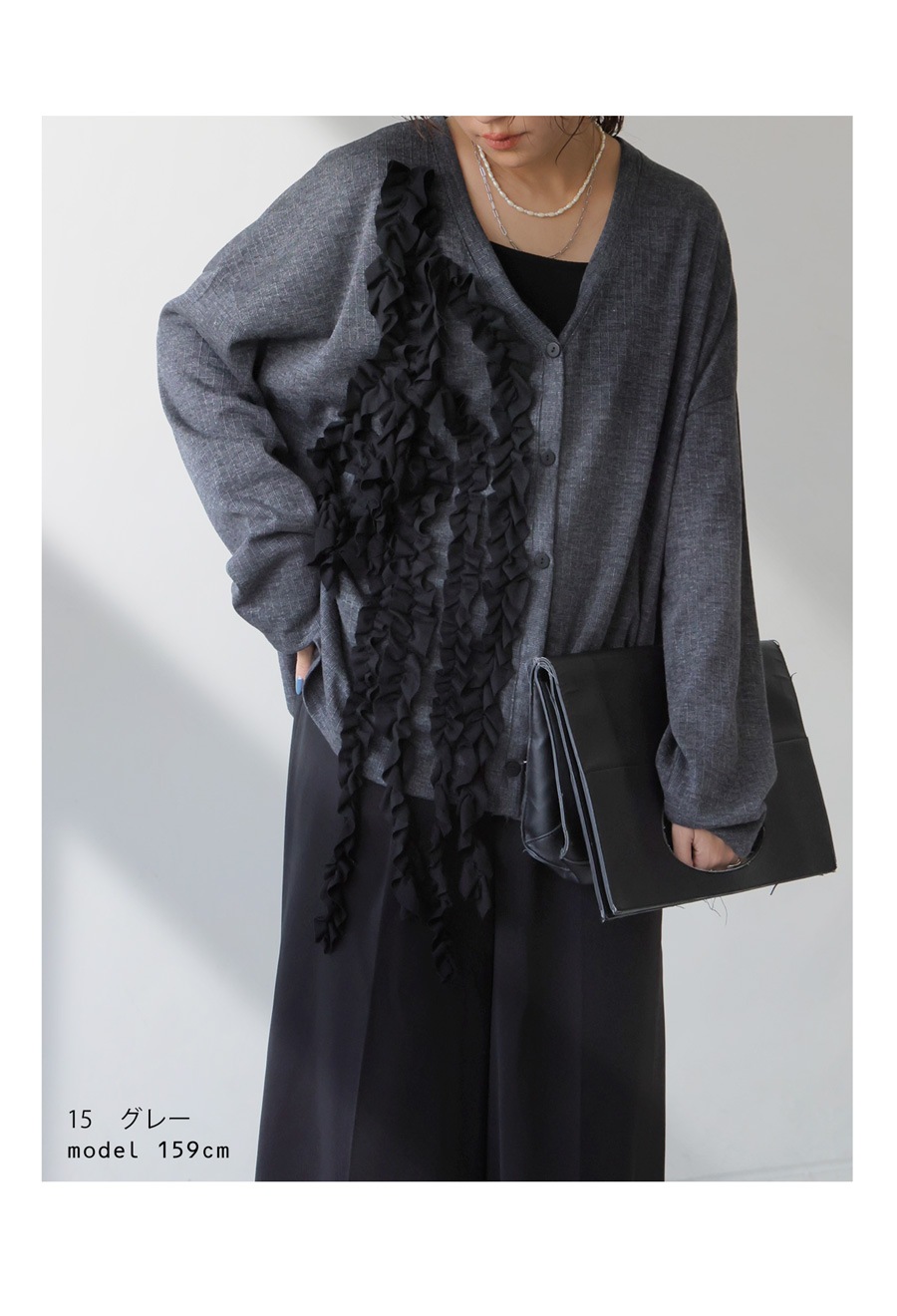 アシンメトリーに施されたギャザーフリルが印象的な、モード感あふれる変形カーディガン。