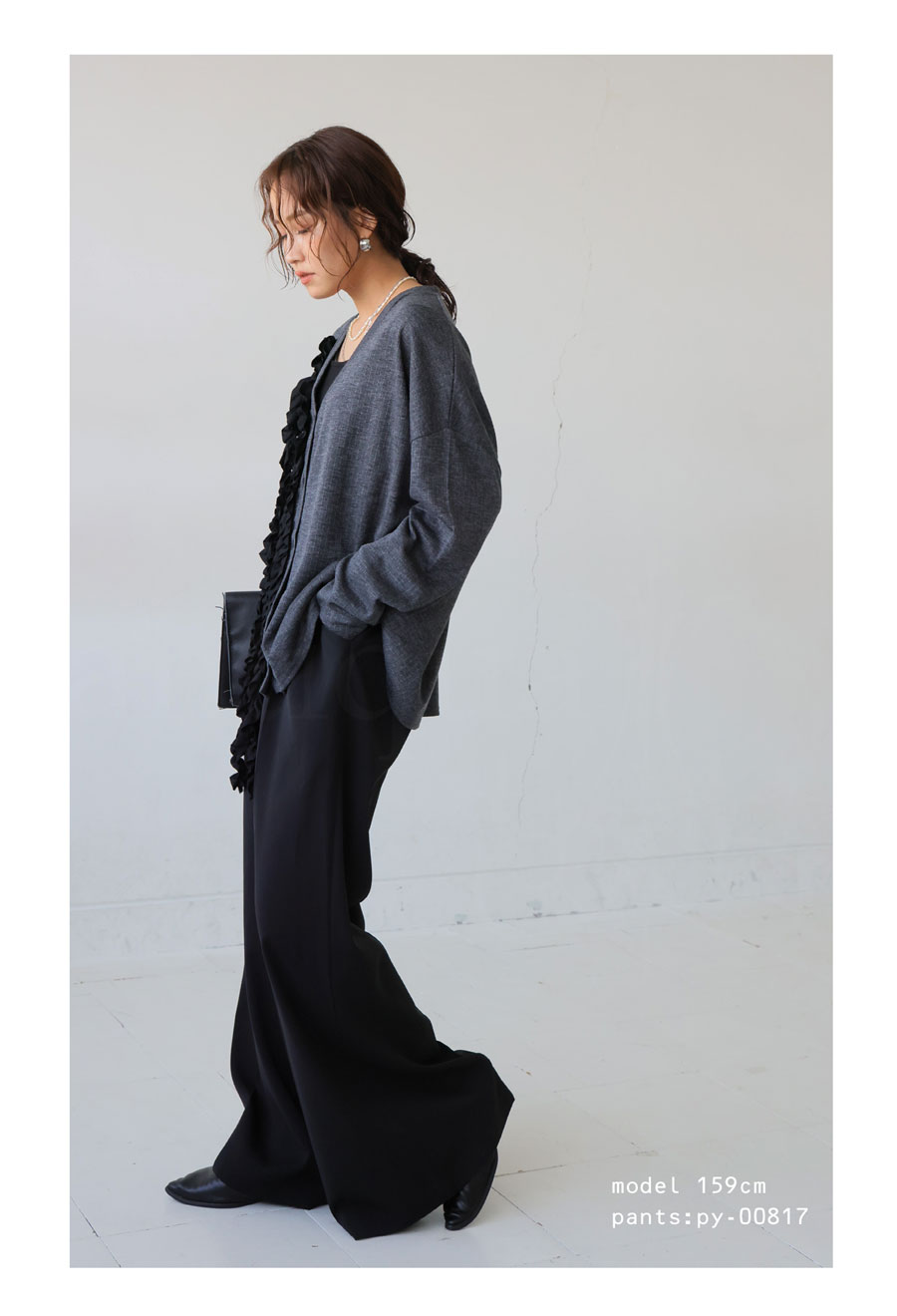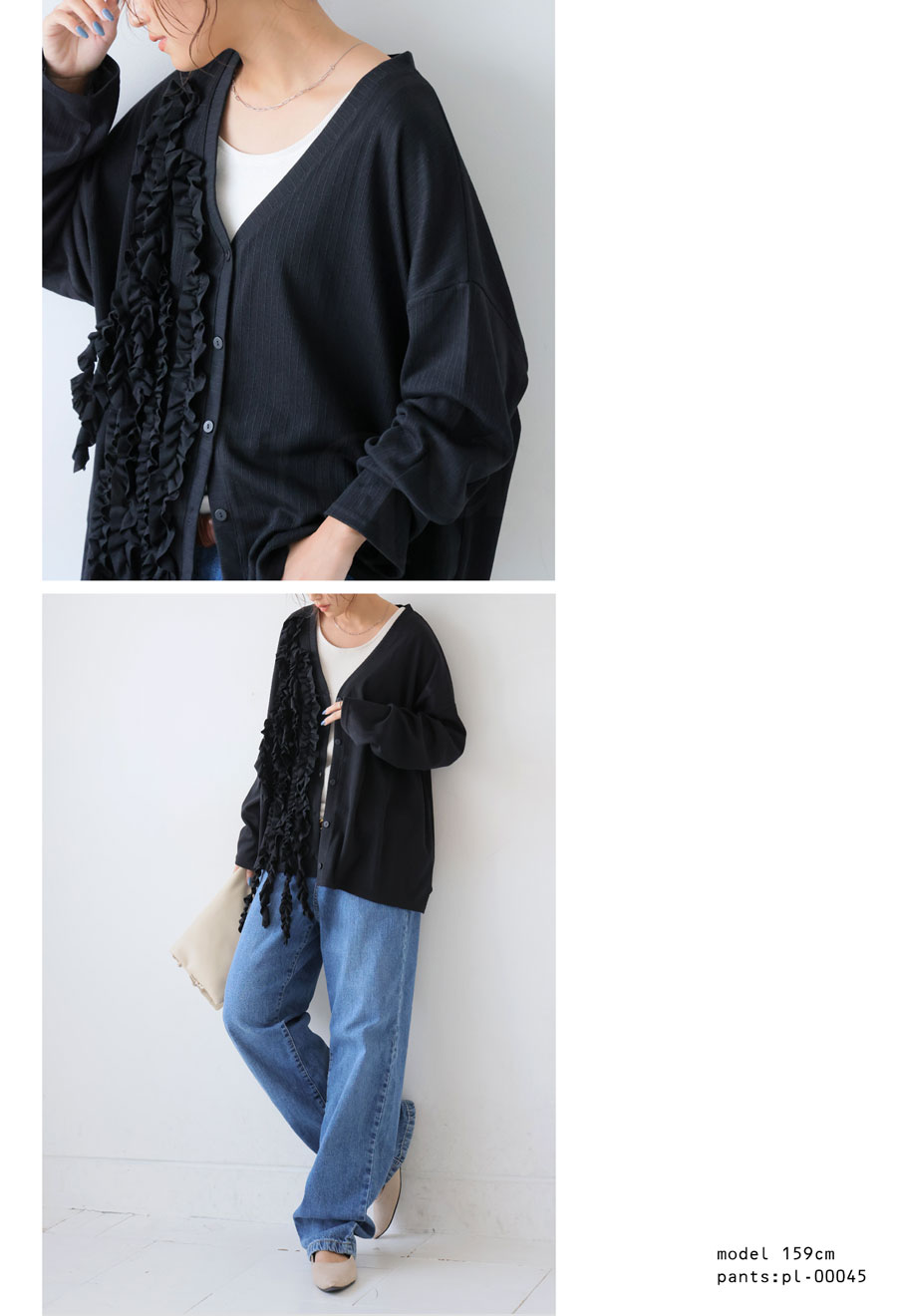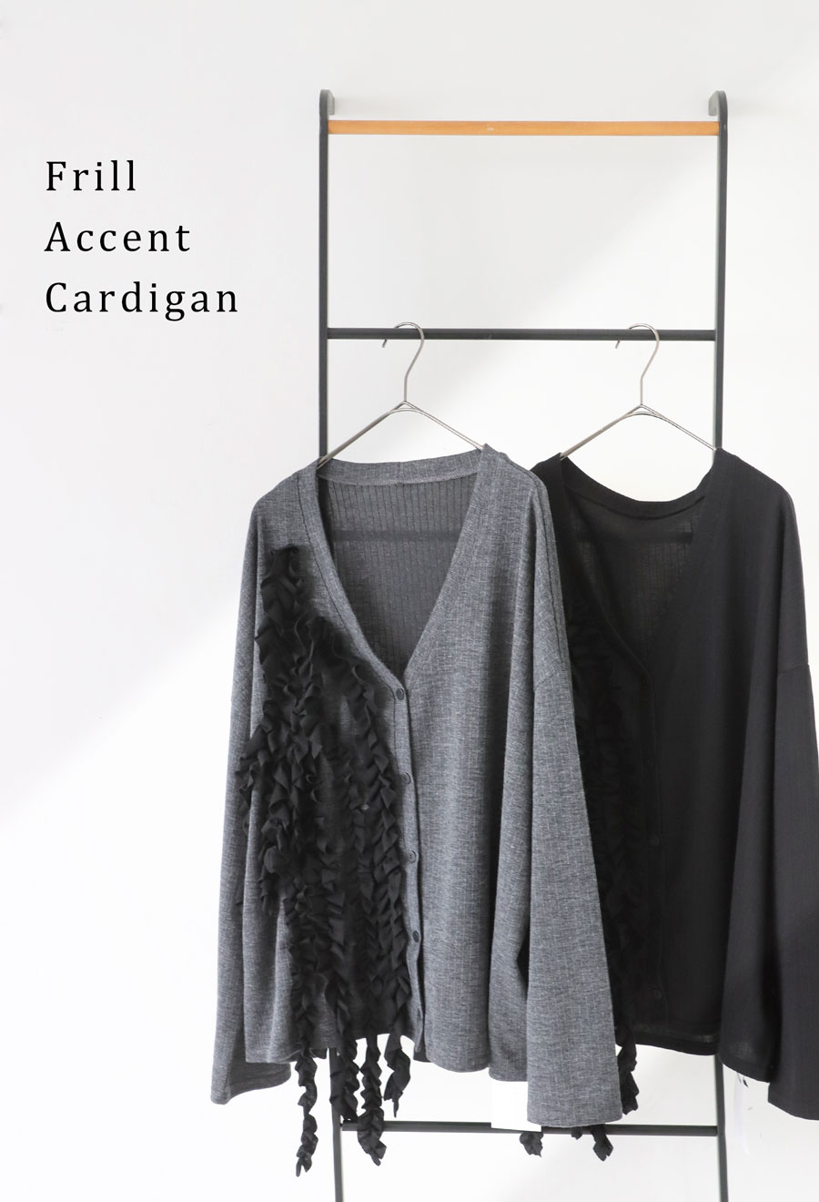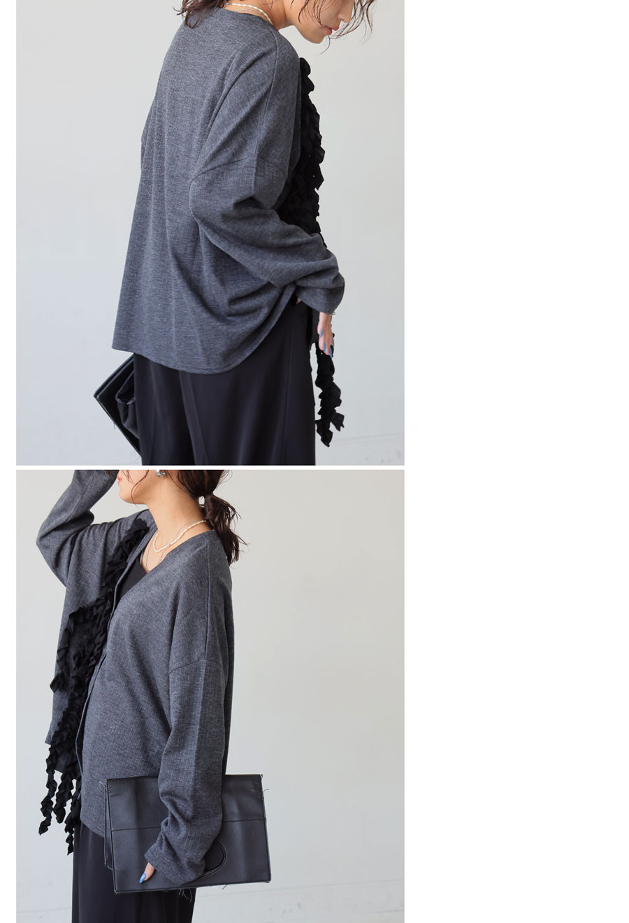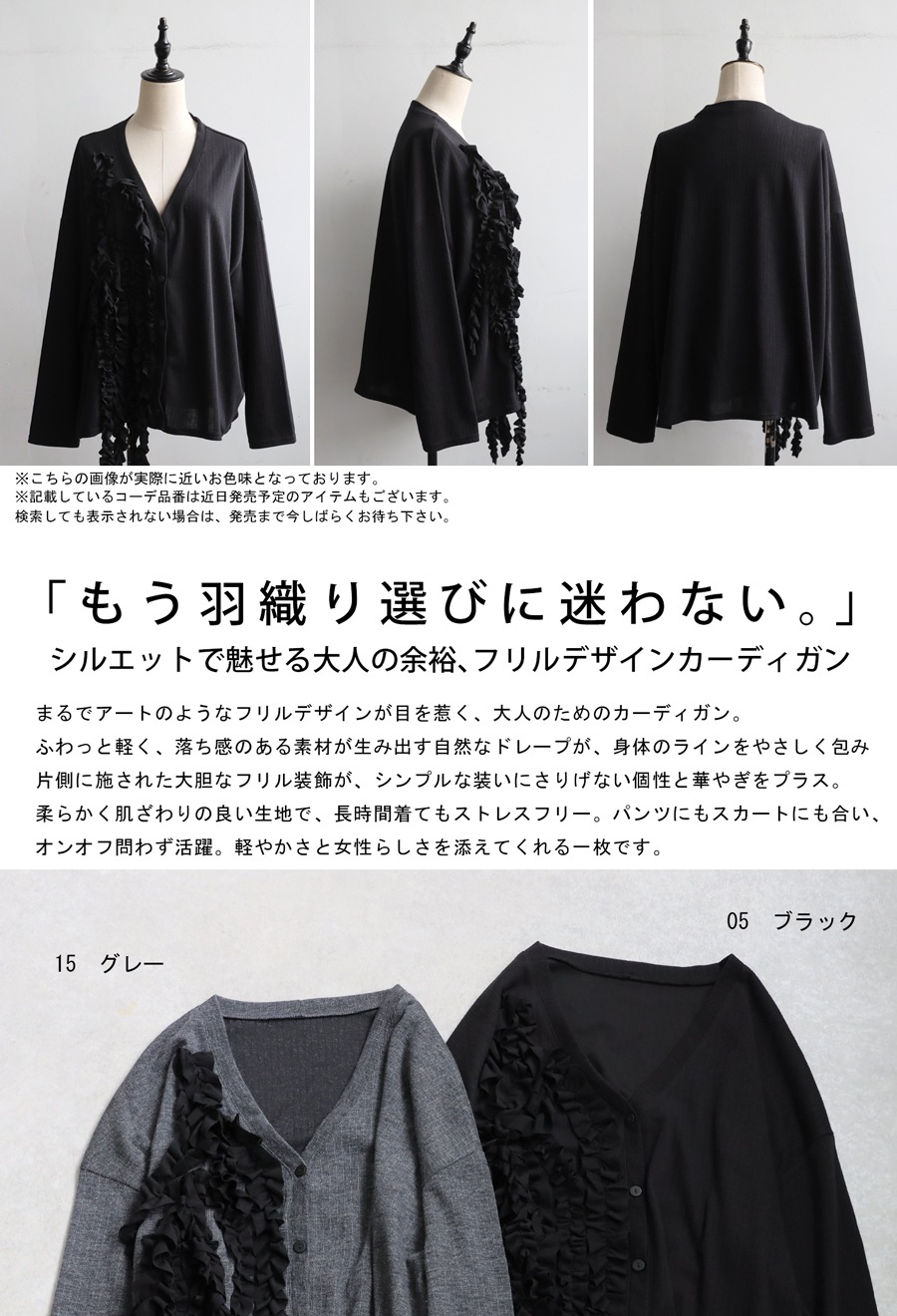 アシンメトリーに施されたギャザーフリルが印象的な、モード感あふれる変形カーディガン。