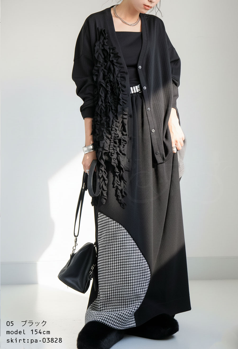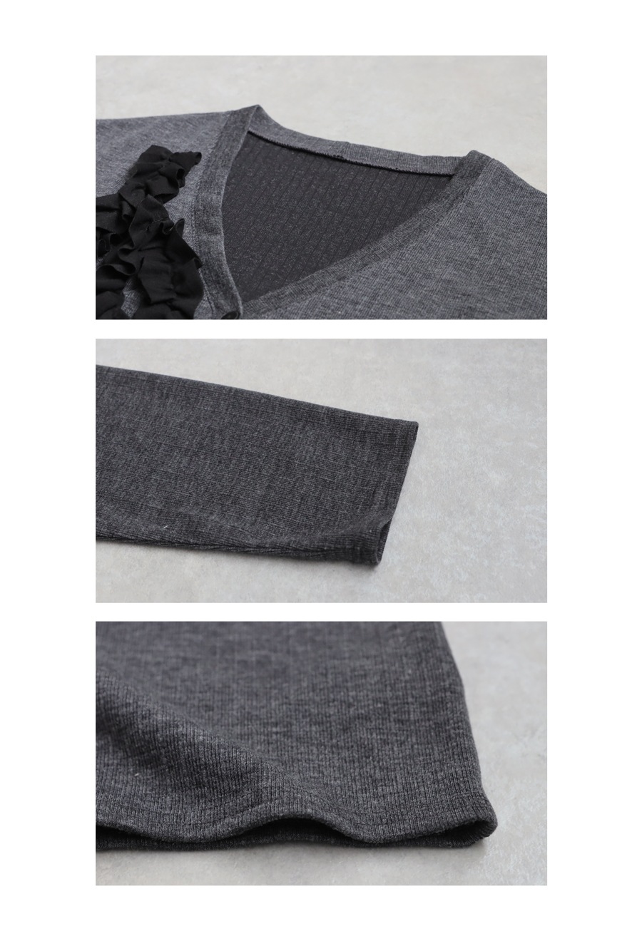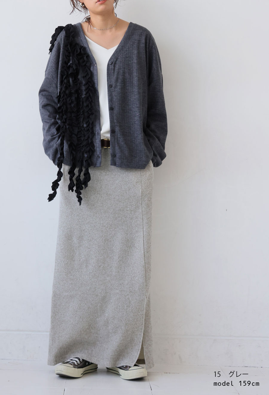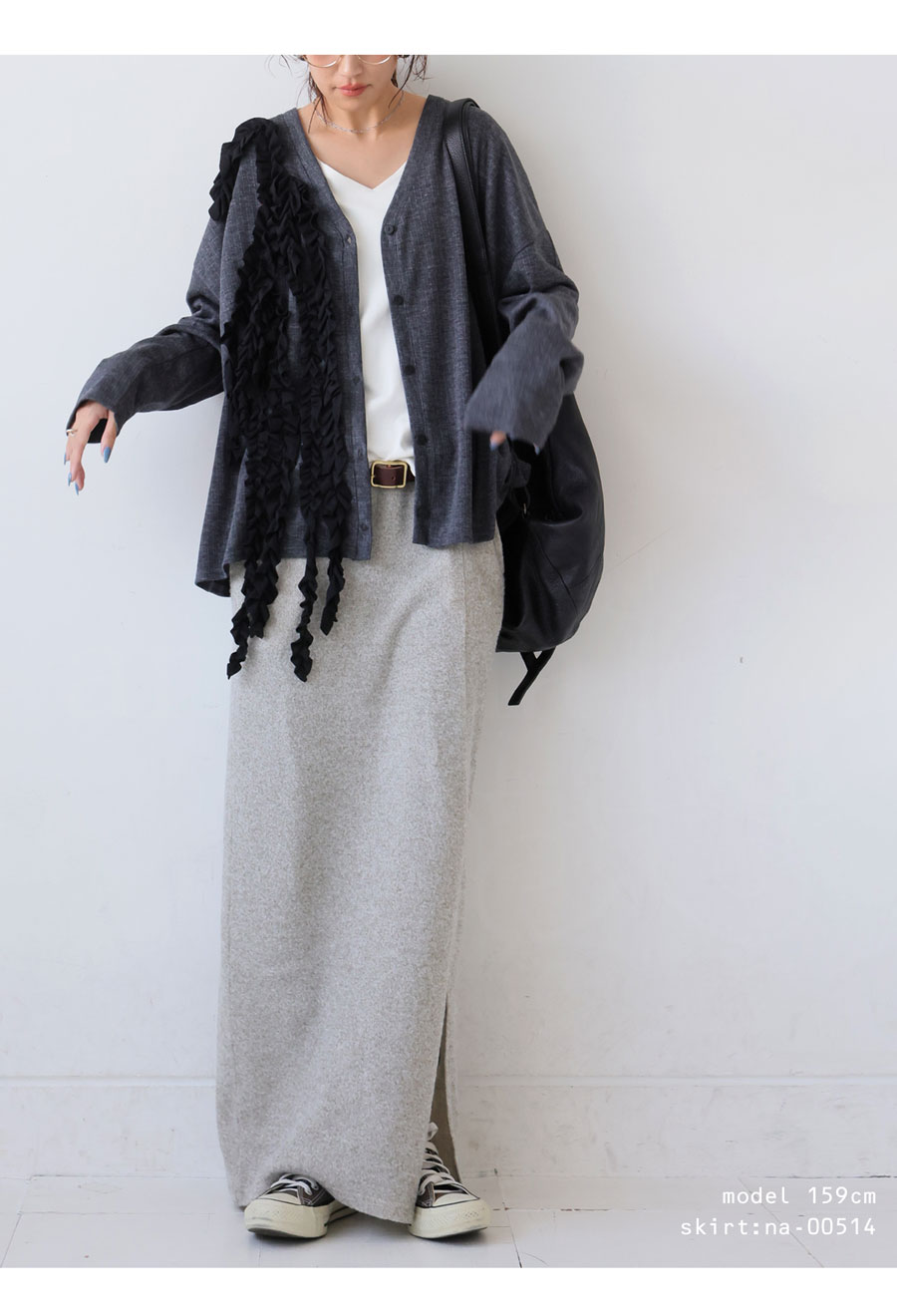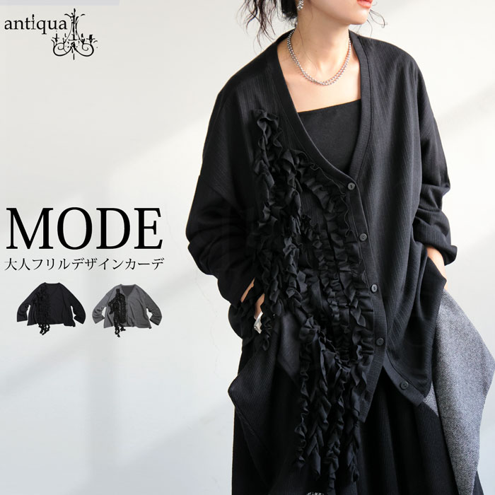 アシンメトリーに施されたギャザーフリルが印象的な、モード感あふれる変形カーディガン。