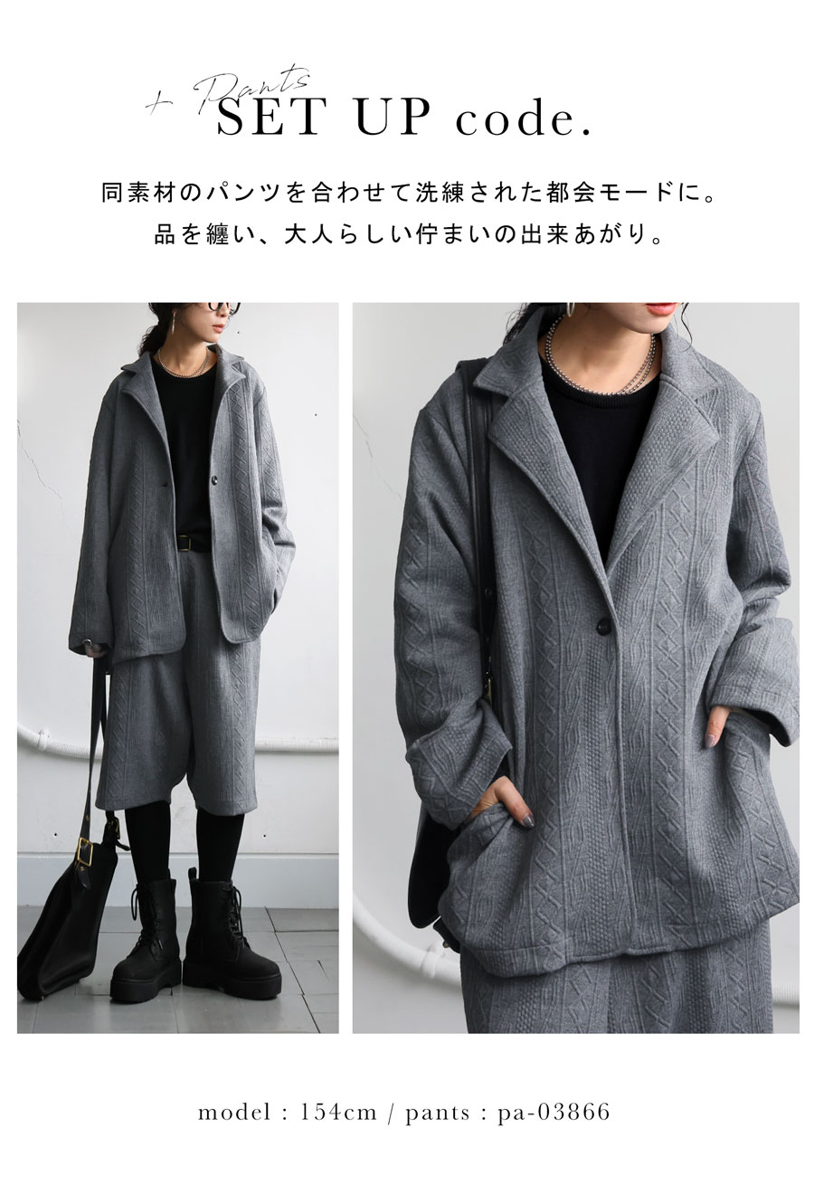 同素材のセットアップ対応パンツ(品番:pa-03866)と合わせれば、統一感のある着こなしに。