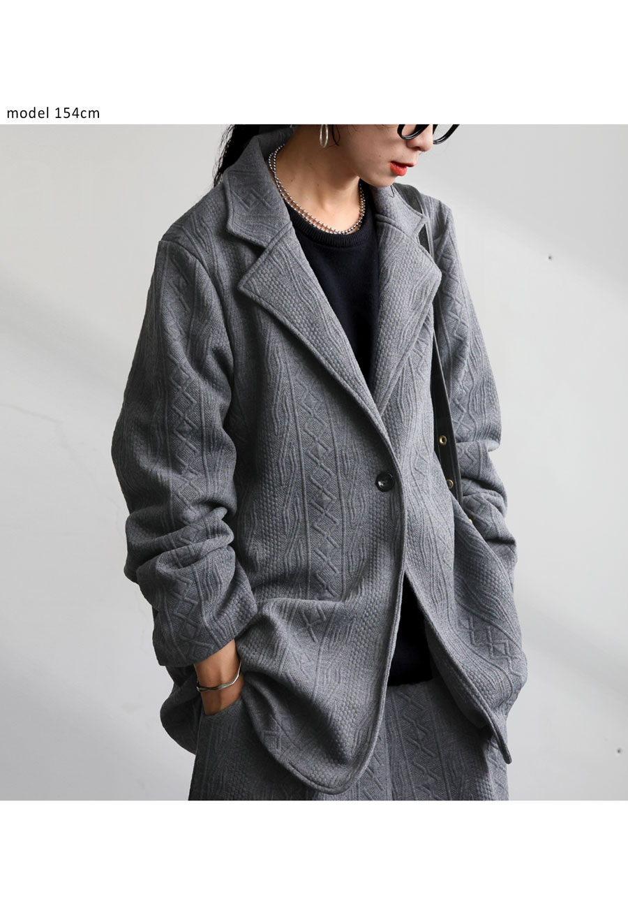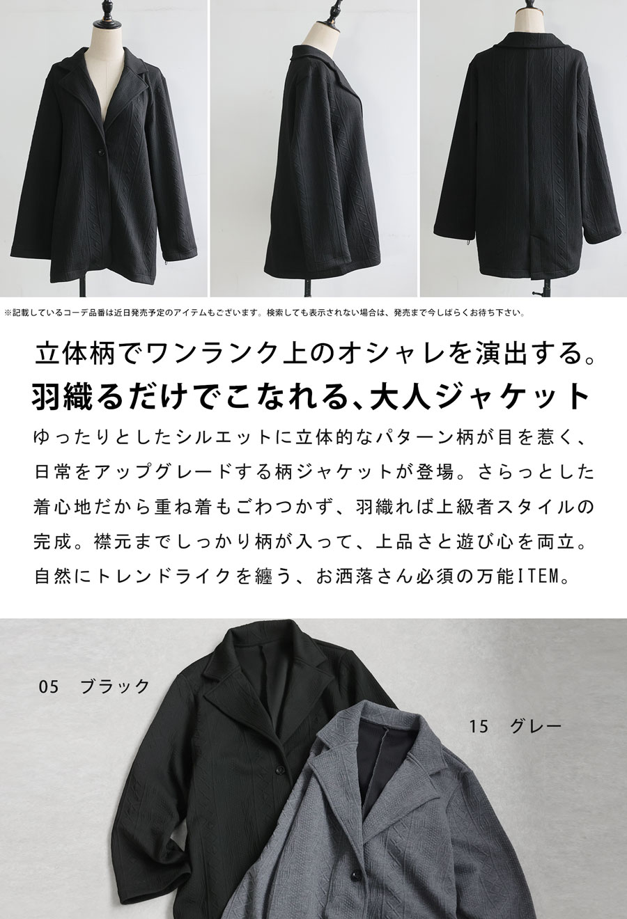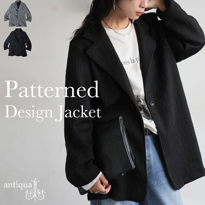 おしゃれな表情を生む立体柄が印象的な、テーラードタイプの長袖ジャケットです。