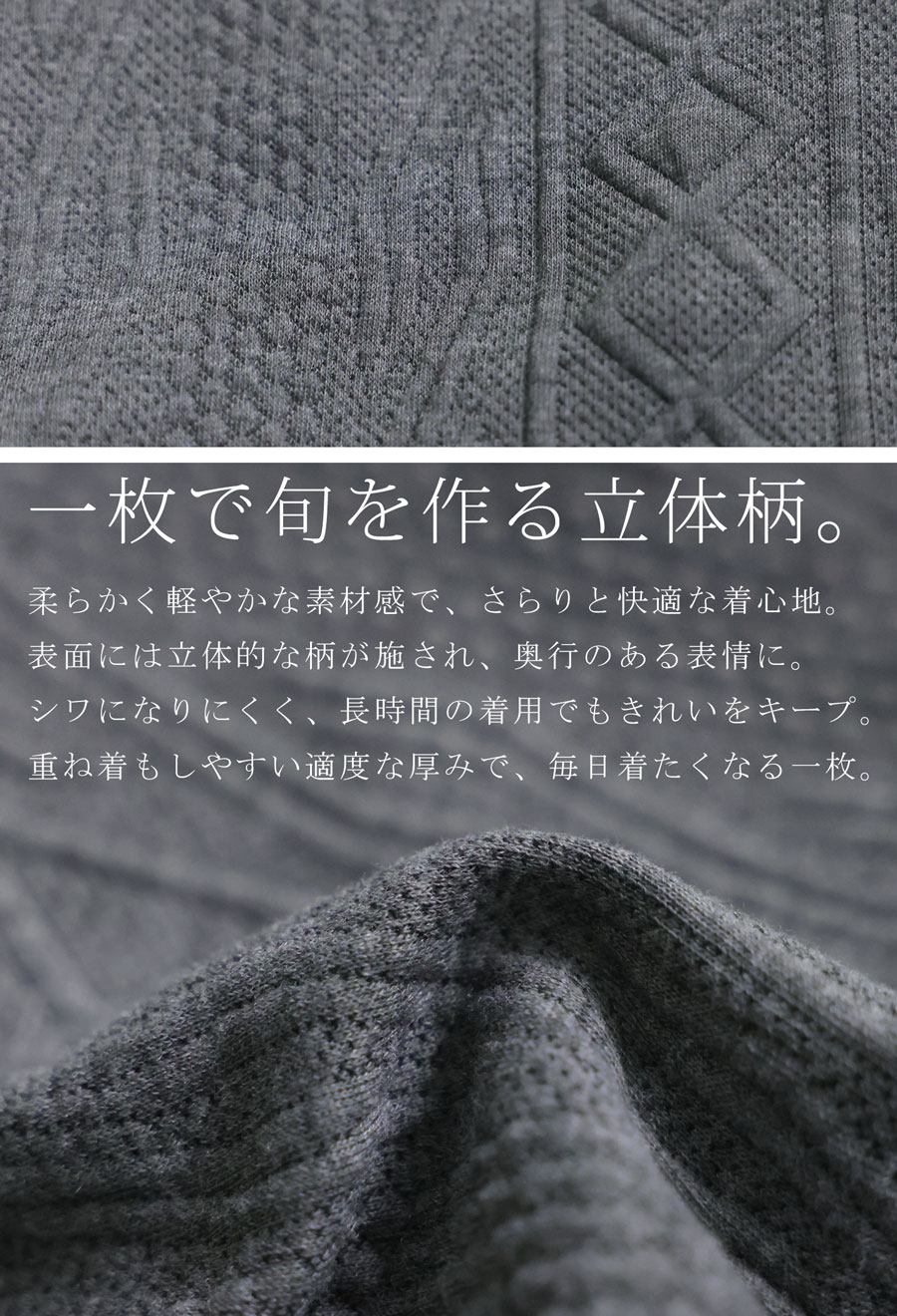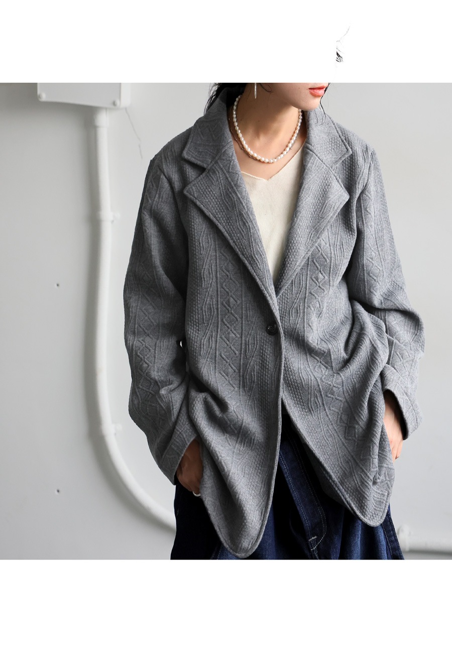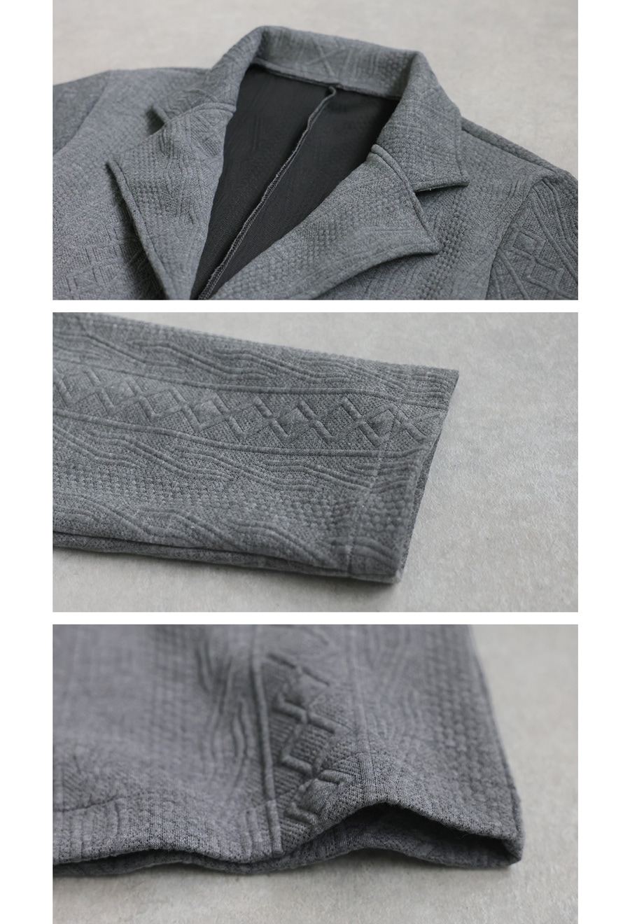 おしゃれな表情を生む立体柄が印象的な、テーラードタイプの長袖ジャケットです。