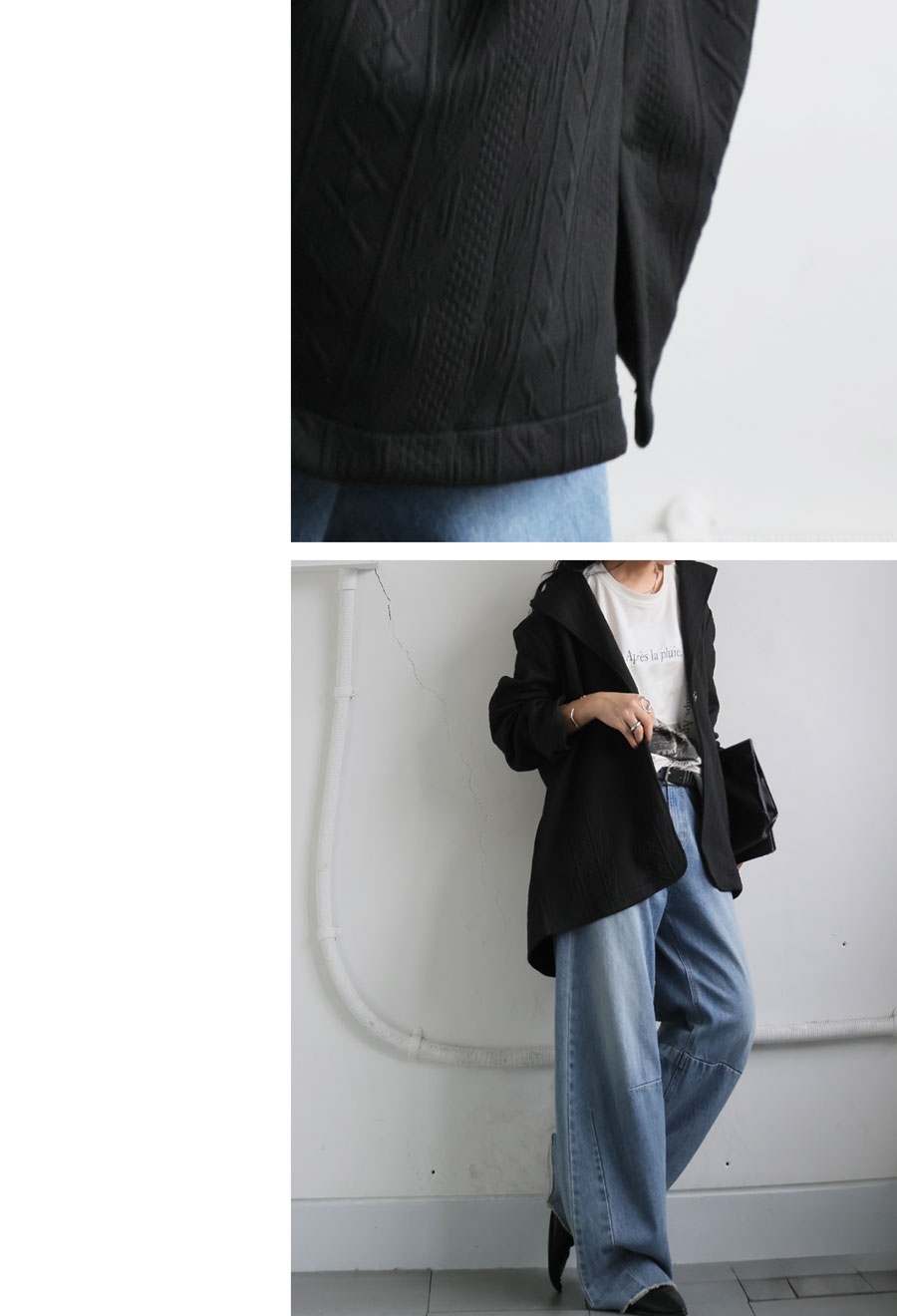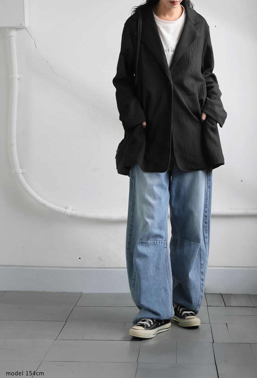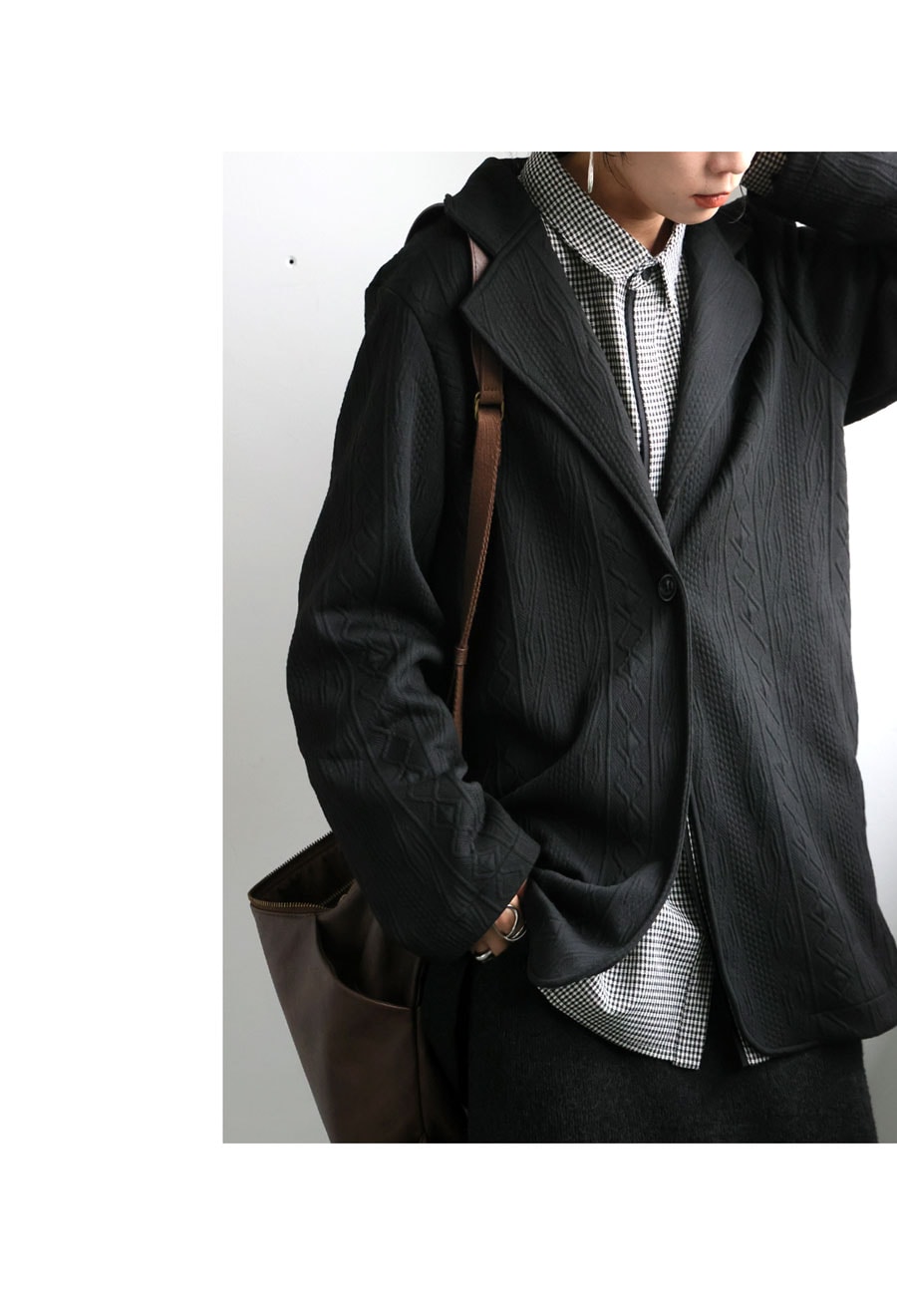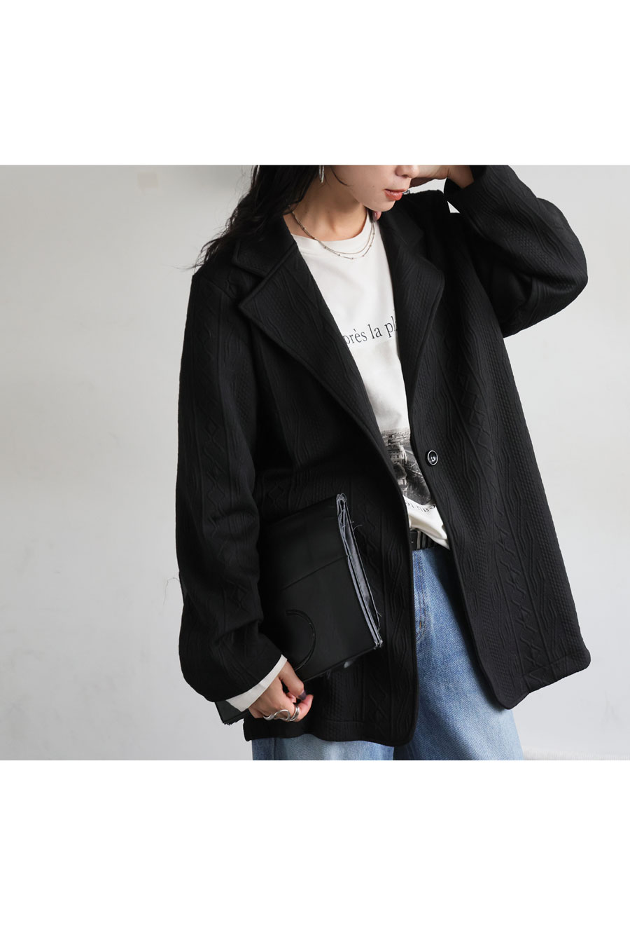 フロントは1つボタン仕様で、ゆったりとしたシルエットが自然に体型をカバーしてくれるのも嬉しいポイント。
