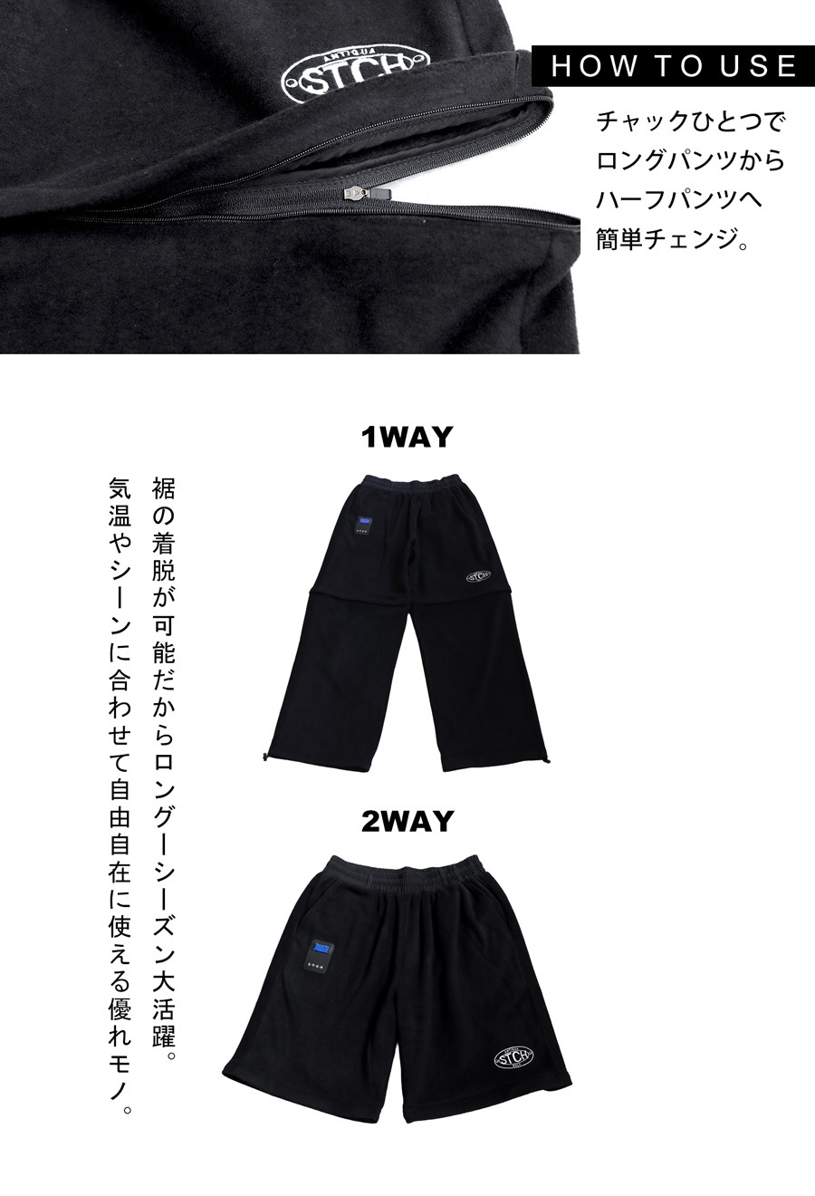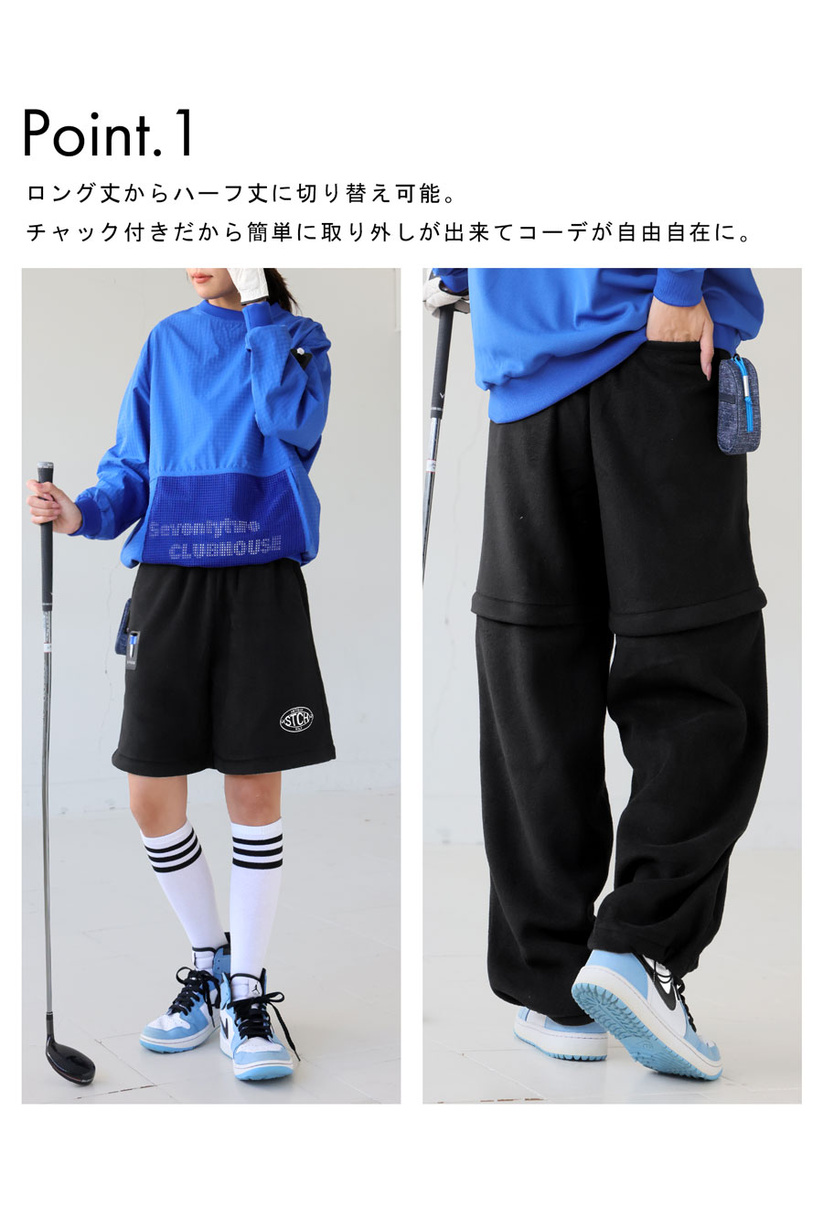 取り外し可能なジップ付きデザインで、寒い時はロング、アクティブな日はハーフスタイルで、自在にスタイリングを楽しめます。