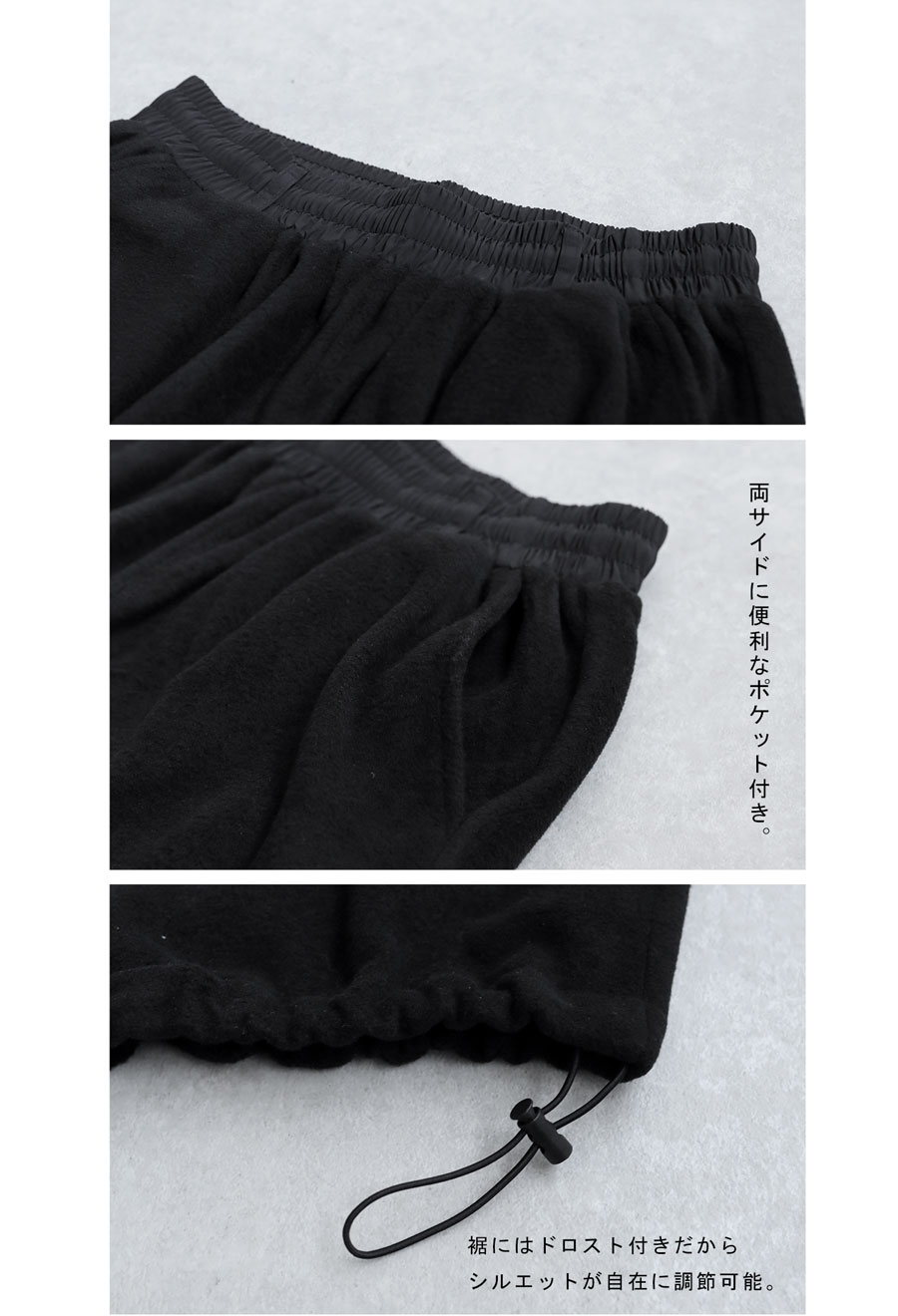 ストレッチの効いた柔らかい生地に、ドロスト仕様のウエストゴムで穿き心地も抜群。