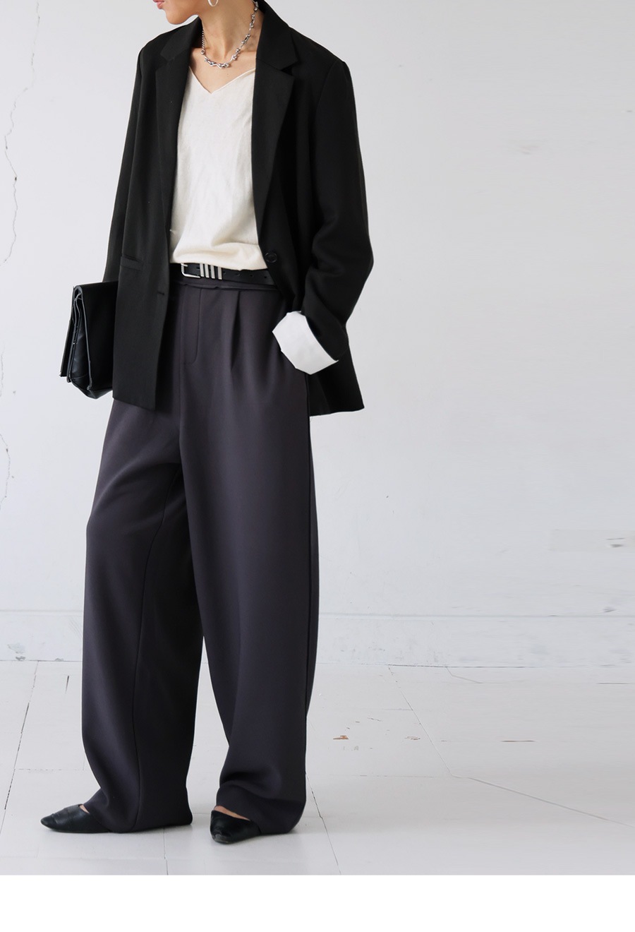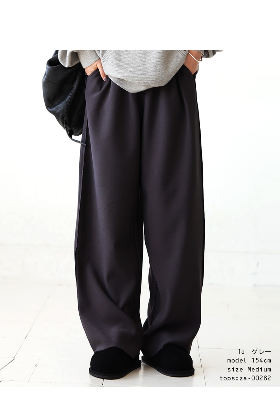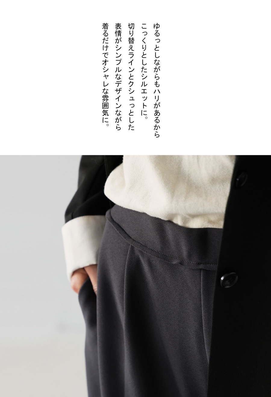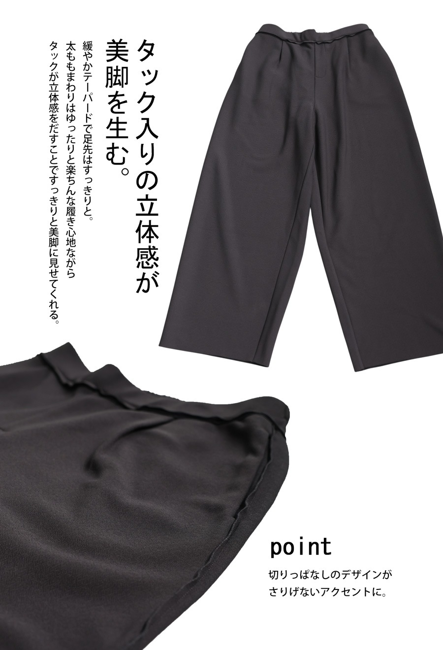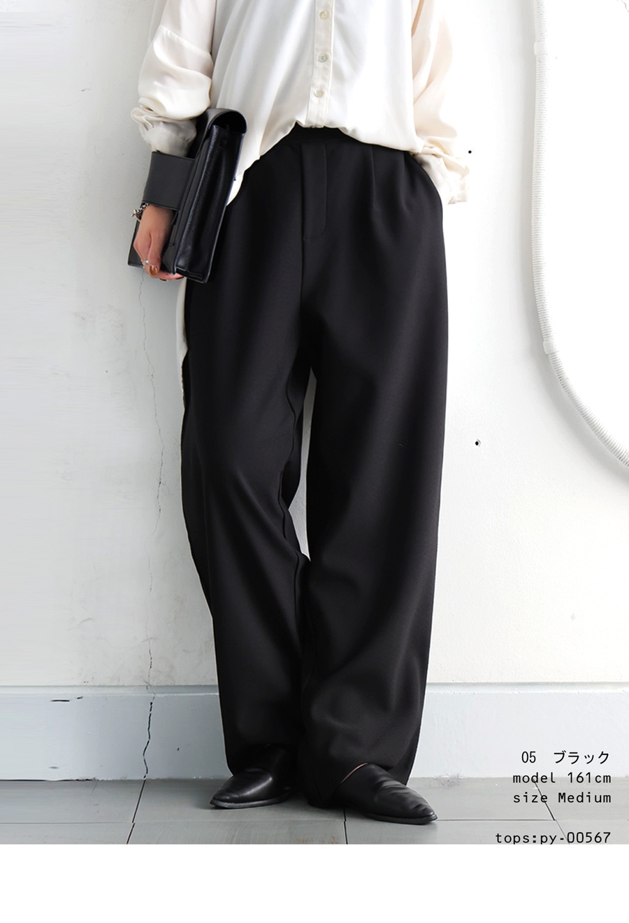 無地デザインにジョーゼット調の質感が高見えを演出し、ワイドすぎないテーパードシルエットが美脚ラインを叶えます。
