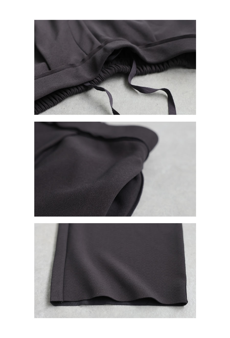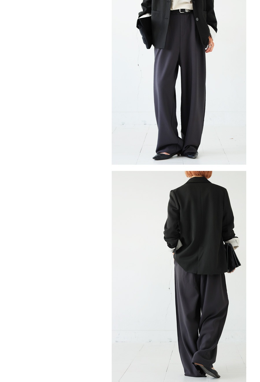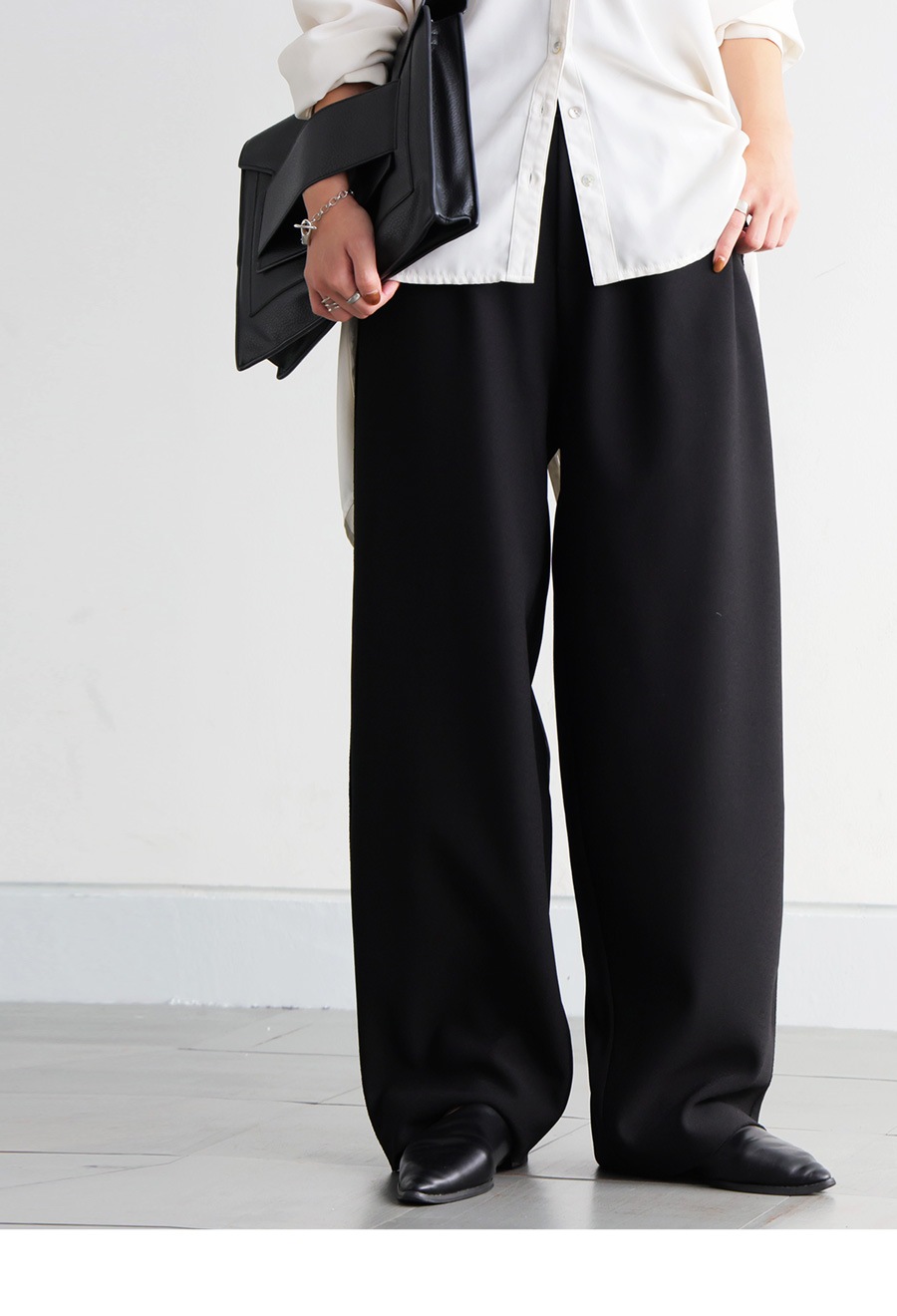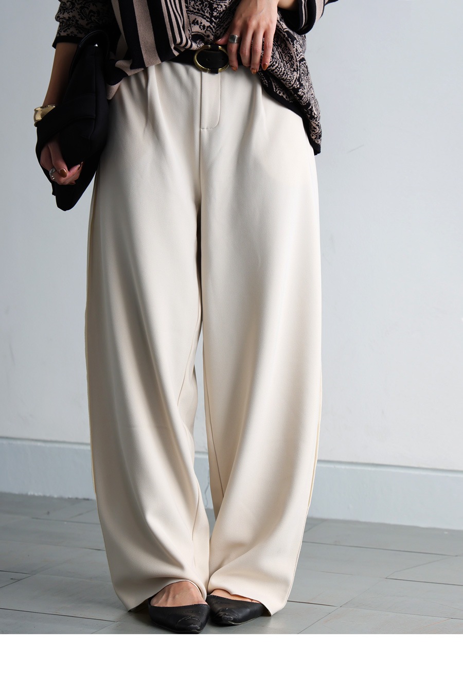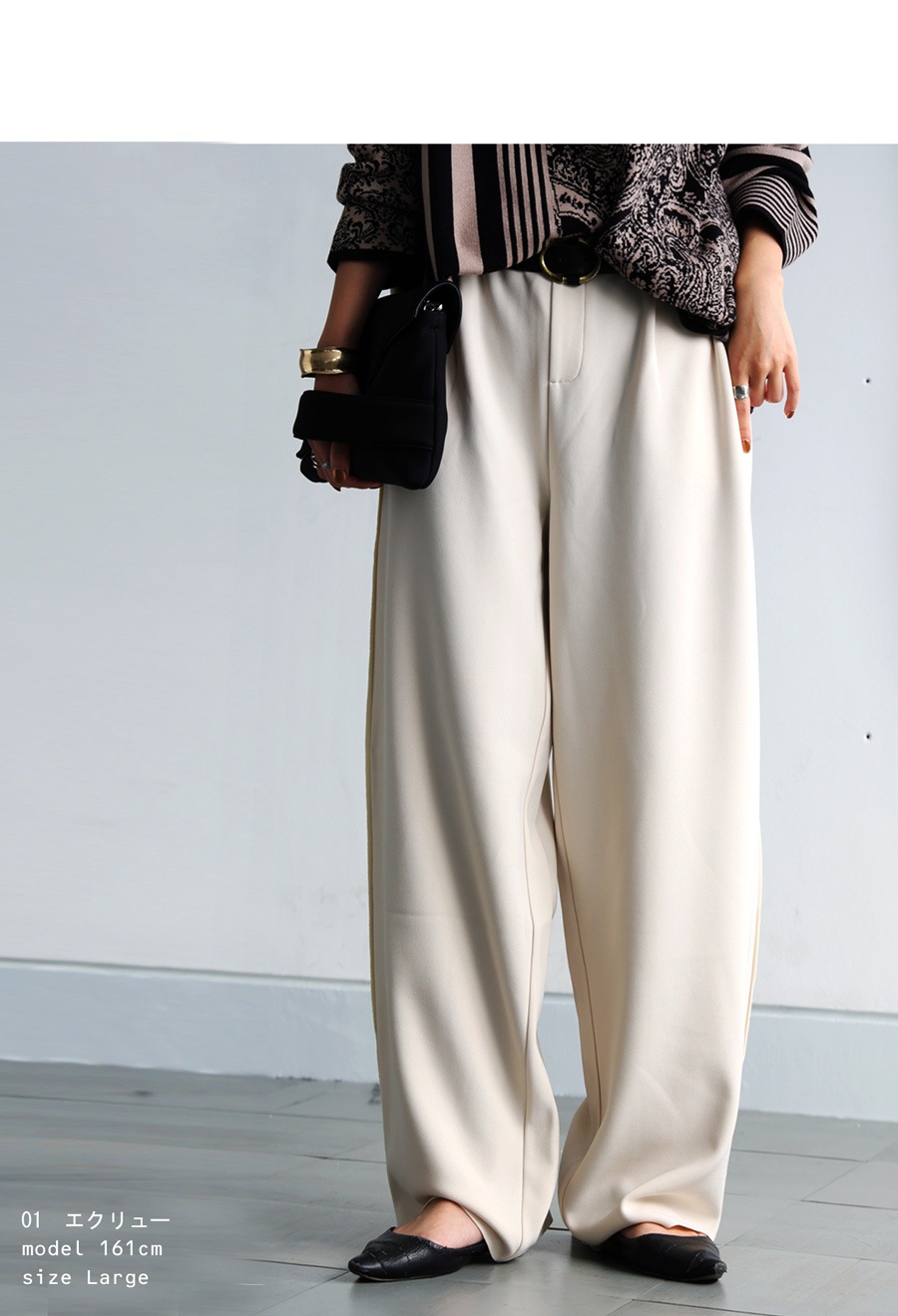 無地デザインにジョーゼット調の質感が高見えを演出し、ワイドすぎないテーパードシルエットが美脚ラインを叶えます。