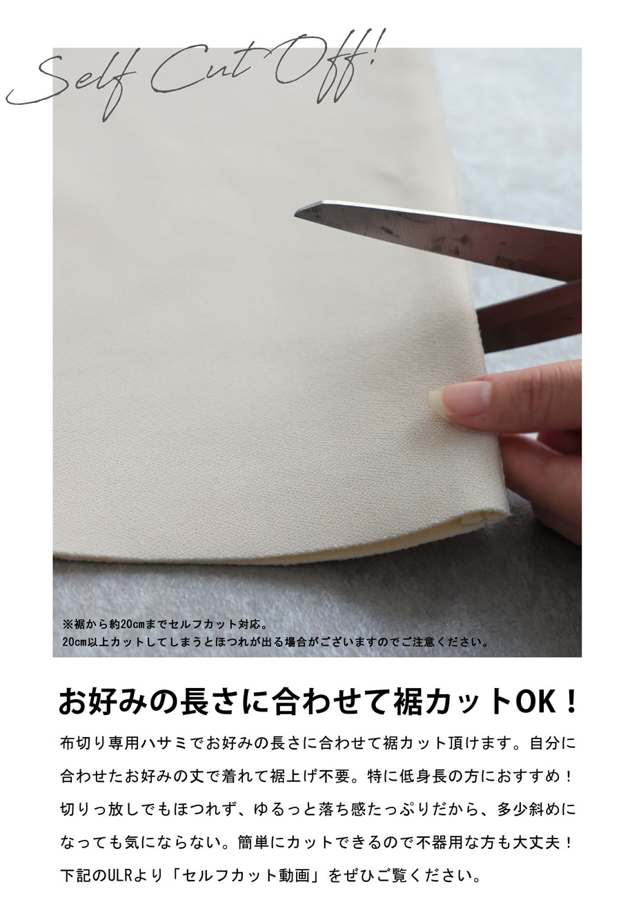 裾はセルフカット可能だから、自分の身長や好みに合わせて丈感を調整でき、低身長さんにも嬉しいポイント。