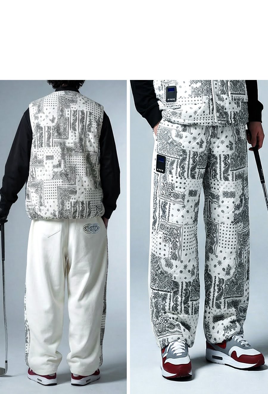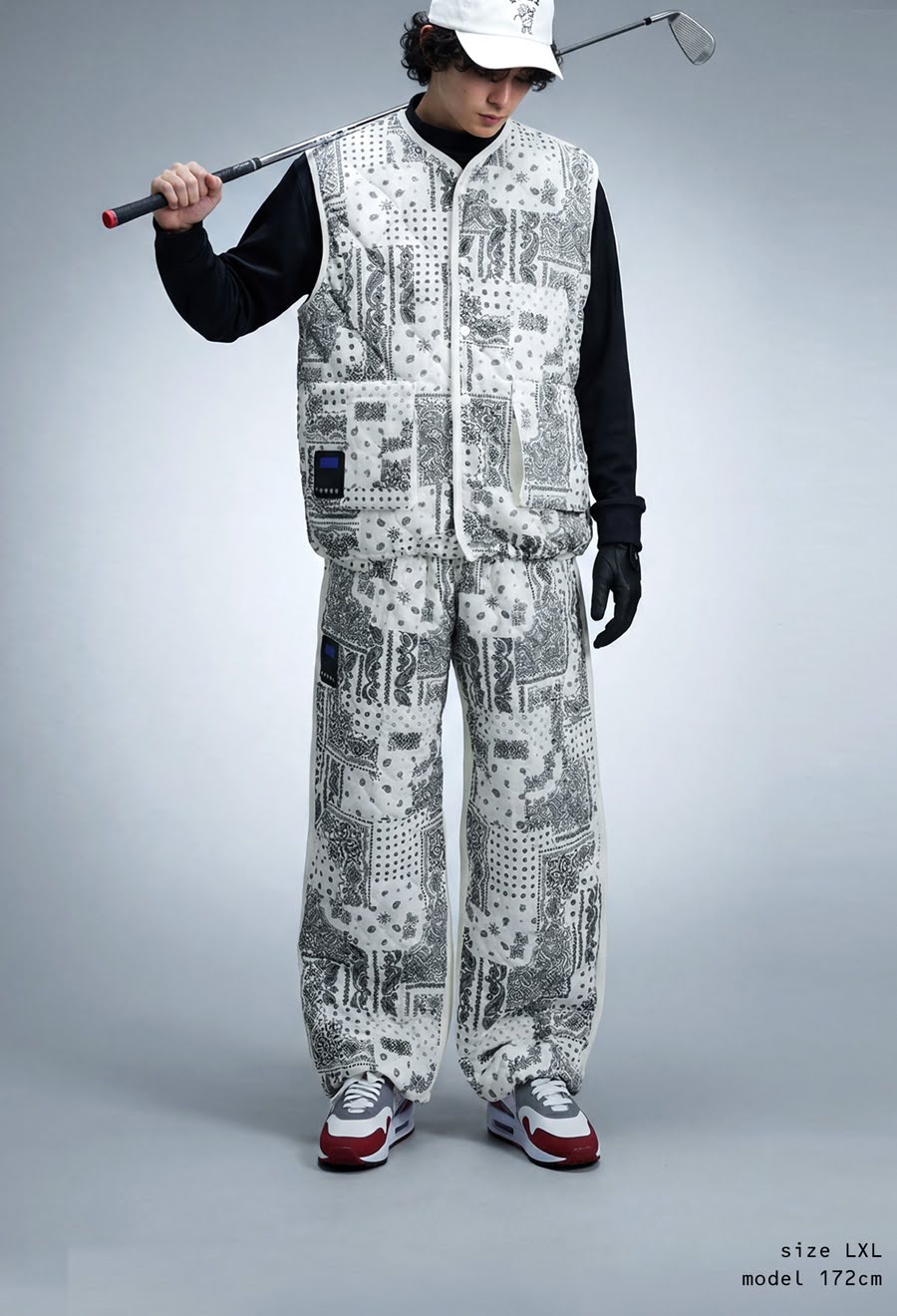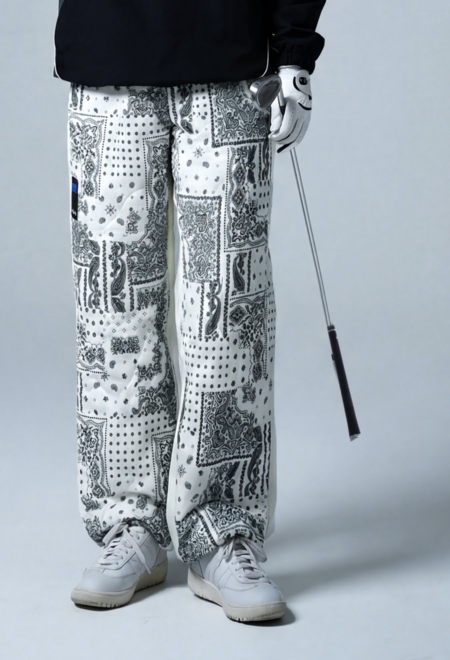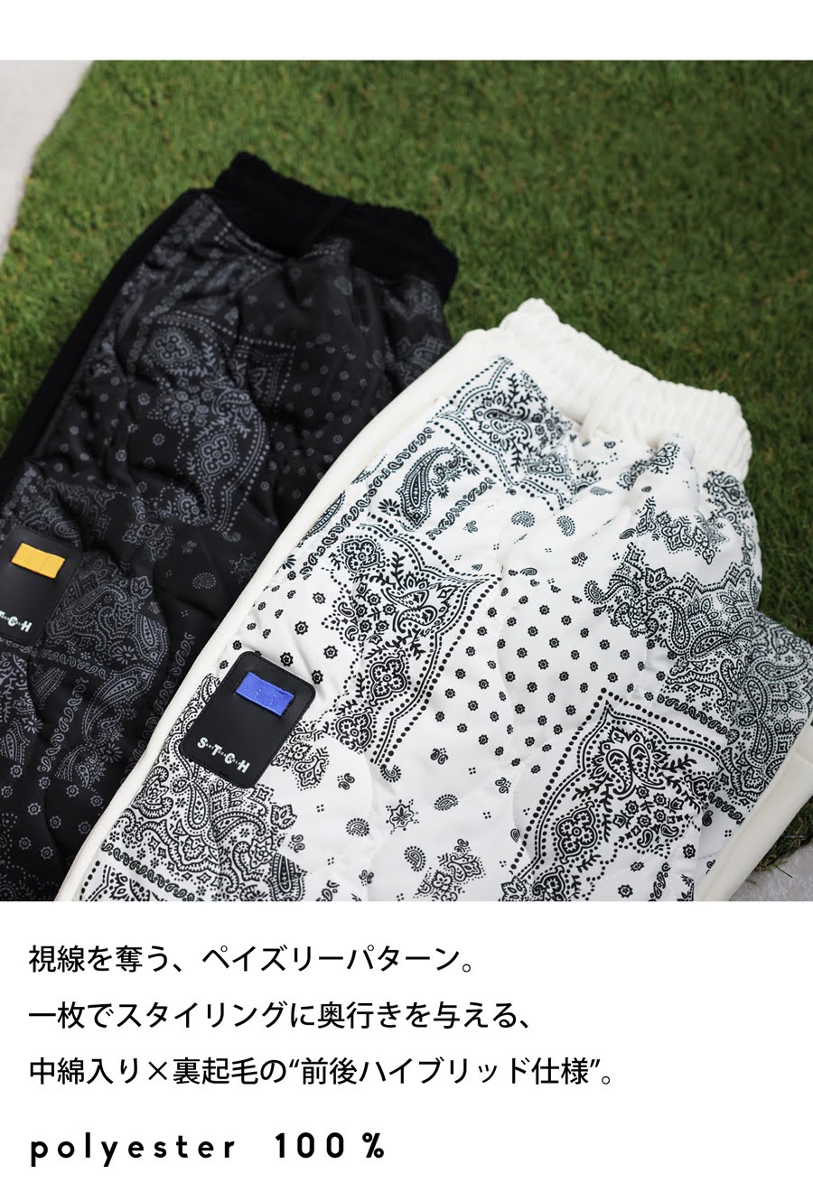 存在感のあるペイズリー柄が印象的な、メンズ仕様のワイドシルエット中綿パンツです。