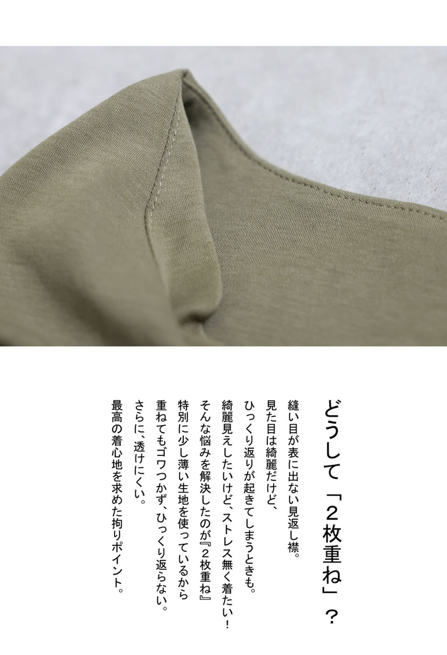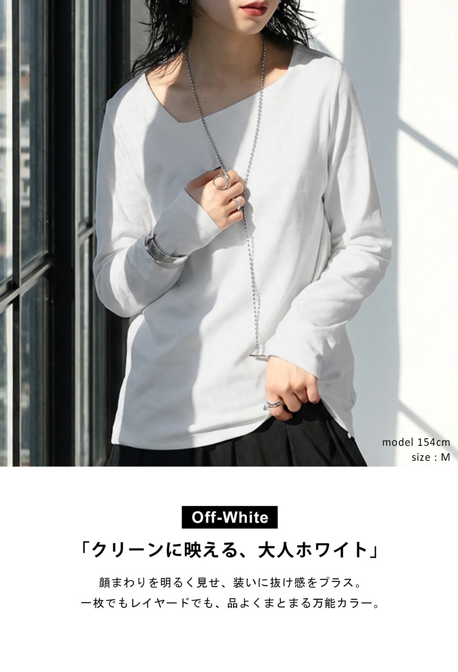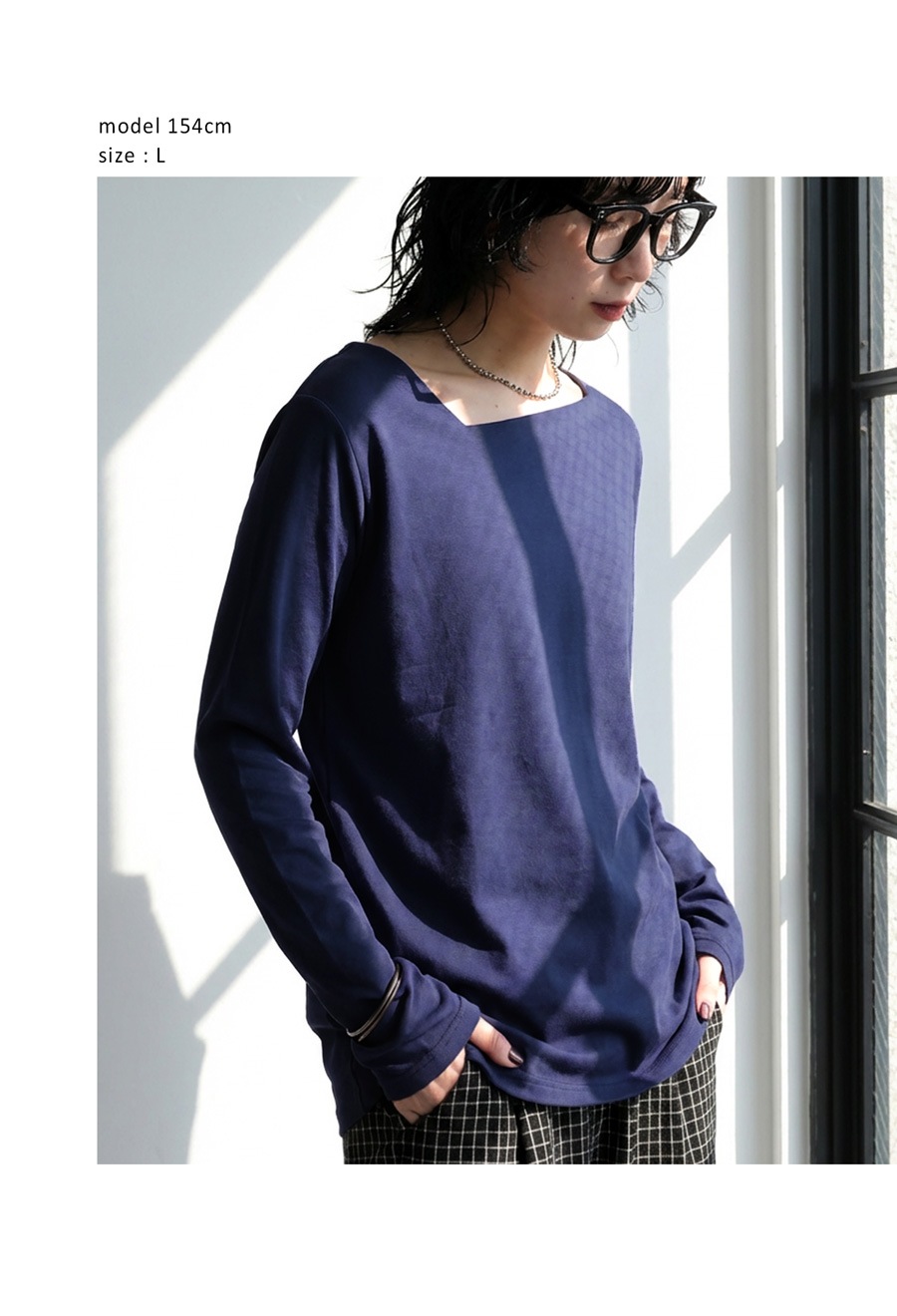 身体のラインを拾いすぎない形状で、インナーとしても一枚着としても活躍します。