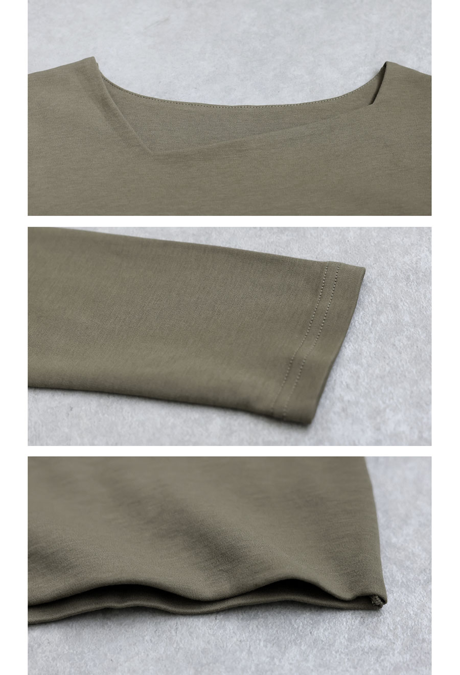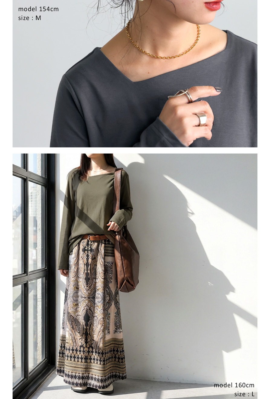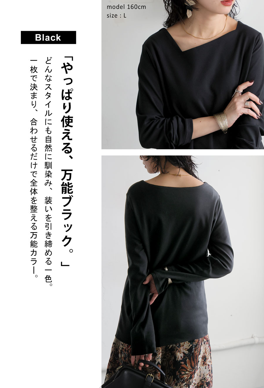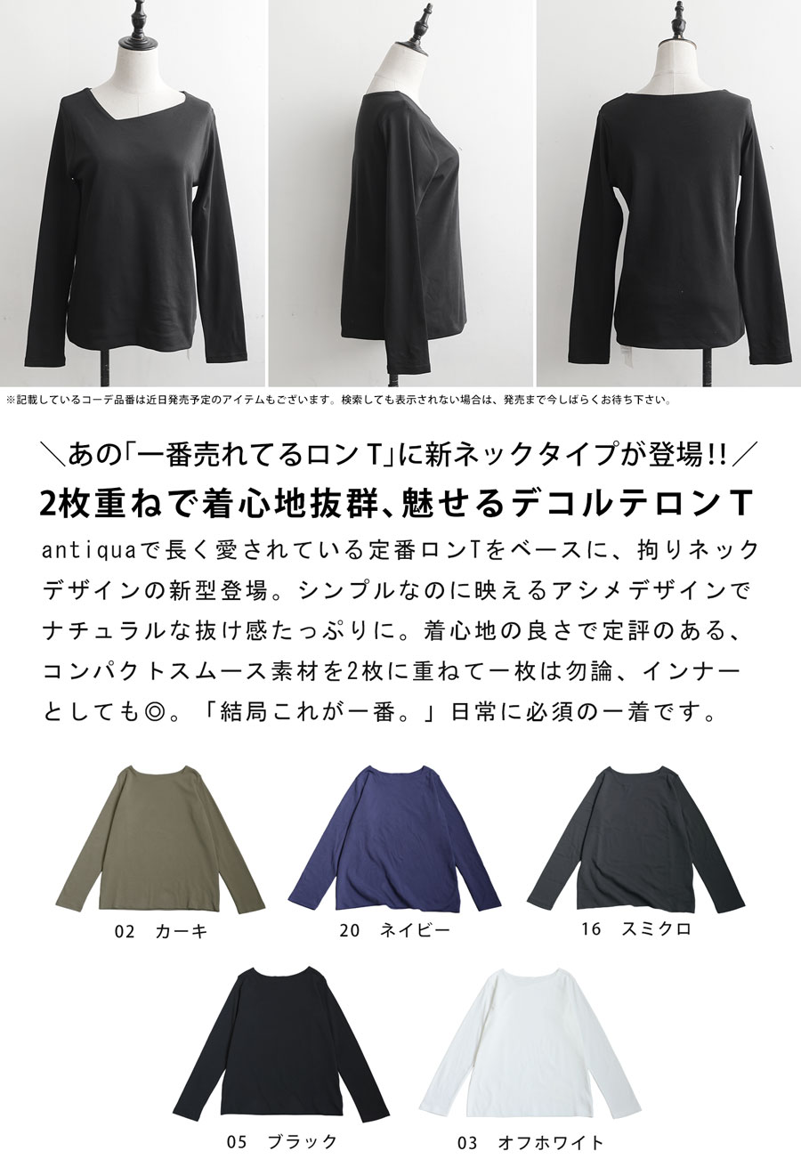 身体のラインを拾いすぎない形状で、インナーとしても一枚着としても活躍します。