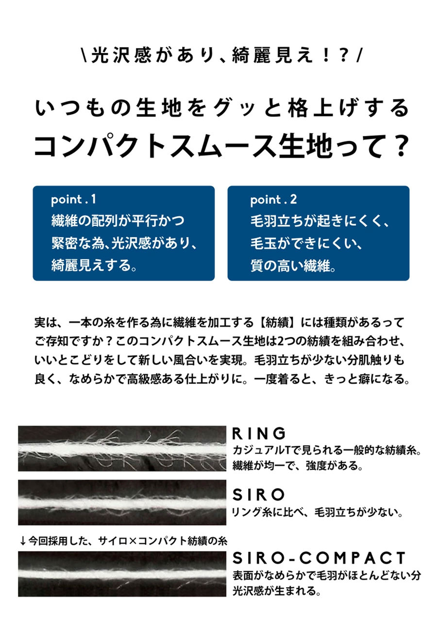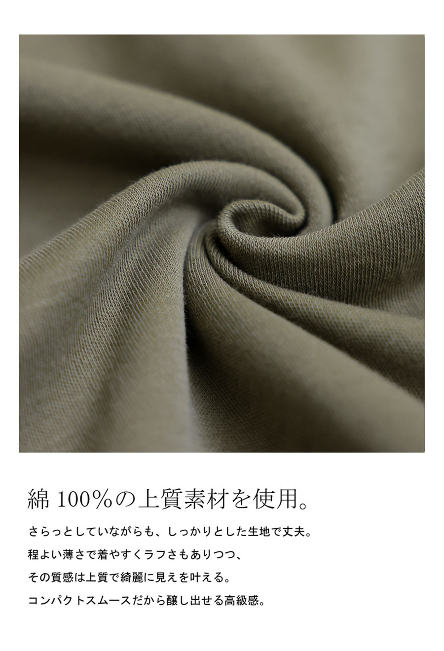 素材には綿(コットン)100%のコンパクトスムース生地を使用し、光沢感となめらかな肌触りを両立しています。