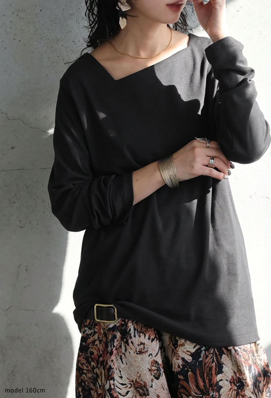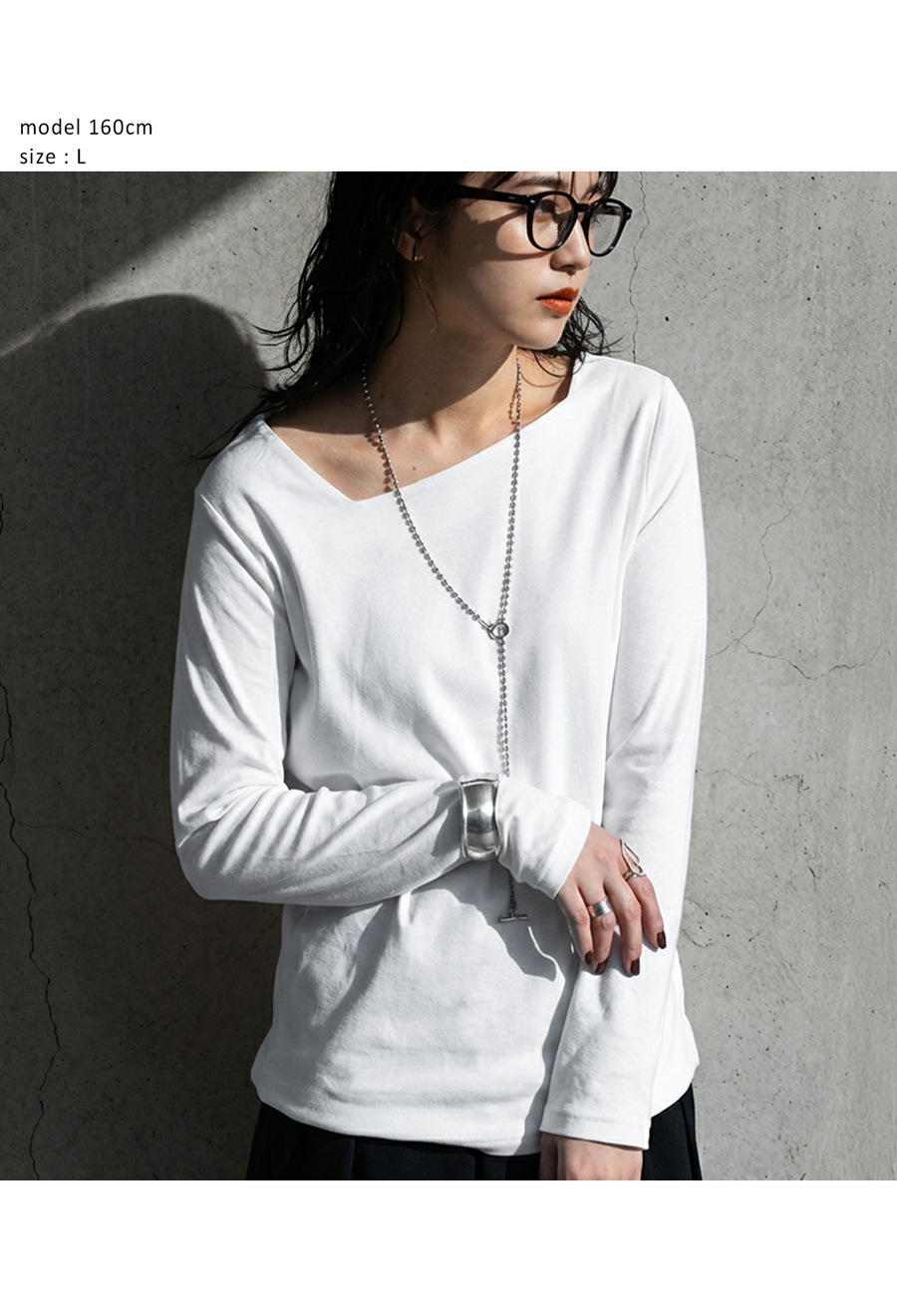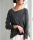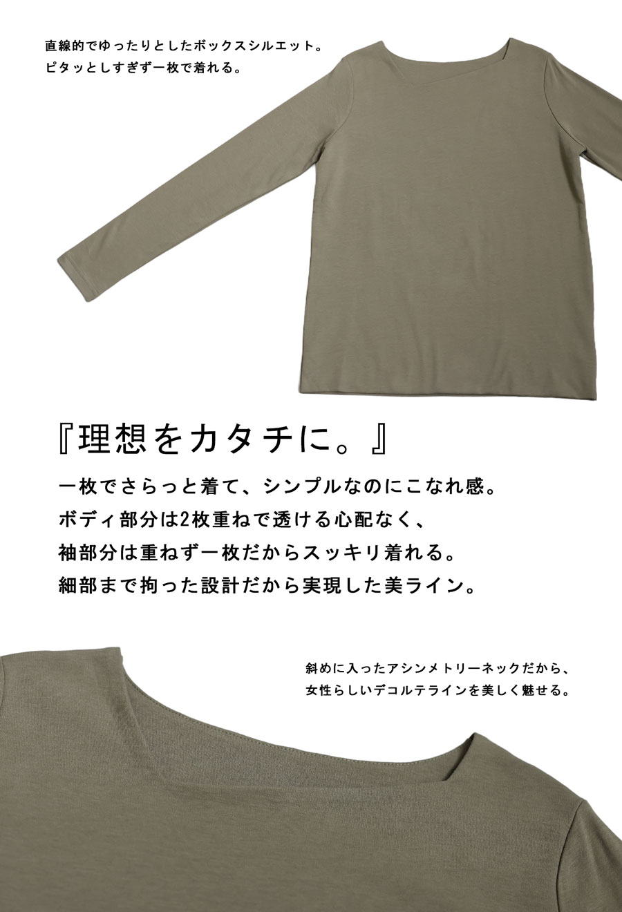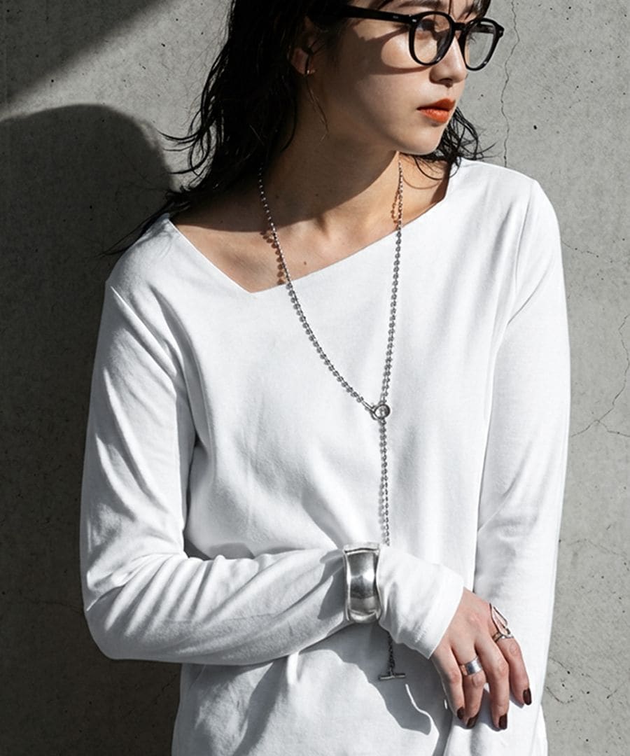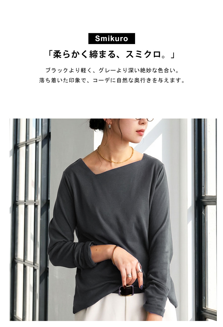 斜めに入ったアシンメトリーデザインのネックラインが、首元に自然な動きを与えるカットソーです。