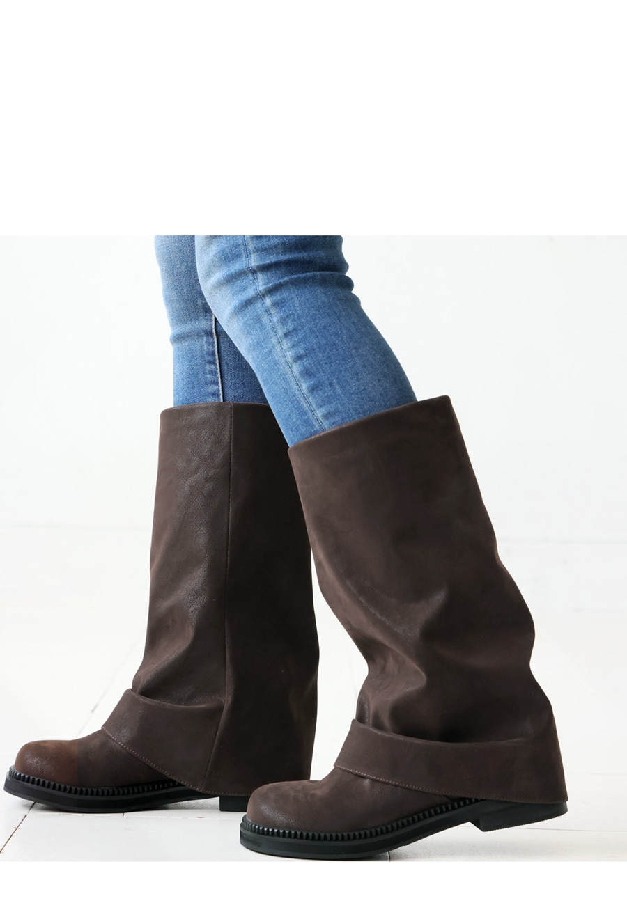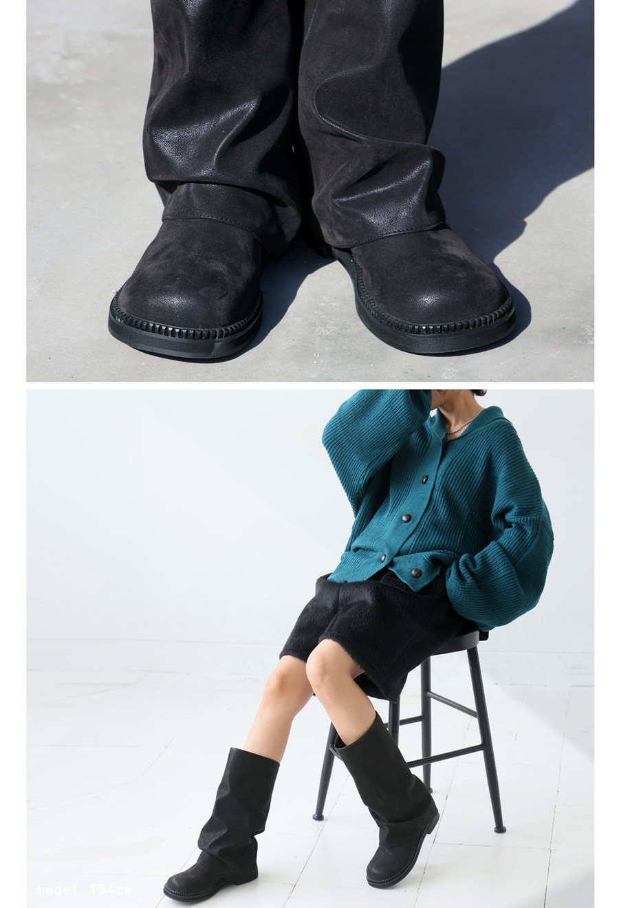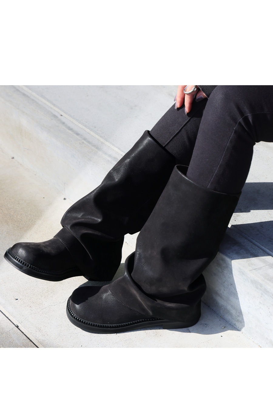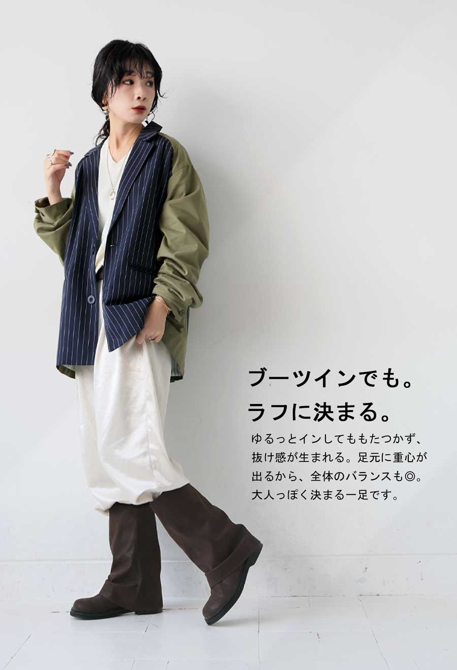折り返したようなシルエットが足元に自然な抜け感を与え、どんなコーデにもなじむ仕上がりに。