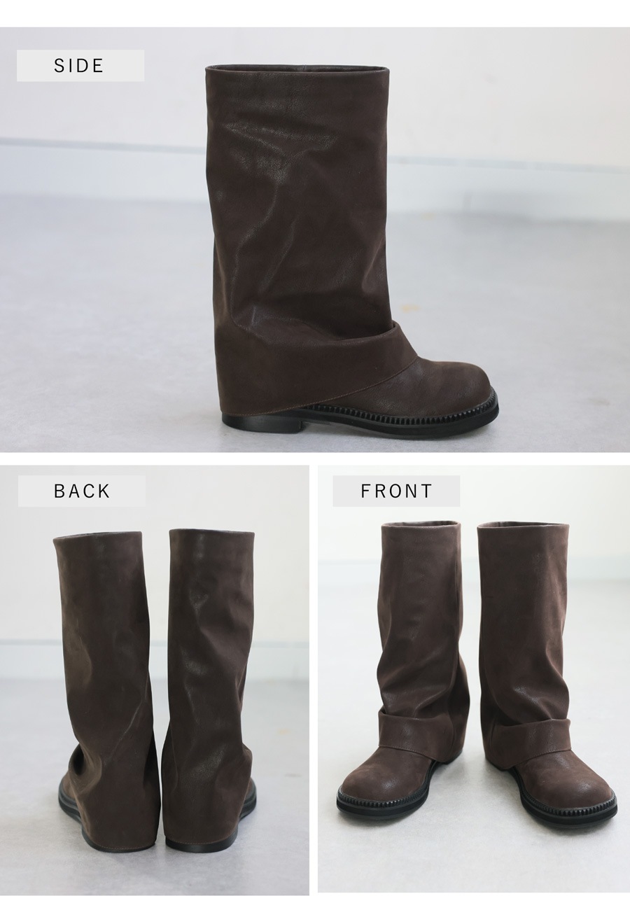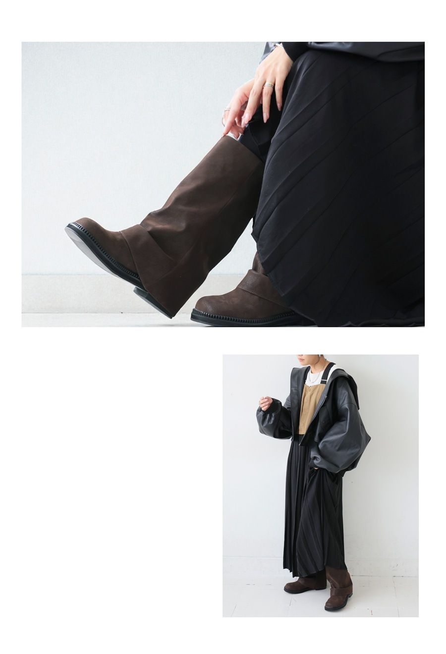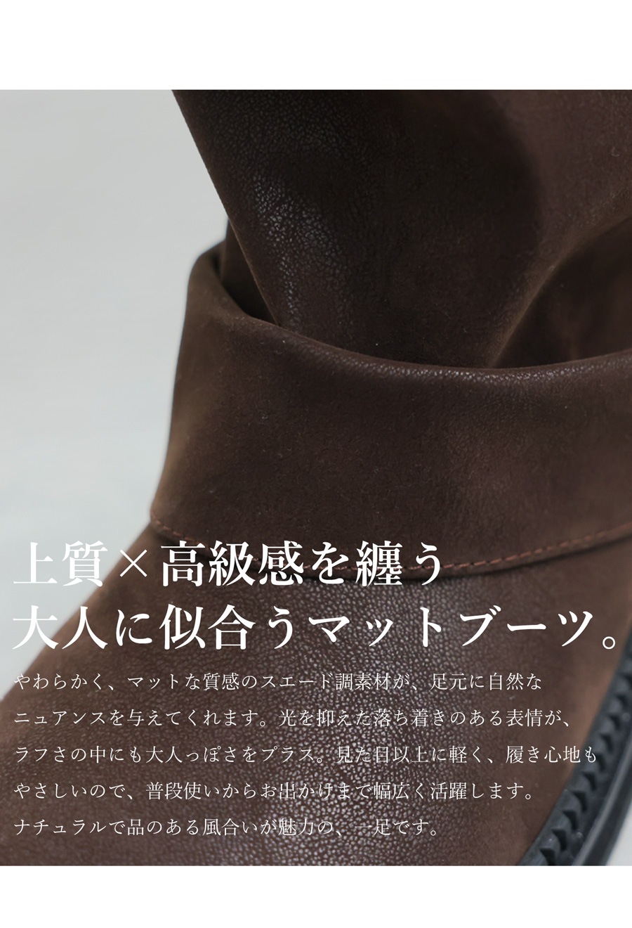 くしゅっとした立体フォルムとマット質感が魅力の、スエード調ロングブーツ。