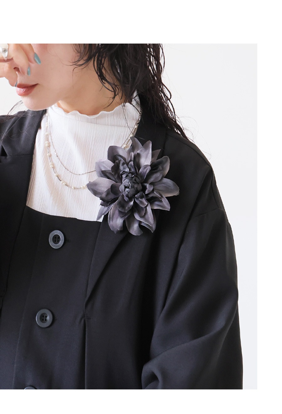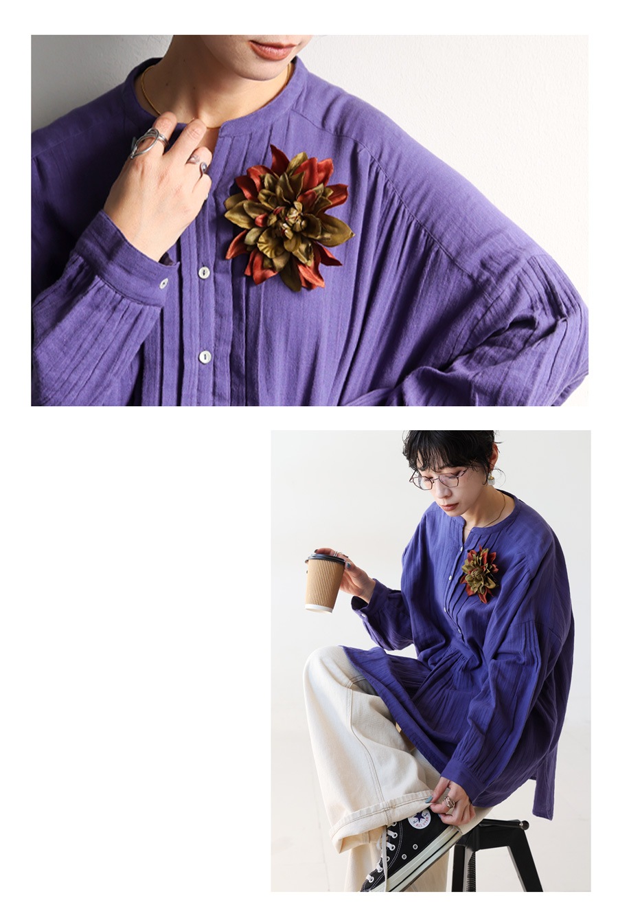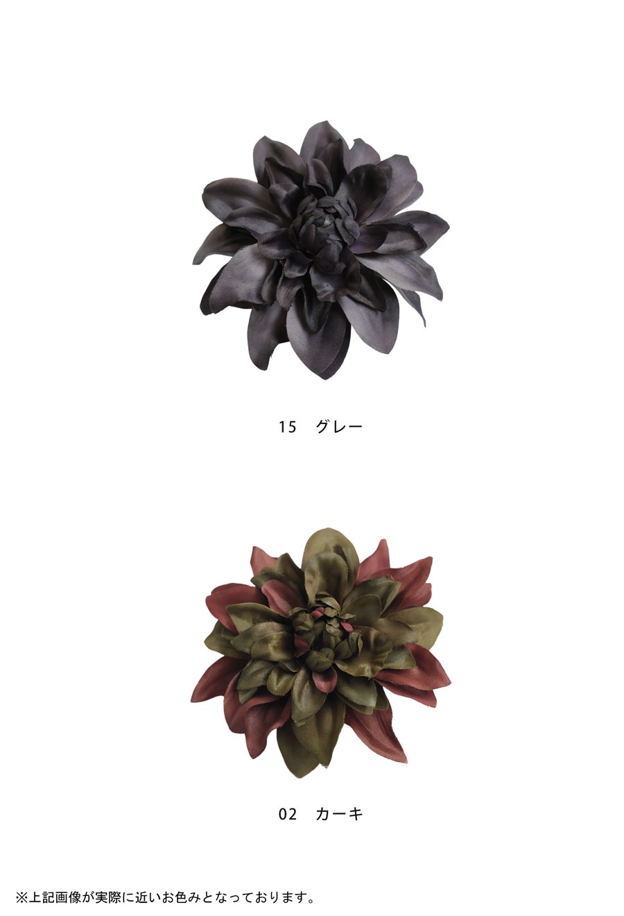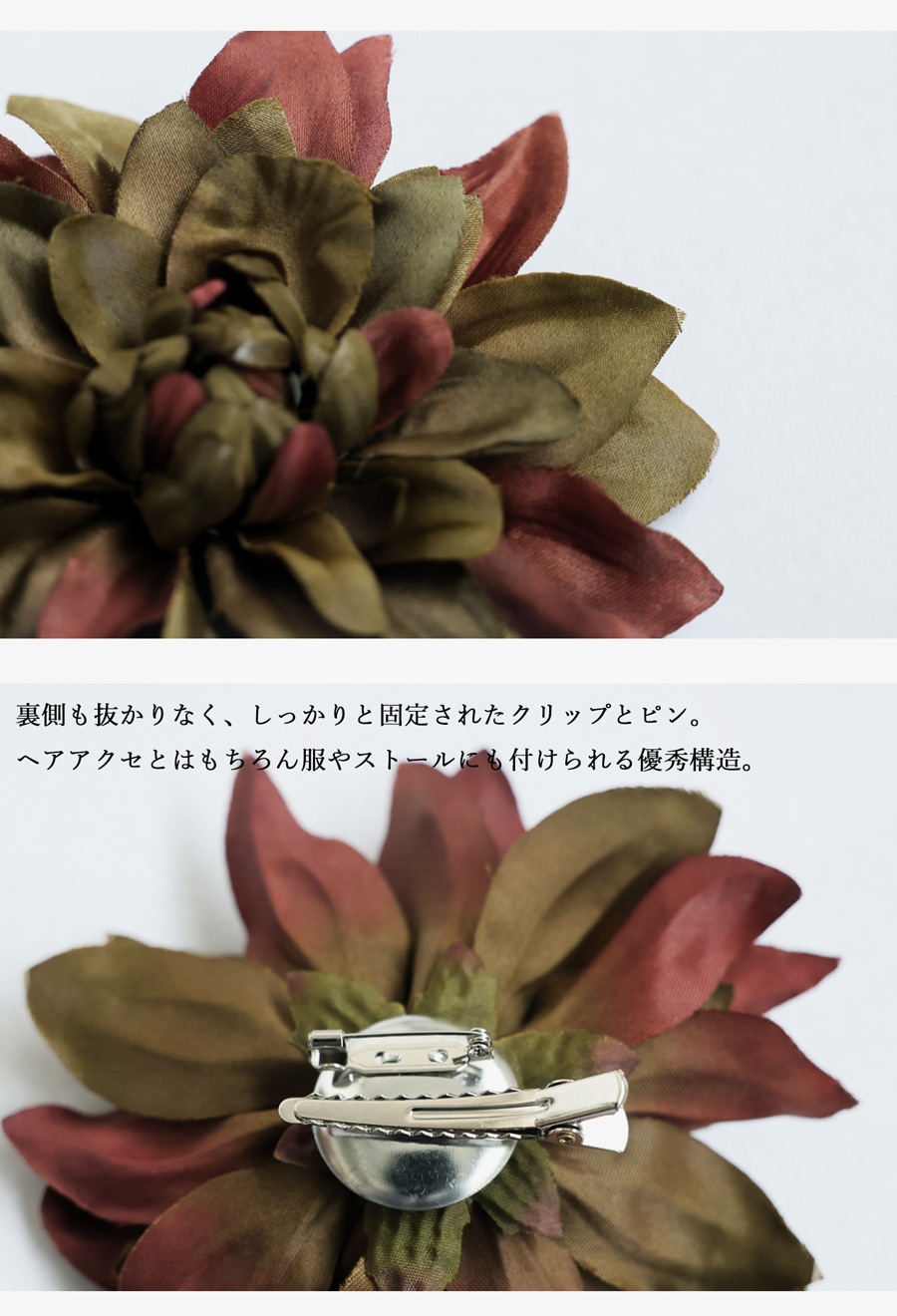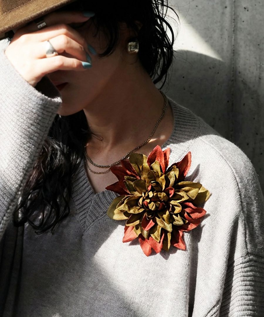 形状は立体的でふんわりとした花のフォルムが特徴。クリップとピンの2WAY仕様で、服・ストール・バッグ・ヘアアレンジなど多用途に使える優れものです。