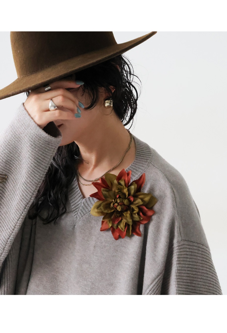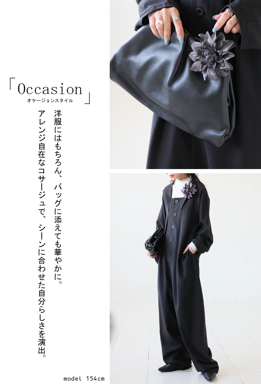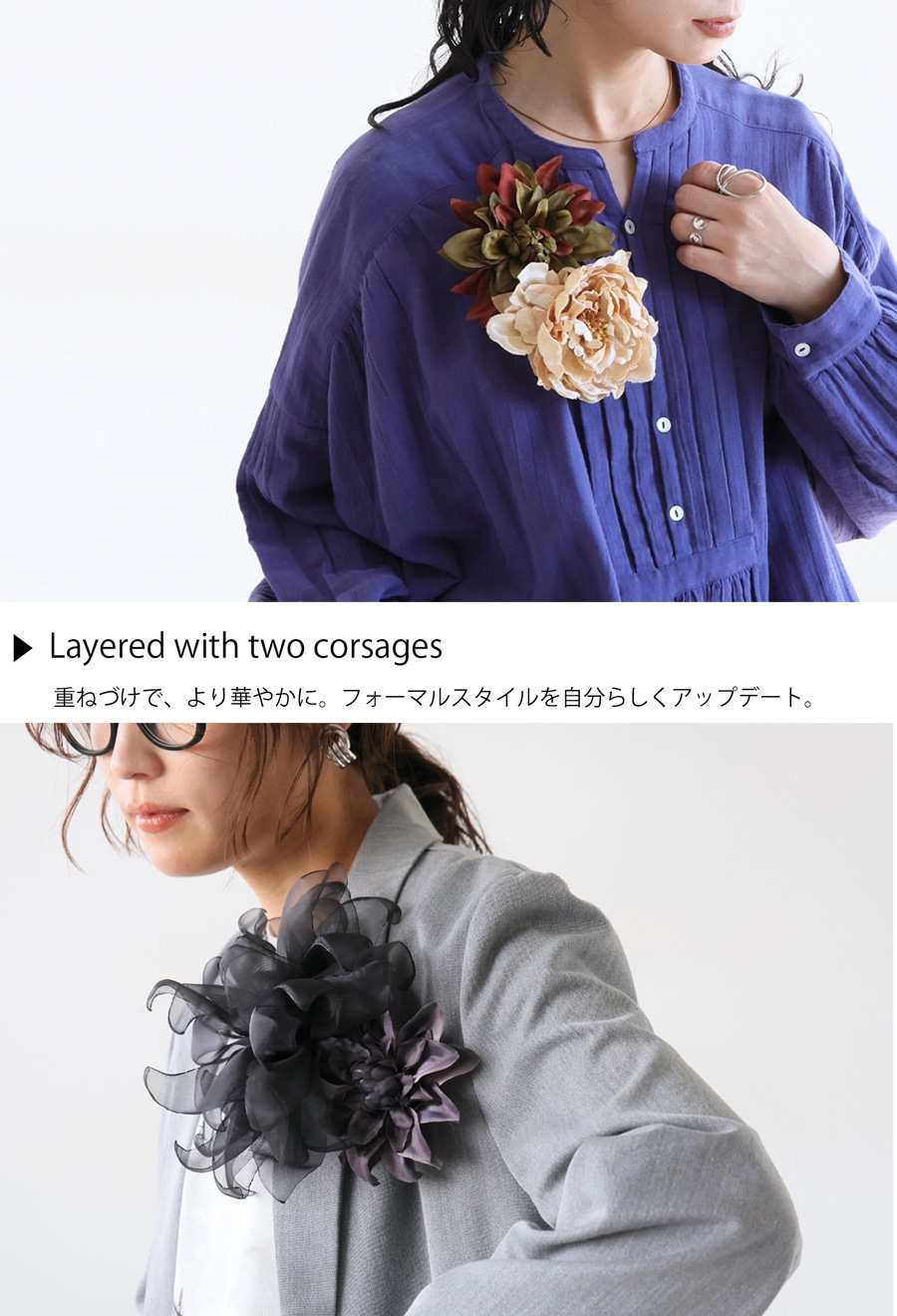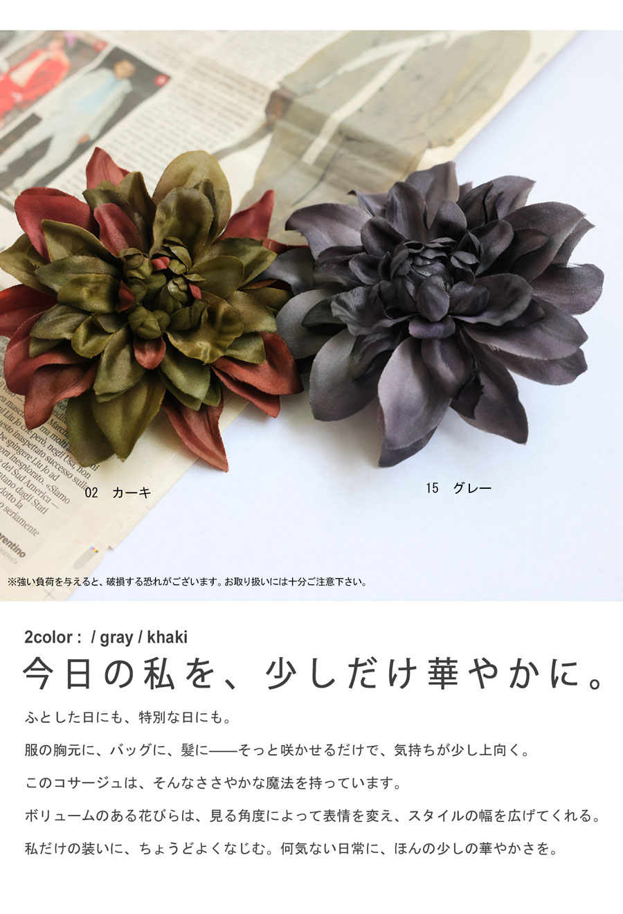 形状は立体的でふんわりとした花のフォルムが特徴。クリップとピンの2WAY仕様で、服・ストール・バッグ・ヘアアレンジなど多用途に使える優れものです。