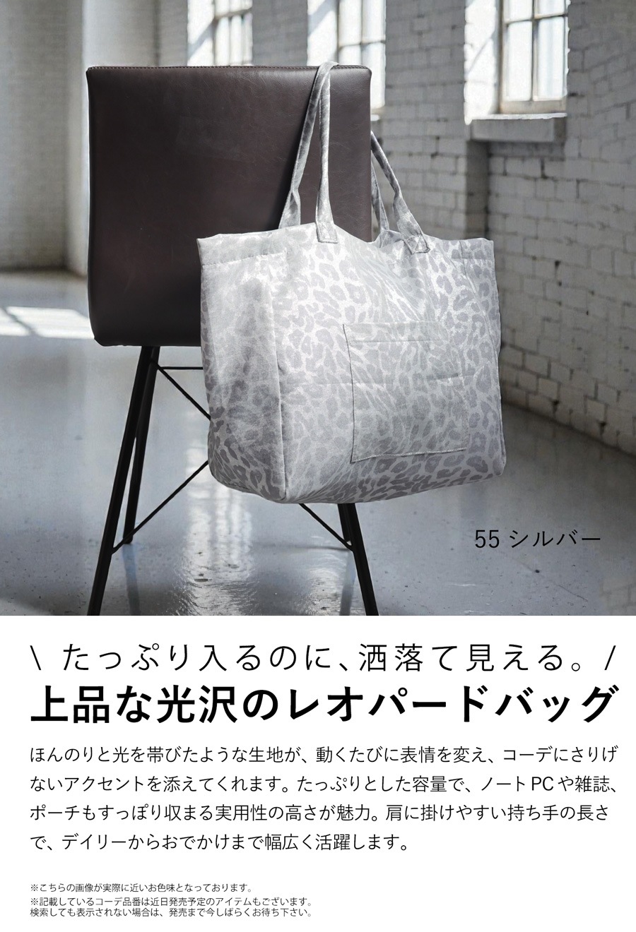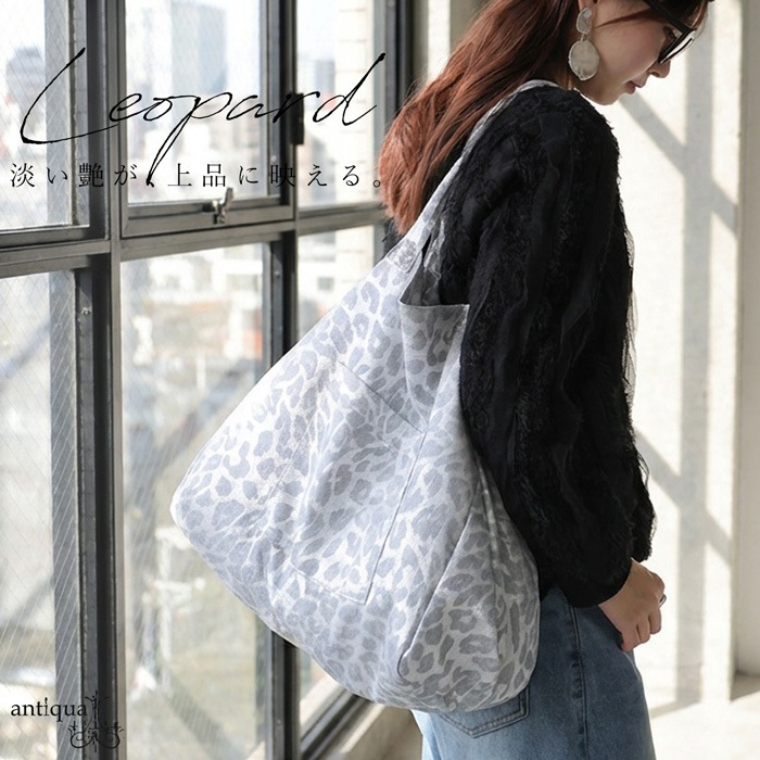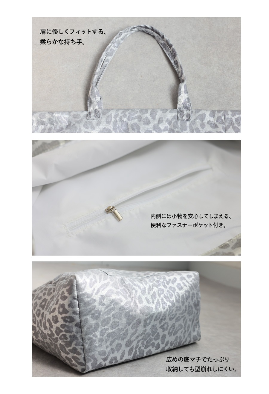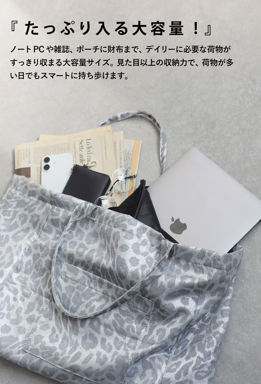 淡い光沢が魅力のレオパード柄が上品な印象を添える、大人顔のトートバッグです。