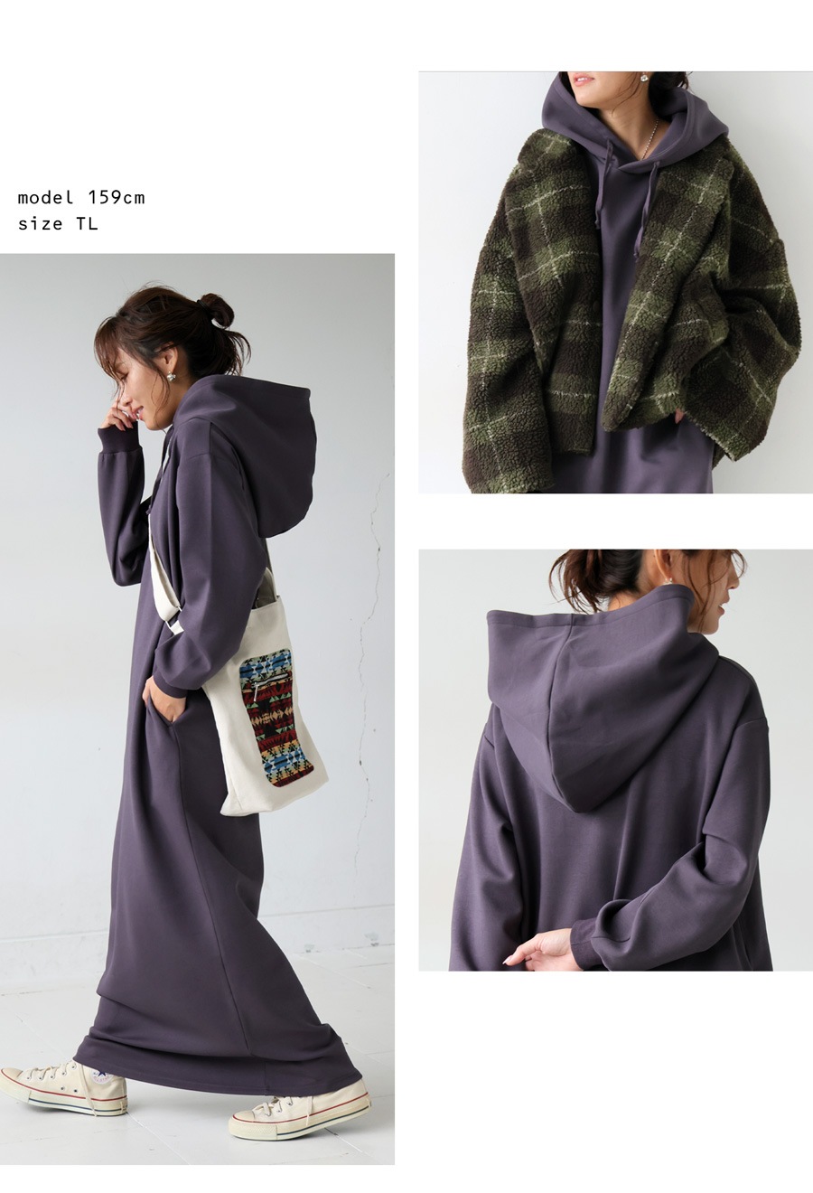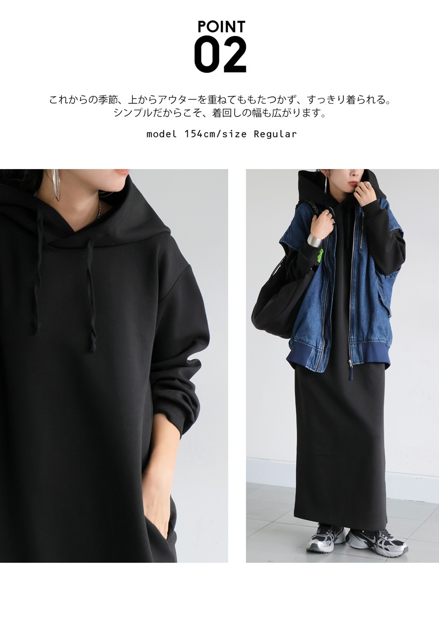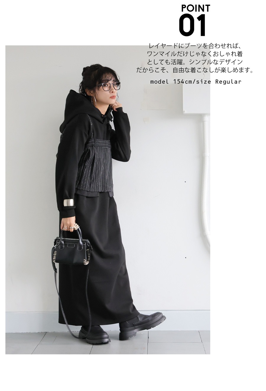 丈感は足元までカバーするロング丈で、レギンスやパンツとのレイヤードにもぴったりです。