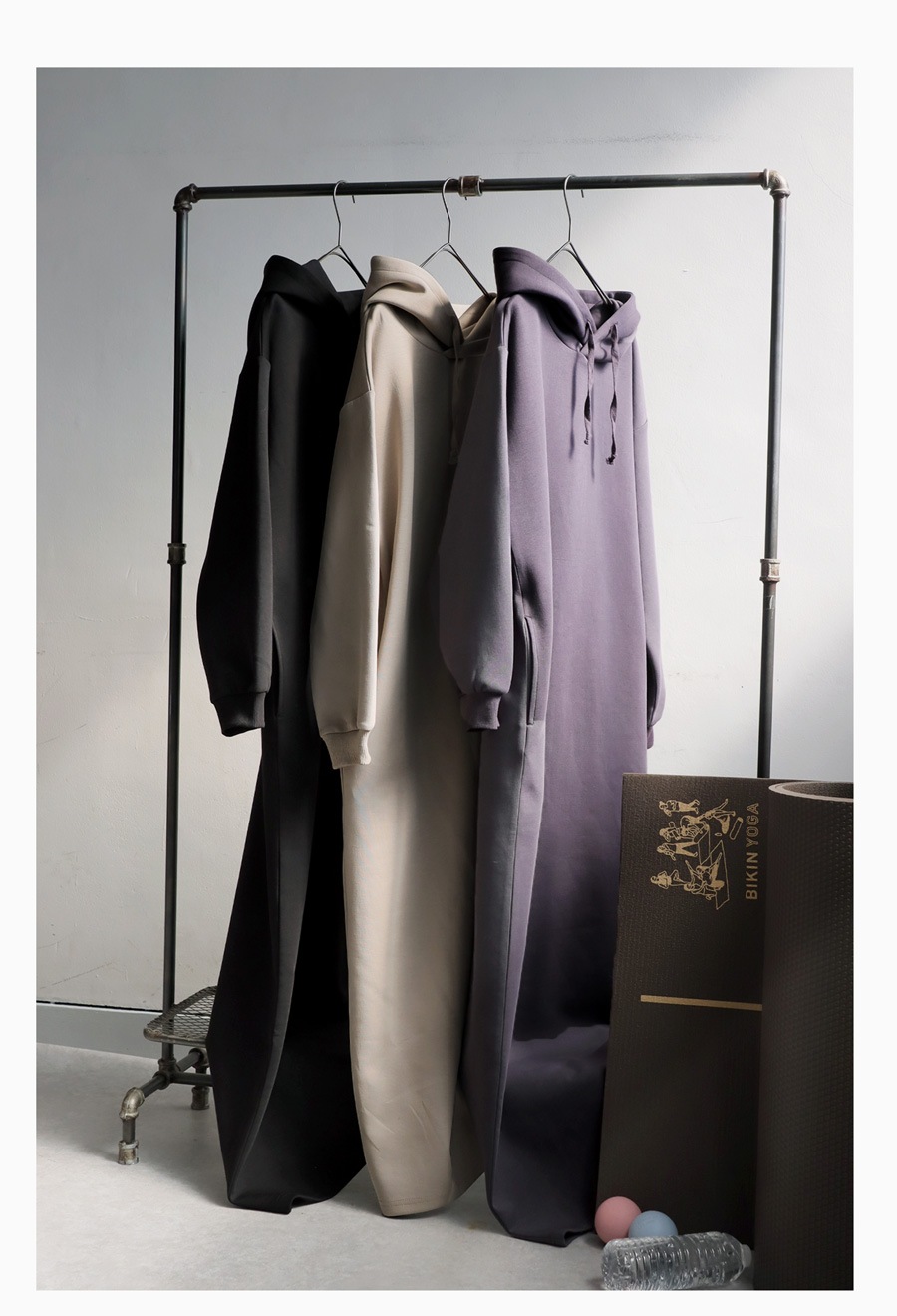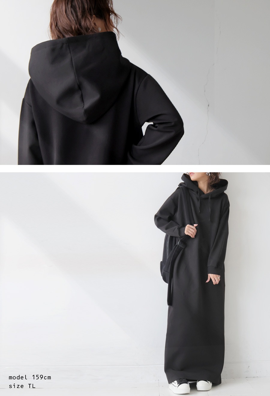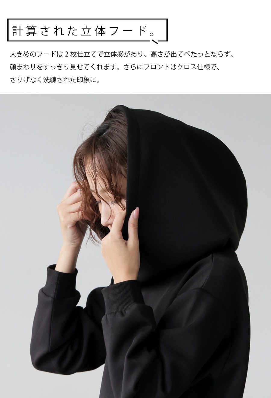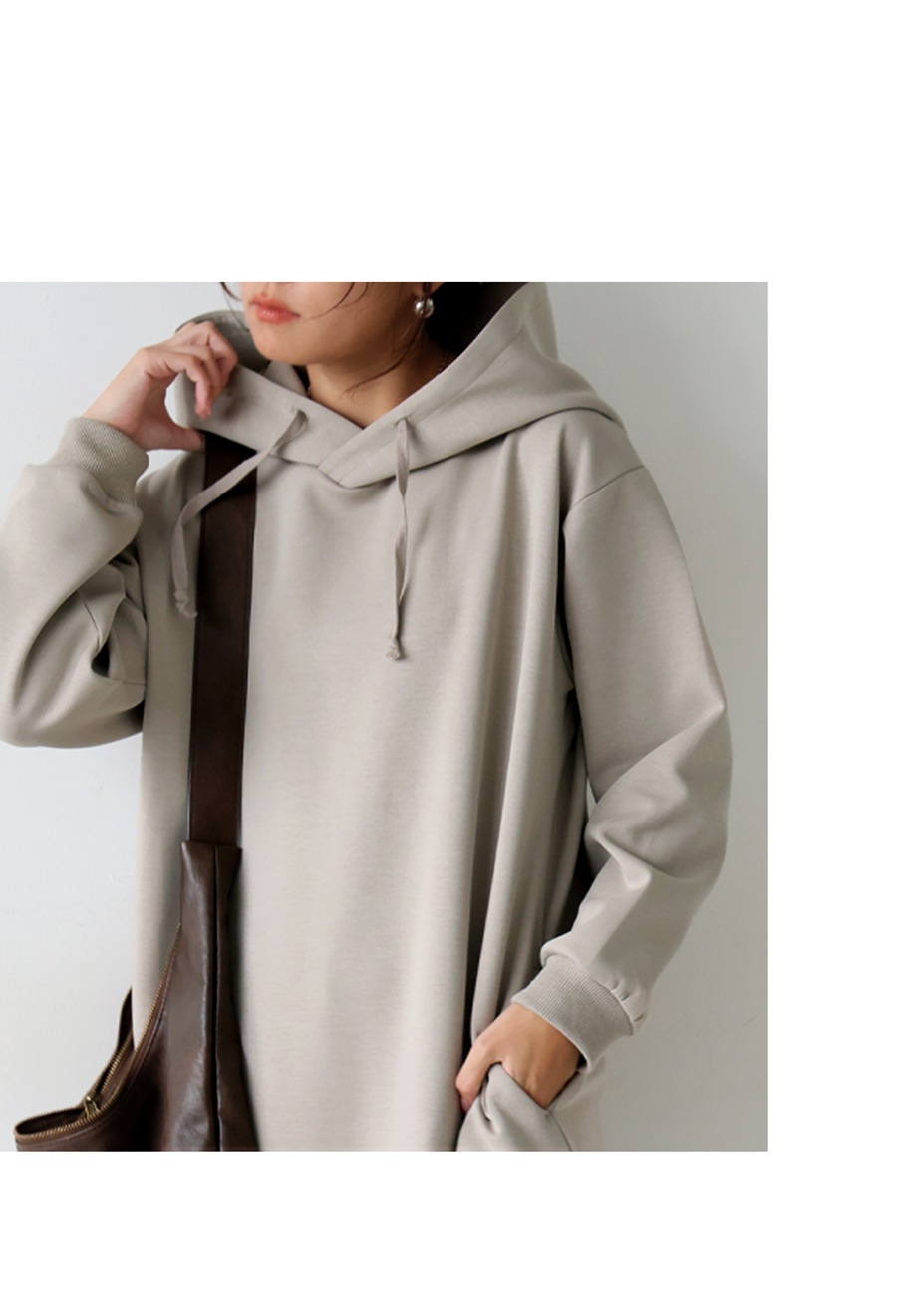 antiquaとコラボした、洗練された立体フードと縦長シルエットが魅力のロングワンピース。