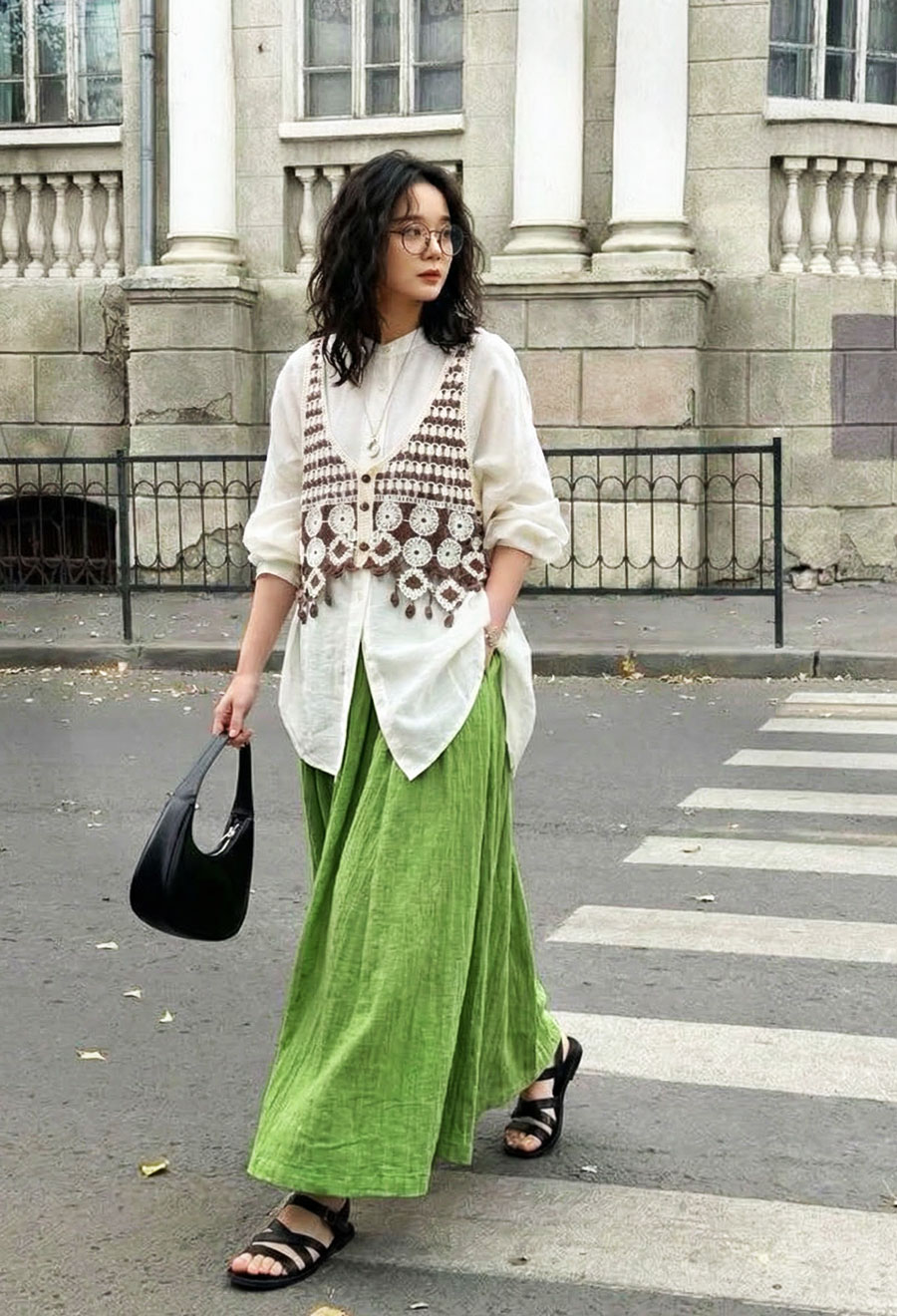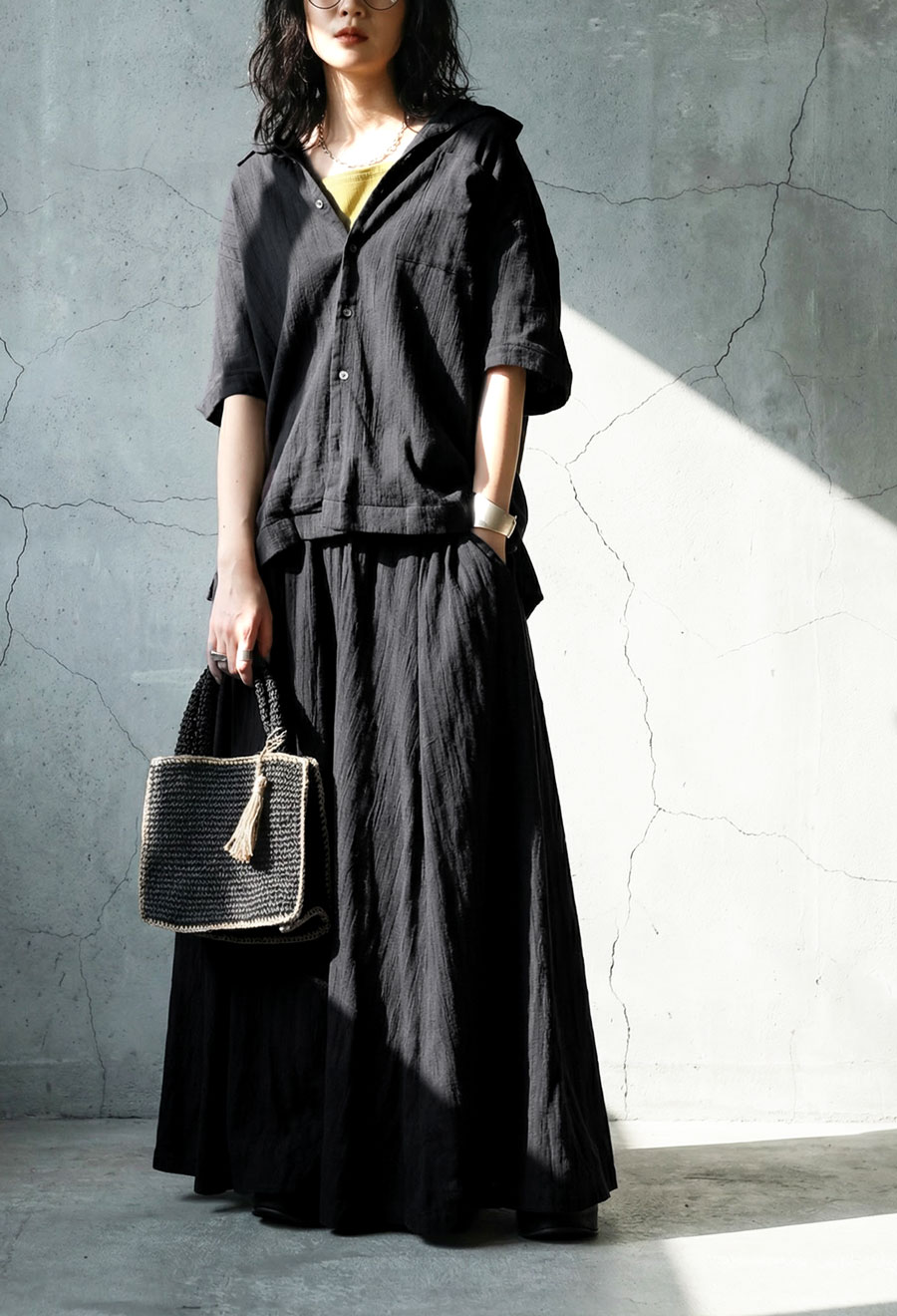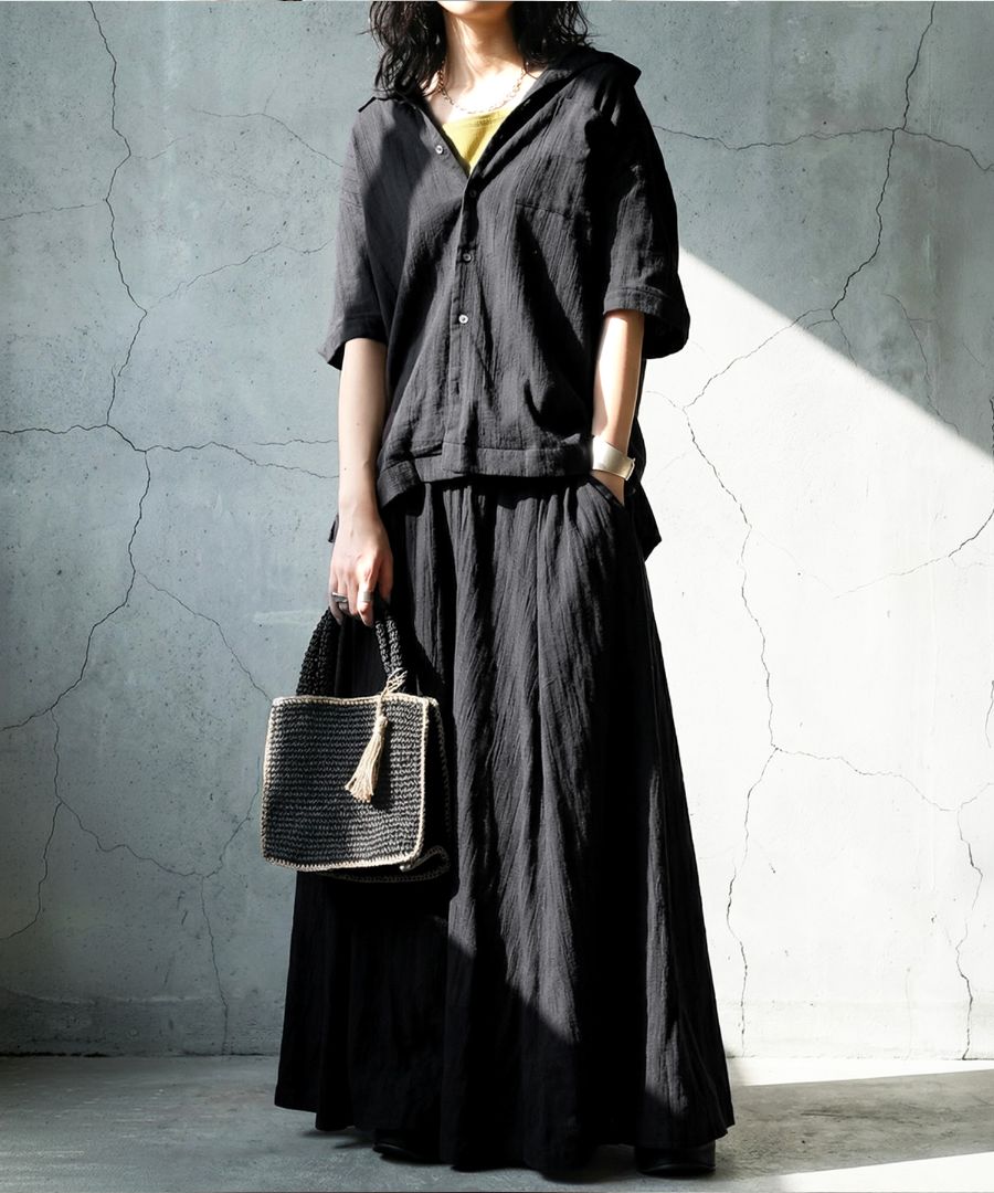 ロングな丈感が縦ラインを強調し、ゆったりとしながらもすっきりとした印象に仕上げました。