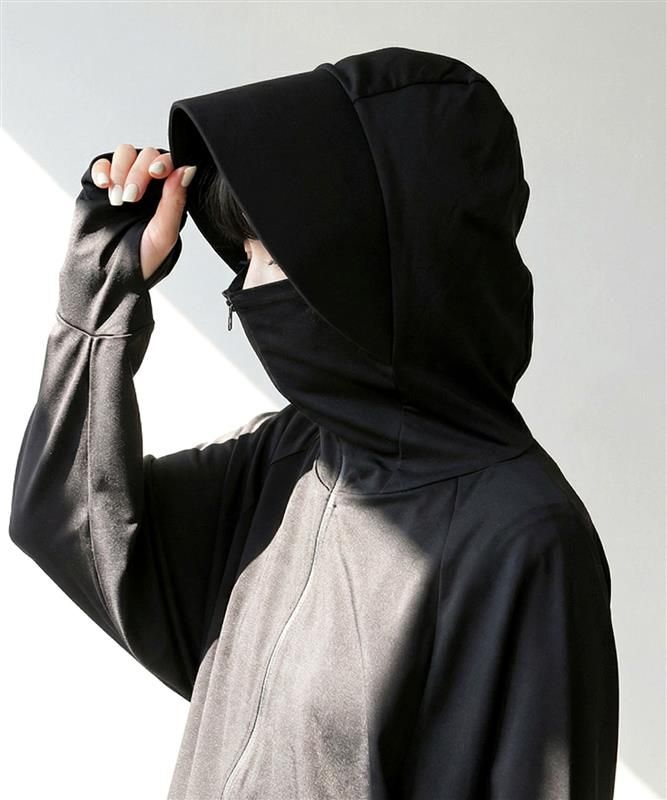 ネックラインから続く立ち上がりのフード付きデザインとフェイスカバー付き仕様で、顔まわりまでしっかりガード。