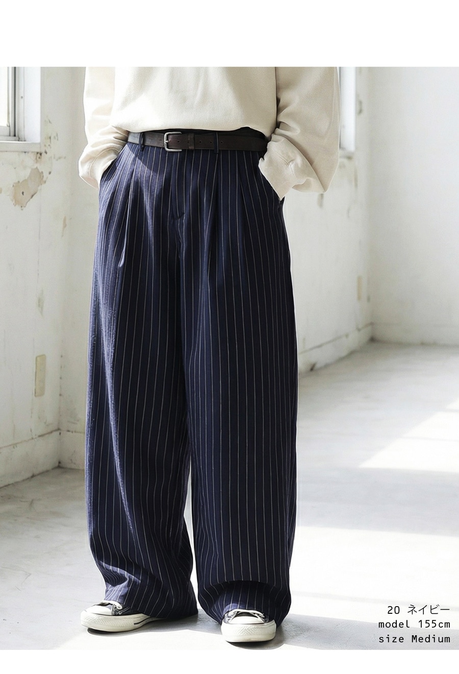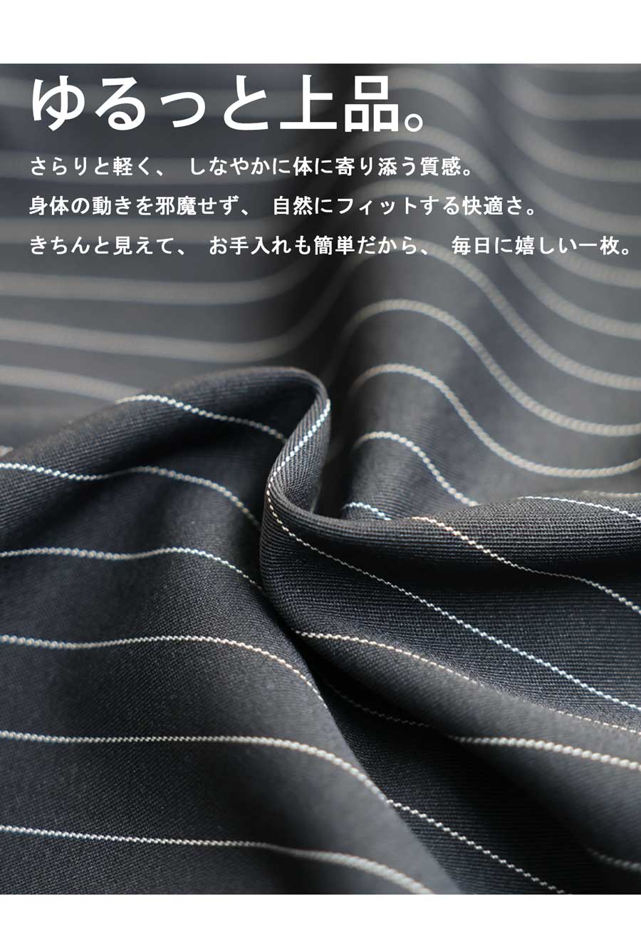 落ち感のあるワイドシルエットが、脚のラインを拾わず自然に体型をカバーしてくれます。