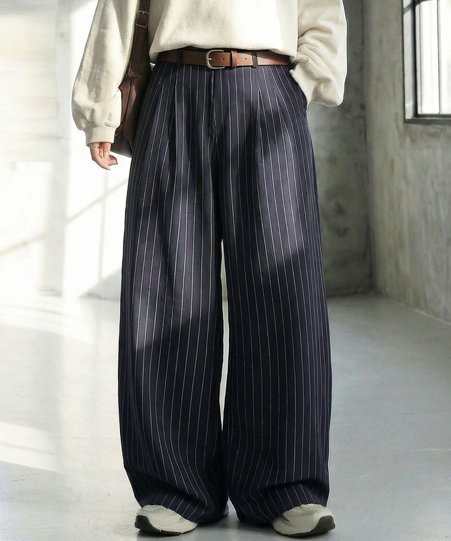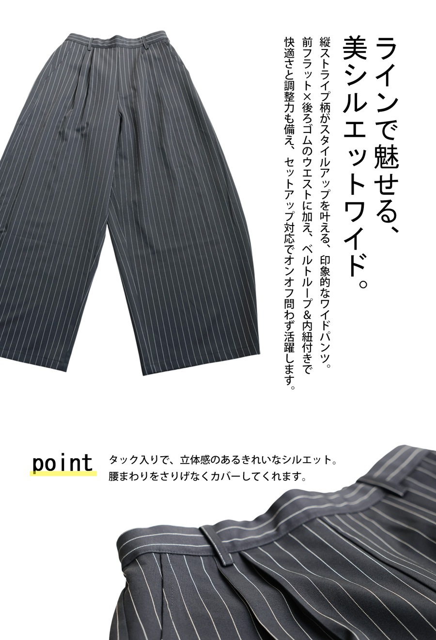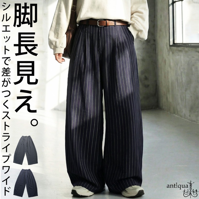 縦のラインをすっきり見せてくれるストライプ柄がポイントのワイドパンツです。