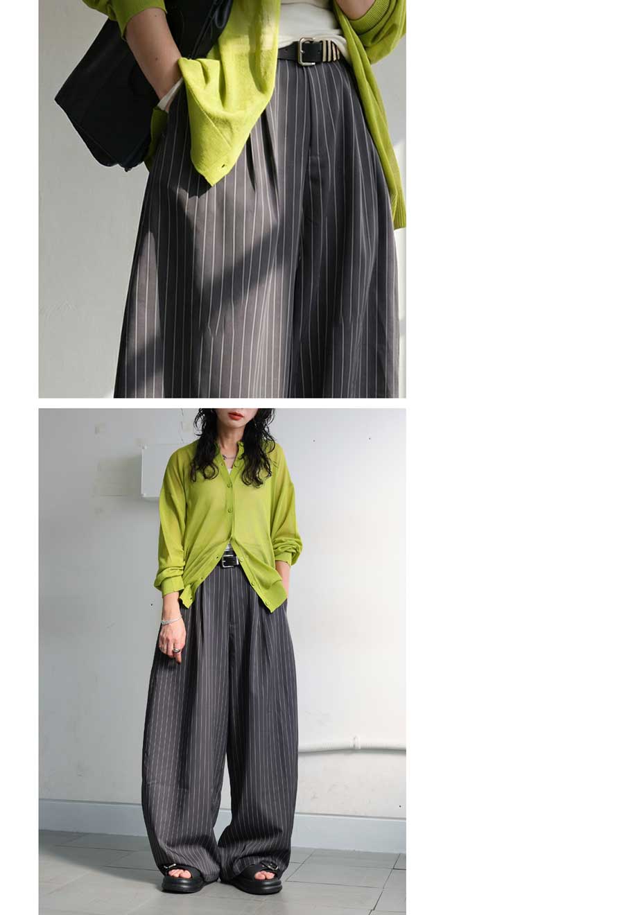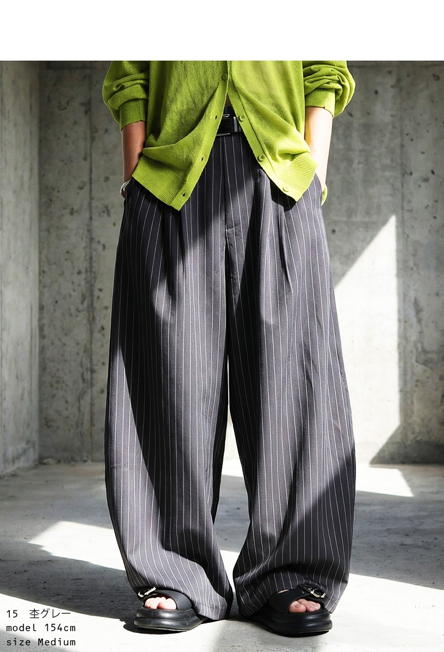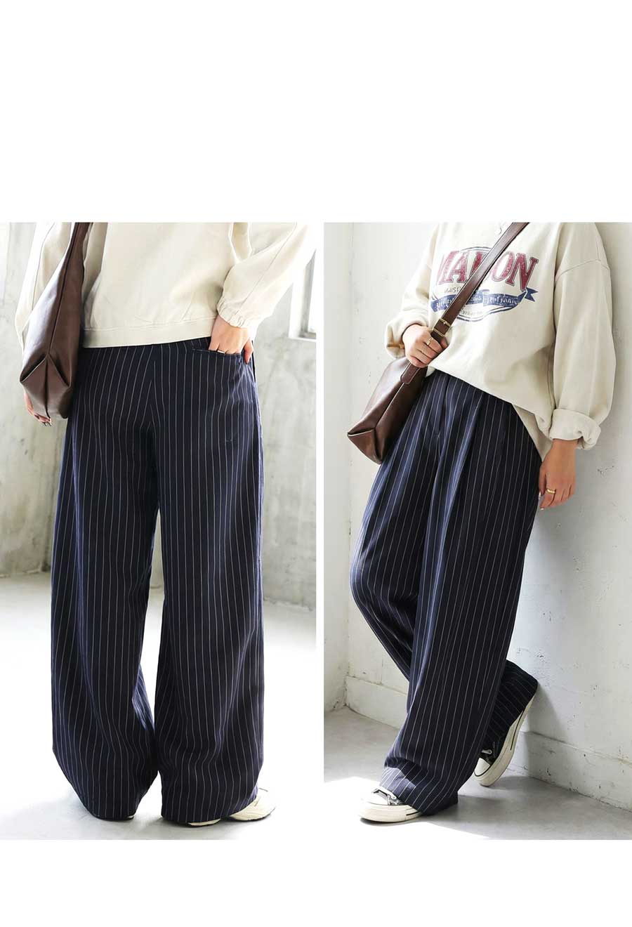 縦のラインをすっきり見せてくれるストライプ柄がポイントのワイドパンツです。