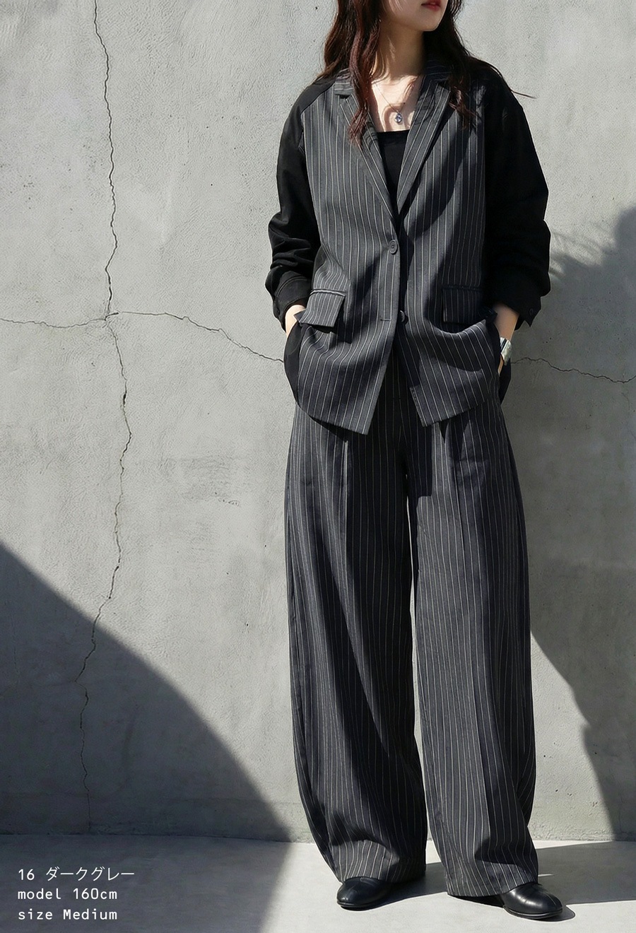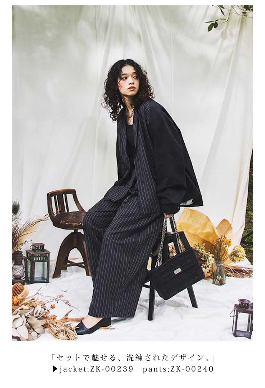 さらに、同素材の別売りジャケット(品番:ZK-00239)とセットアップとして着用すれば、より上品でモードな印象に仕上がります。