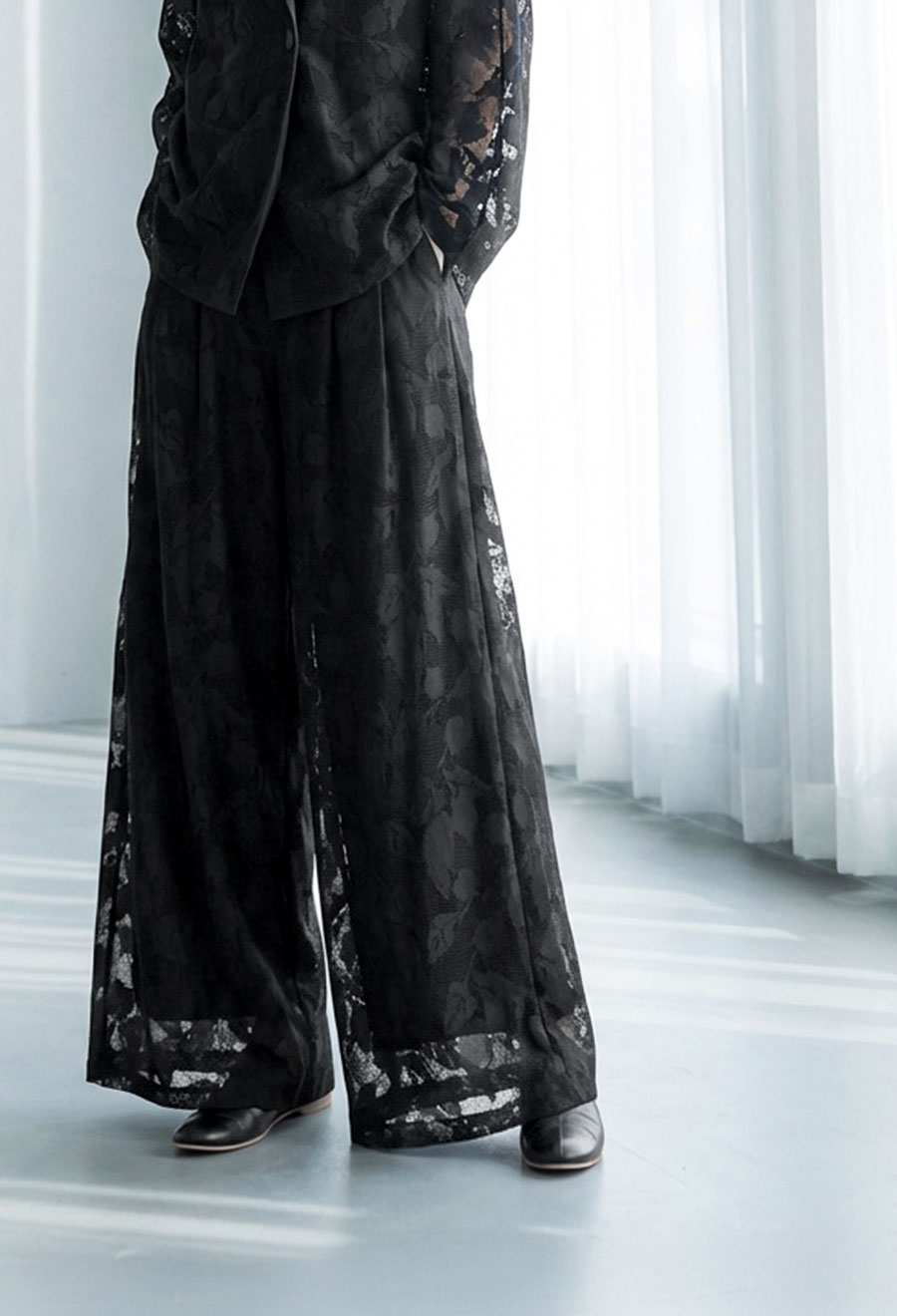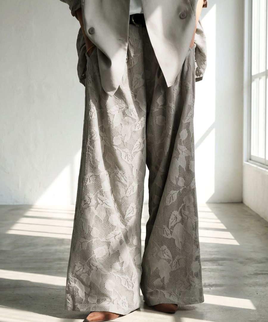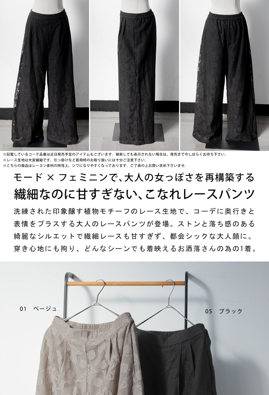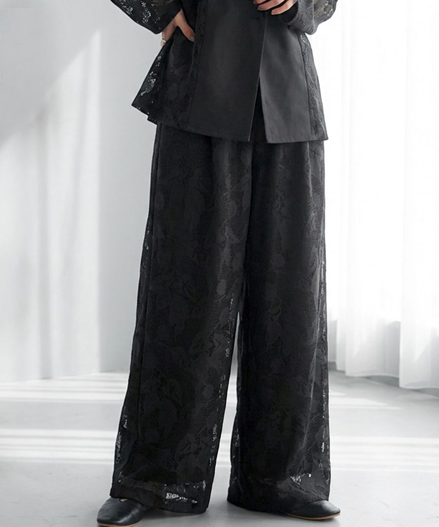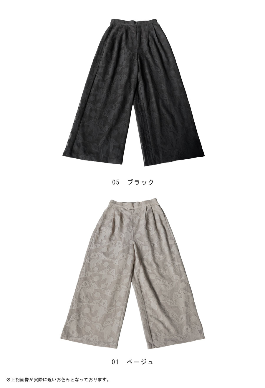 全面にあしらわれた花柄レースが印象的な、レディースワイドパンツです。