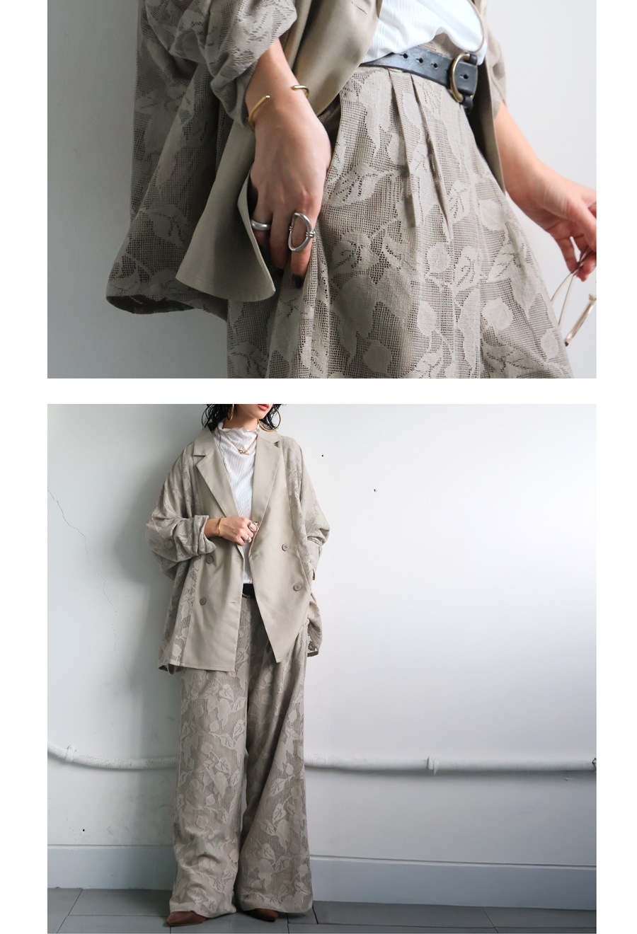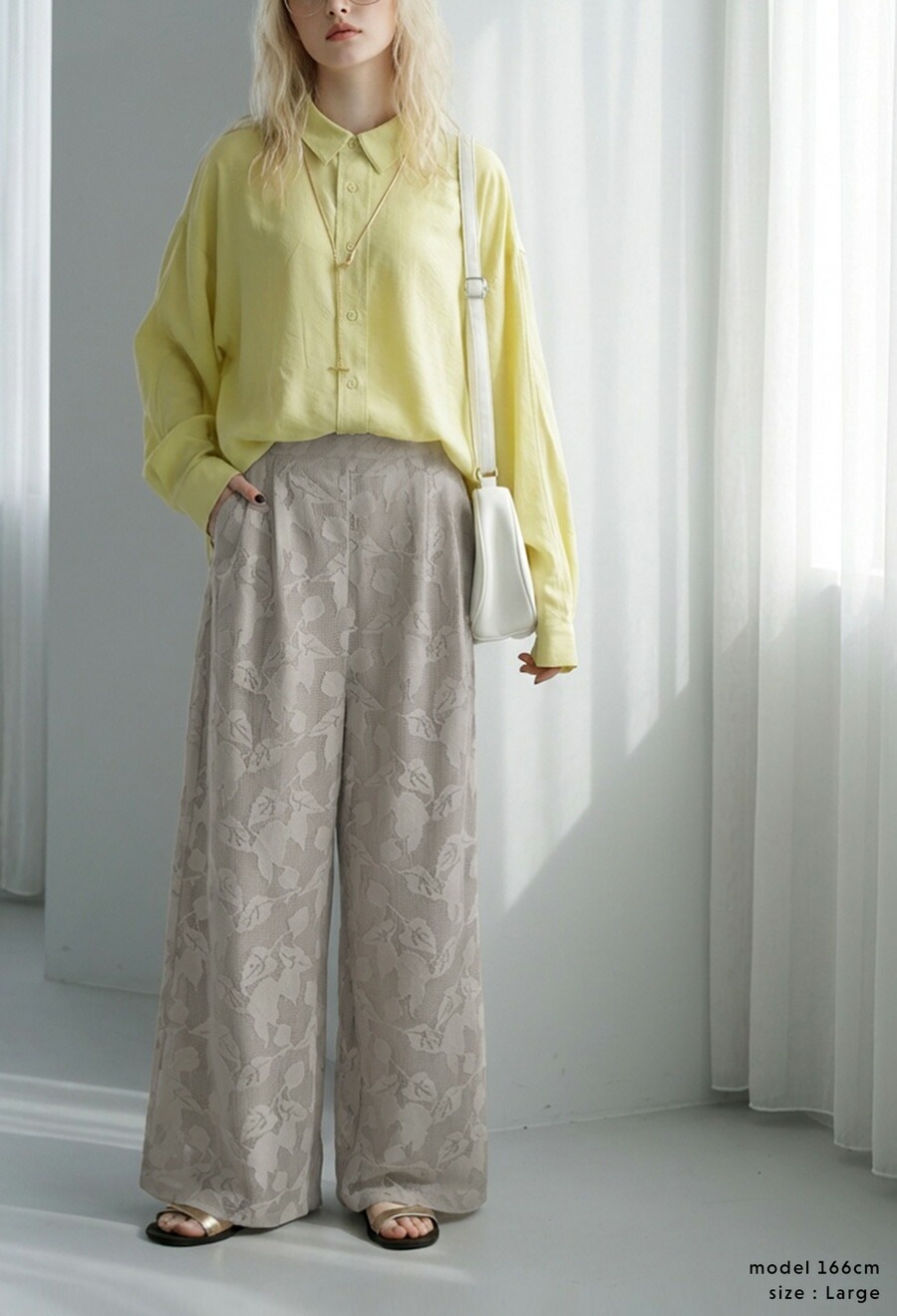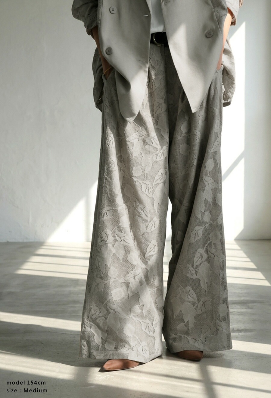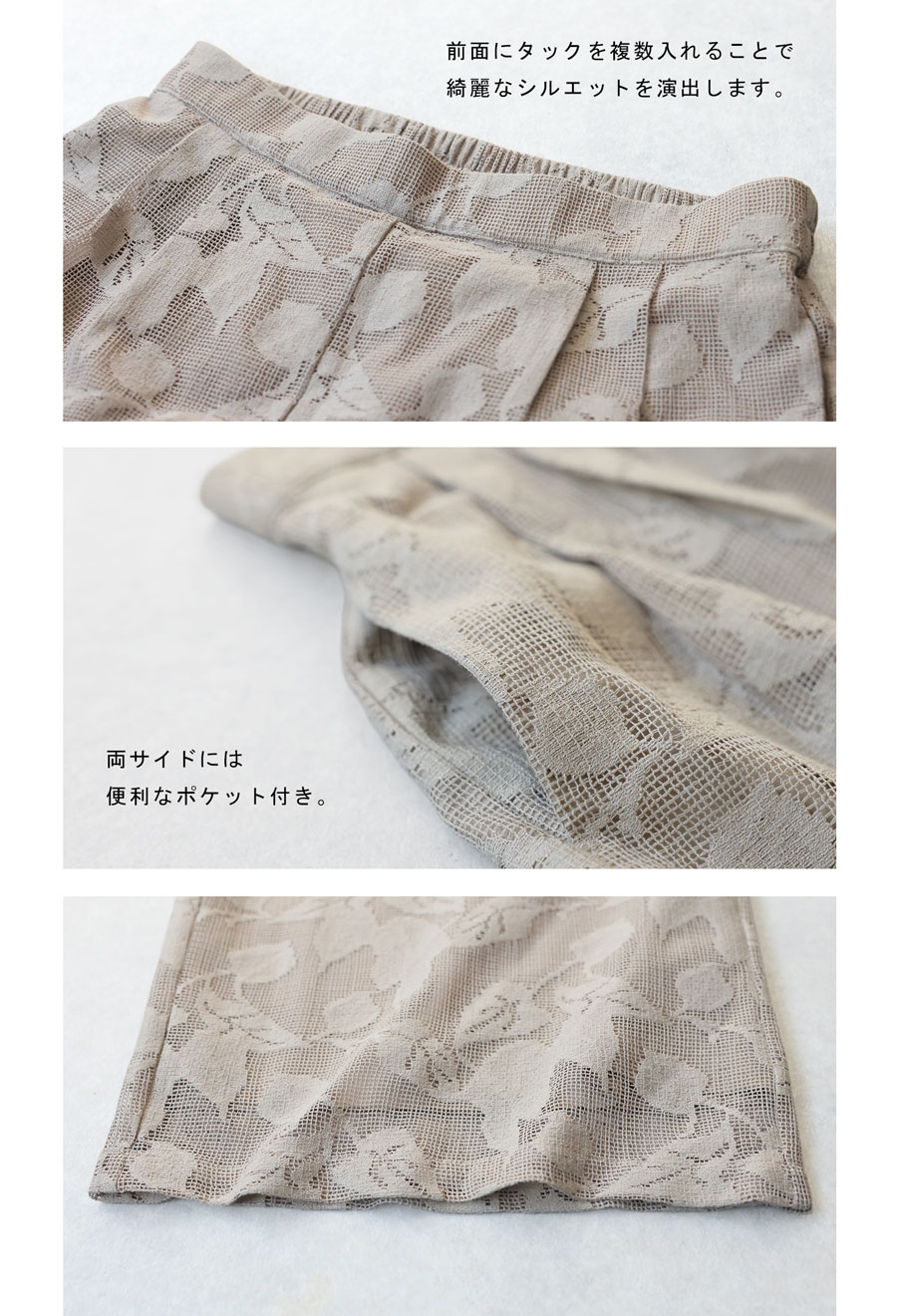 全面にあしらわれた花柄レースが印象的な、レディースワイドパンツです。