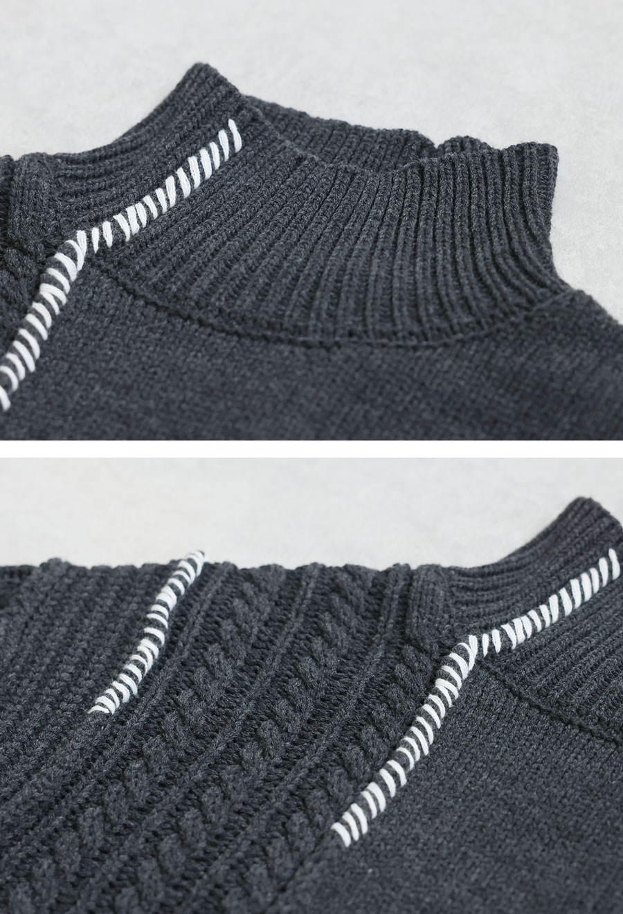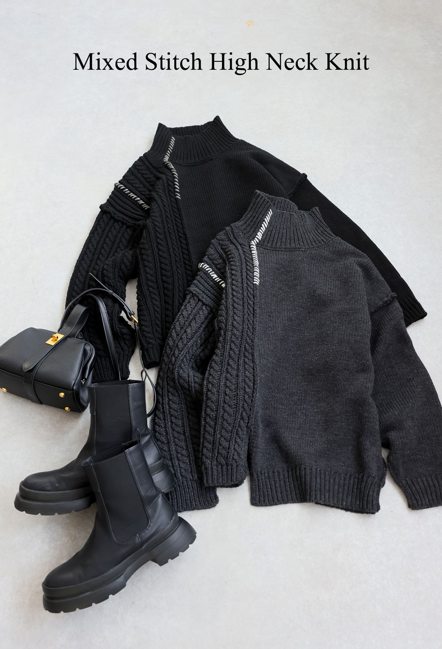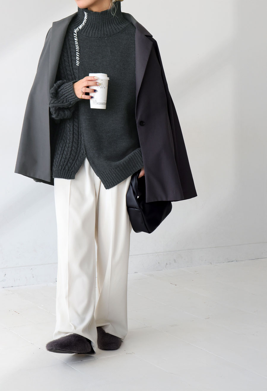同色ながらも異なる編地の質感が際立ち、コーデに奥行きをプラスします。