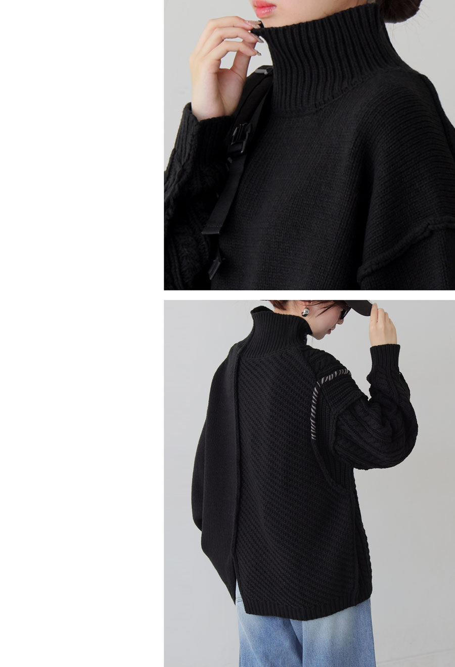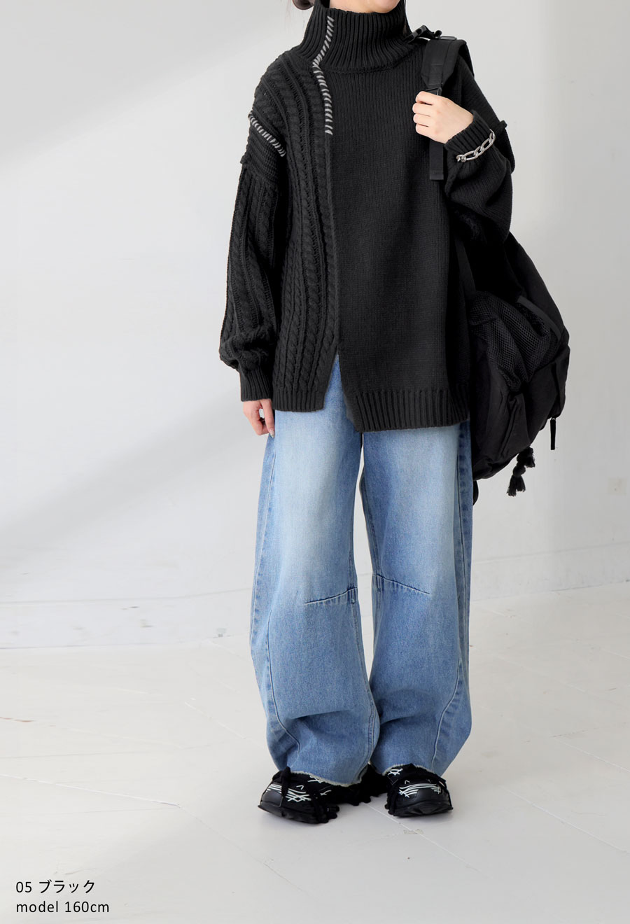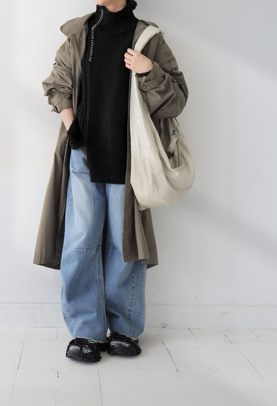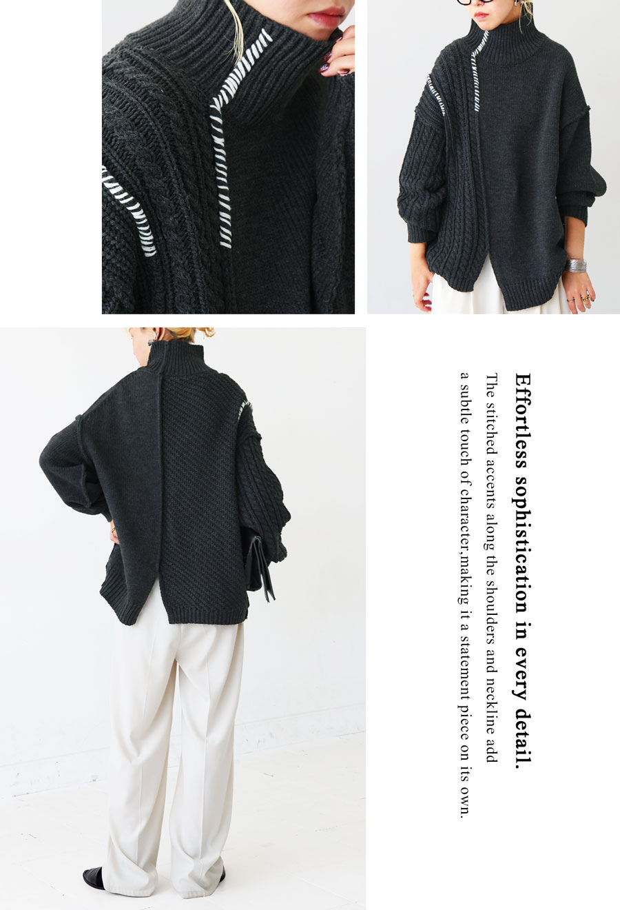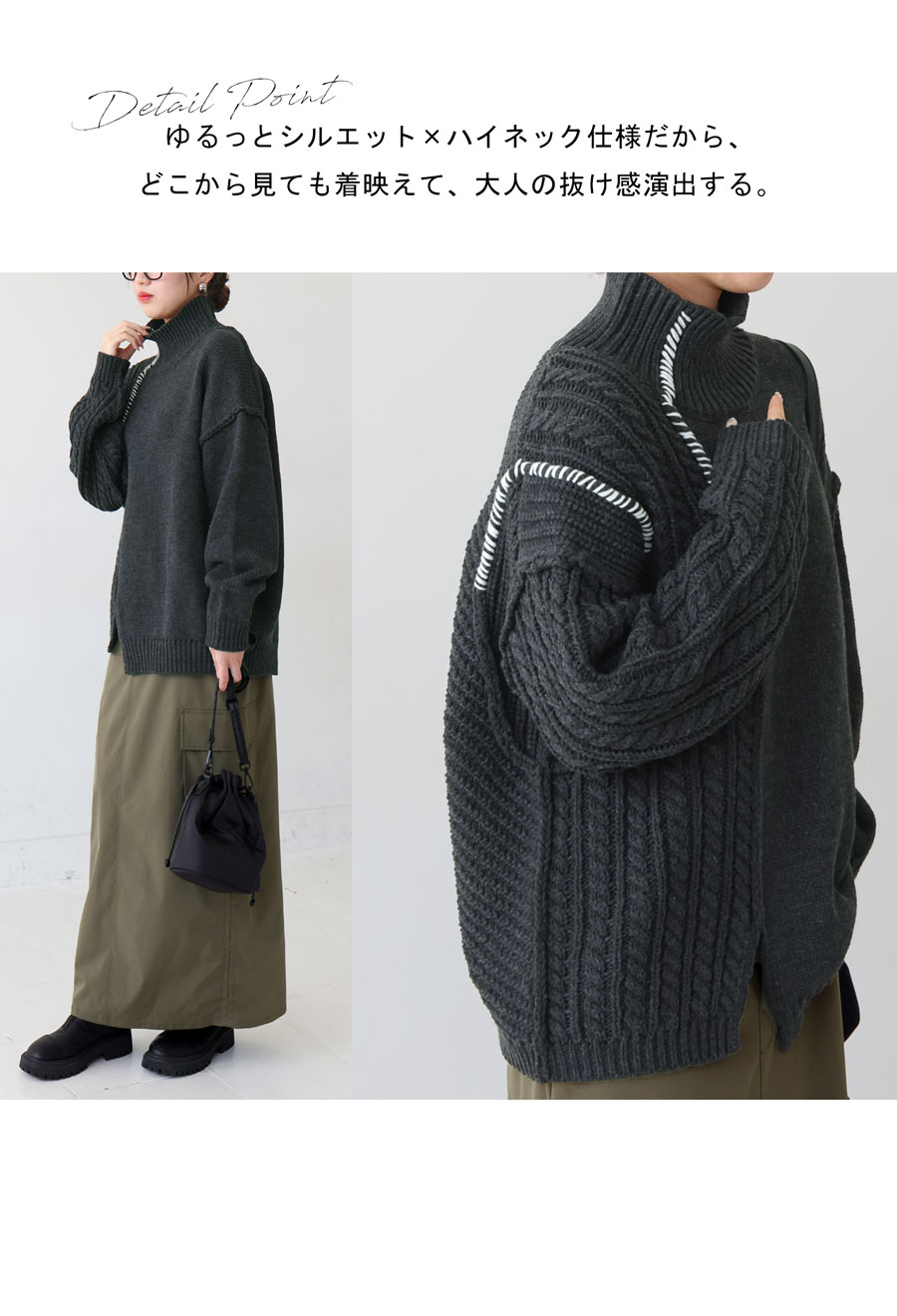 ネックラインはハイネック仕様で首元まで暖かく、ゆったりとした長袖丈とドロップショルダーで抜け感のある丈感に。