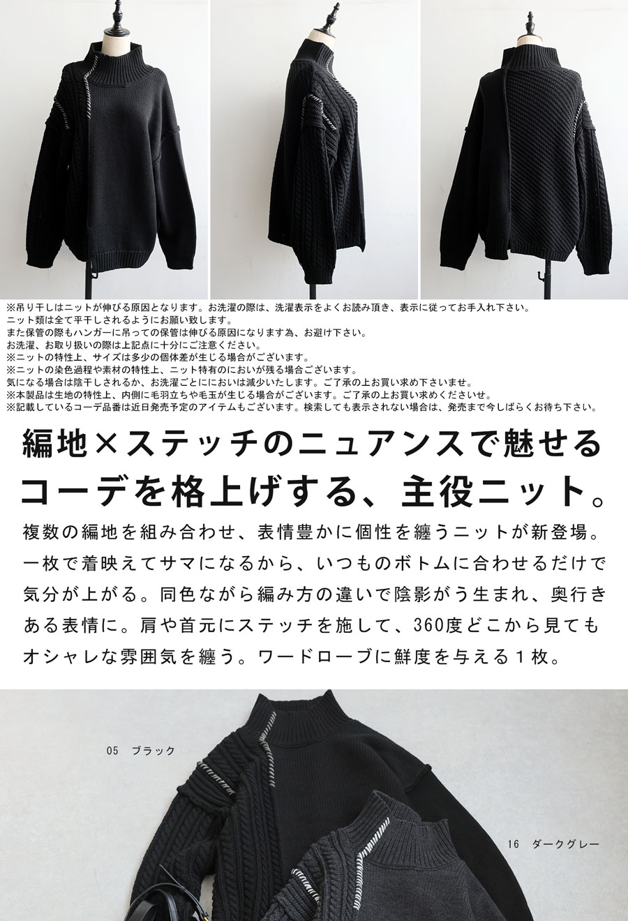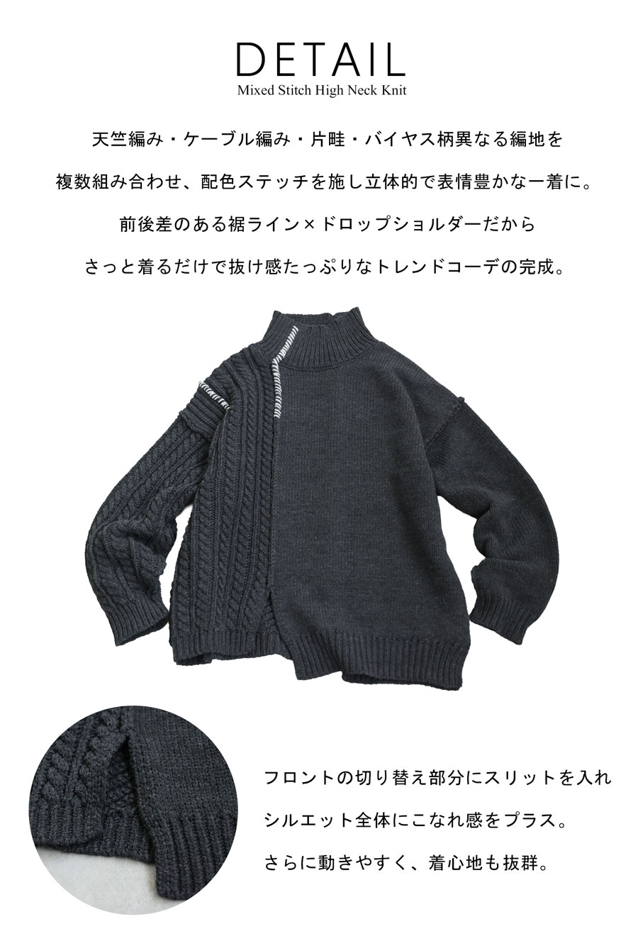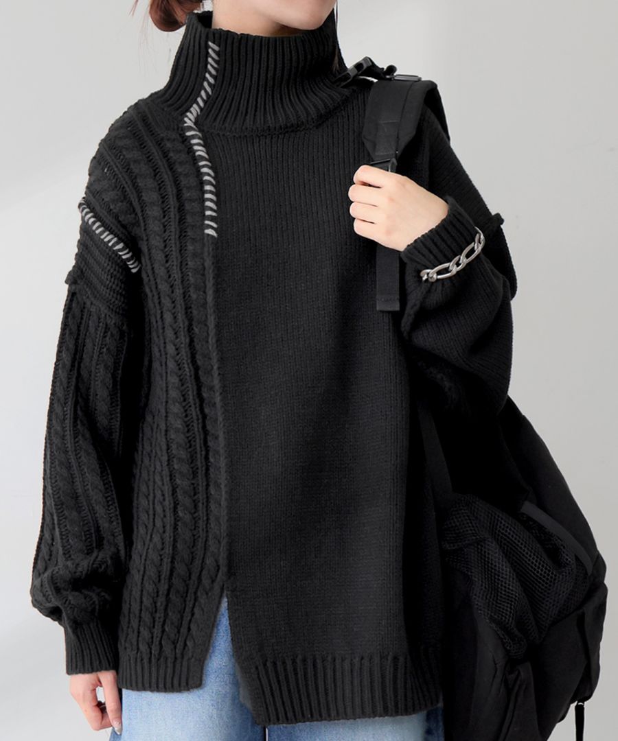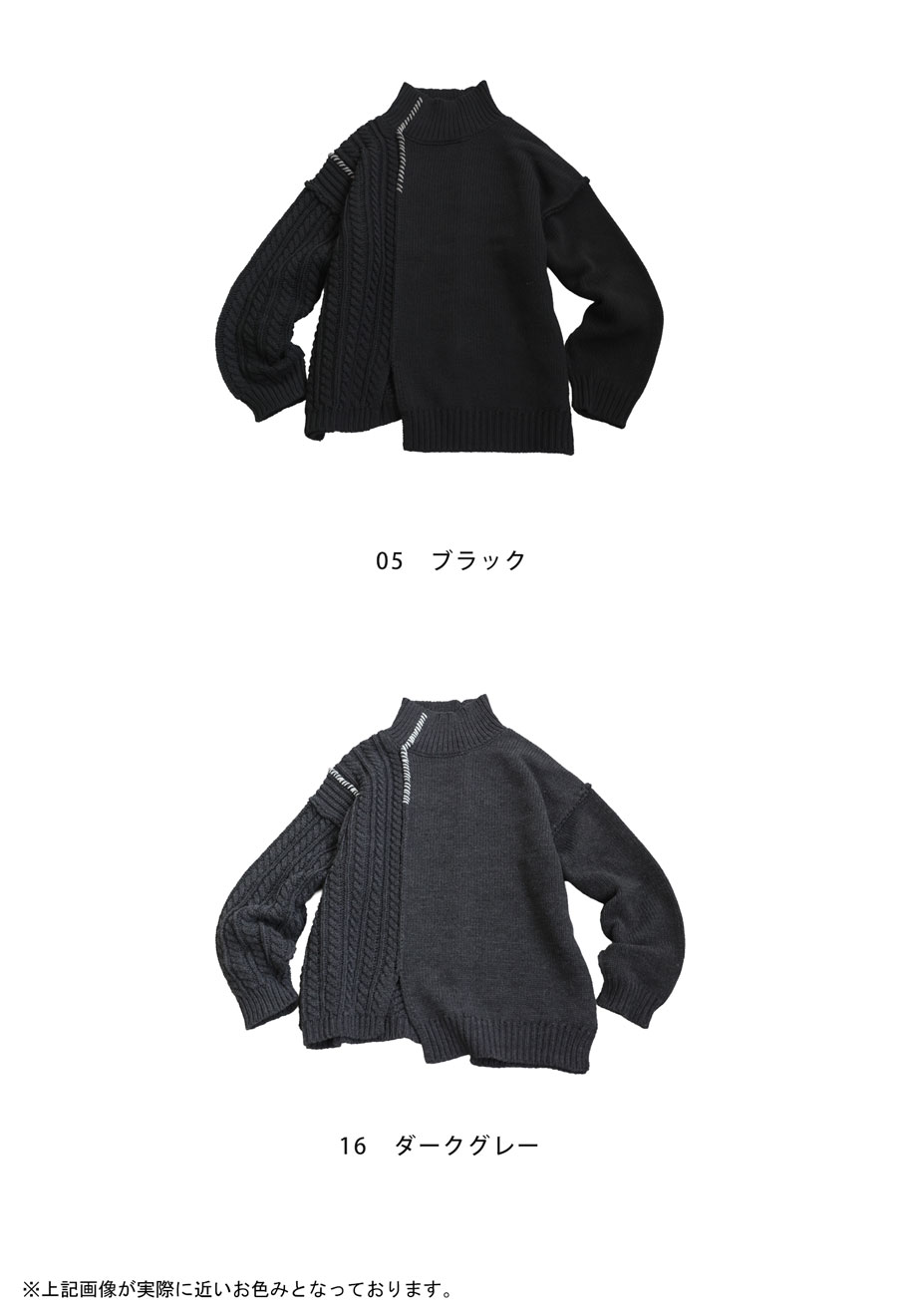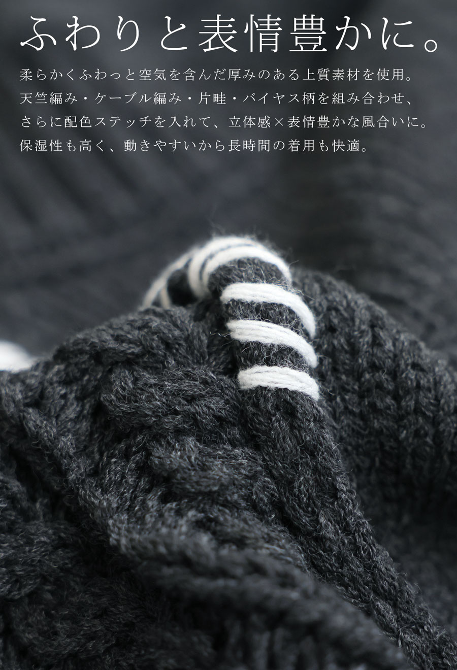 天竺・ケーブル・片畦・バイアス柄を左右非対称に配置し、表情豊かな一枚に仕上げました。