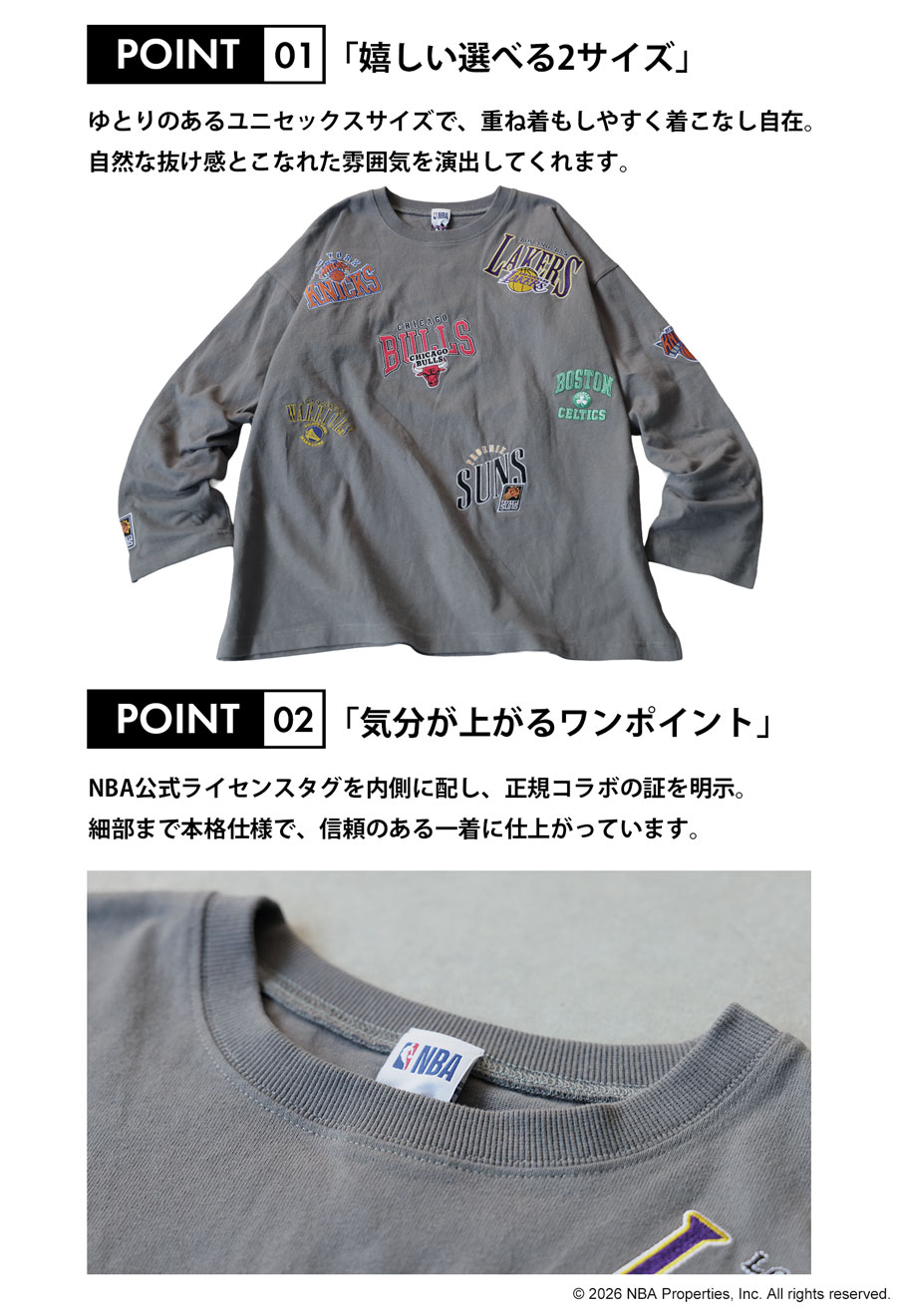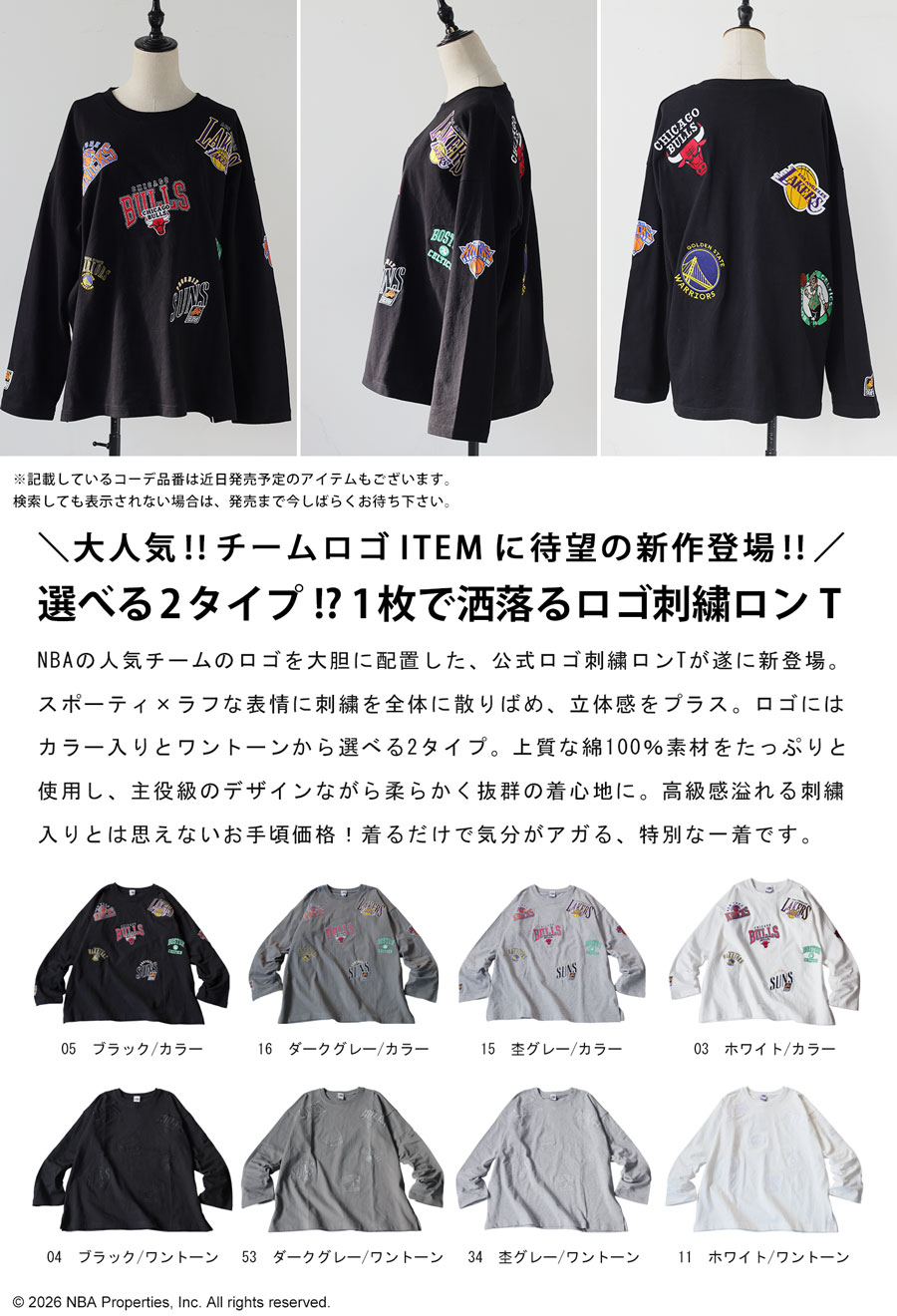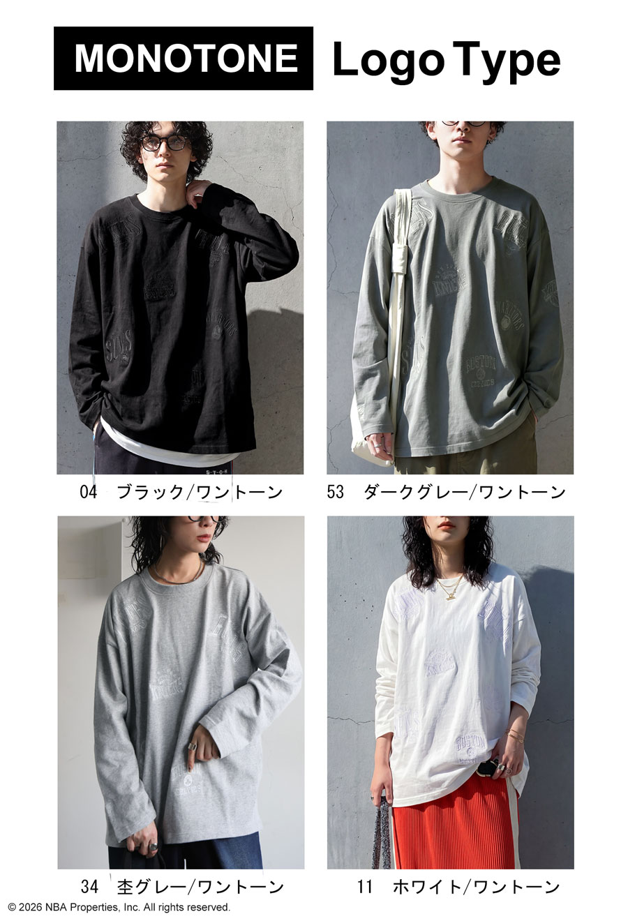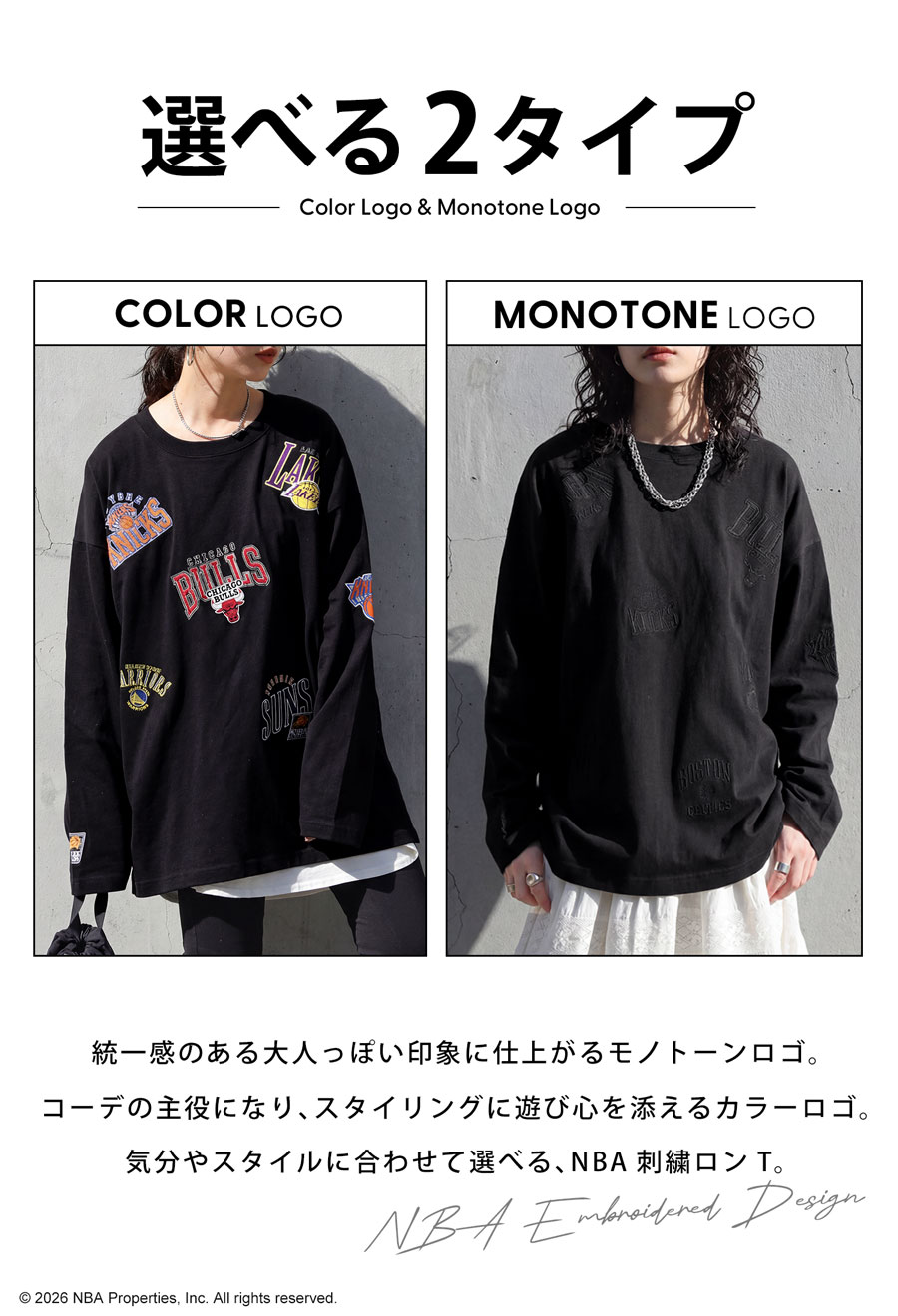 人気のNBAロゴ刺繍を全身に散りばめた、目を引くデザインのロンT(カットソー)です。