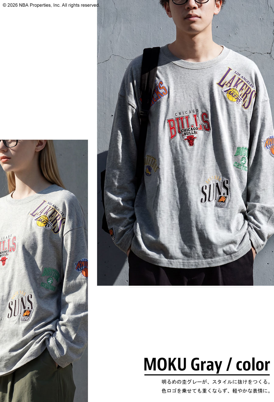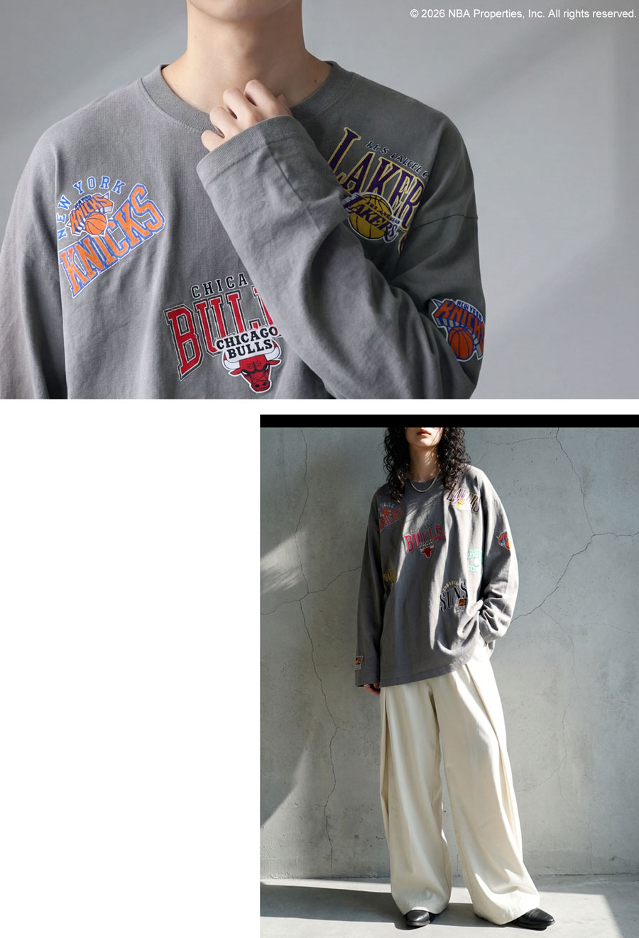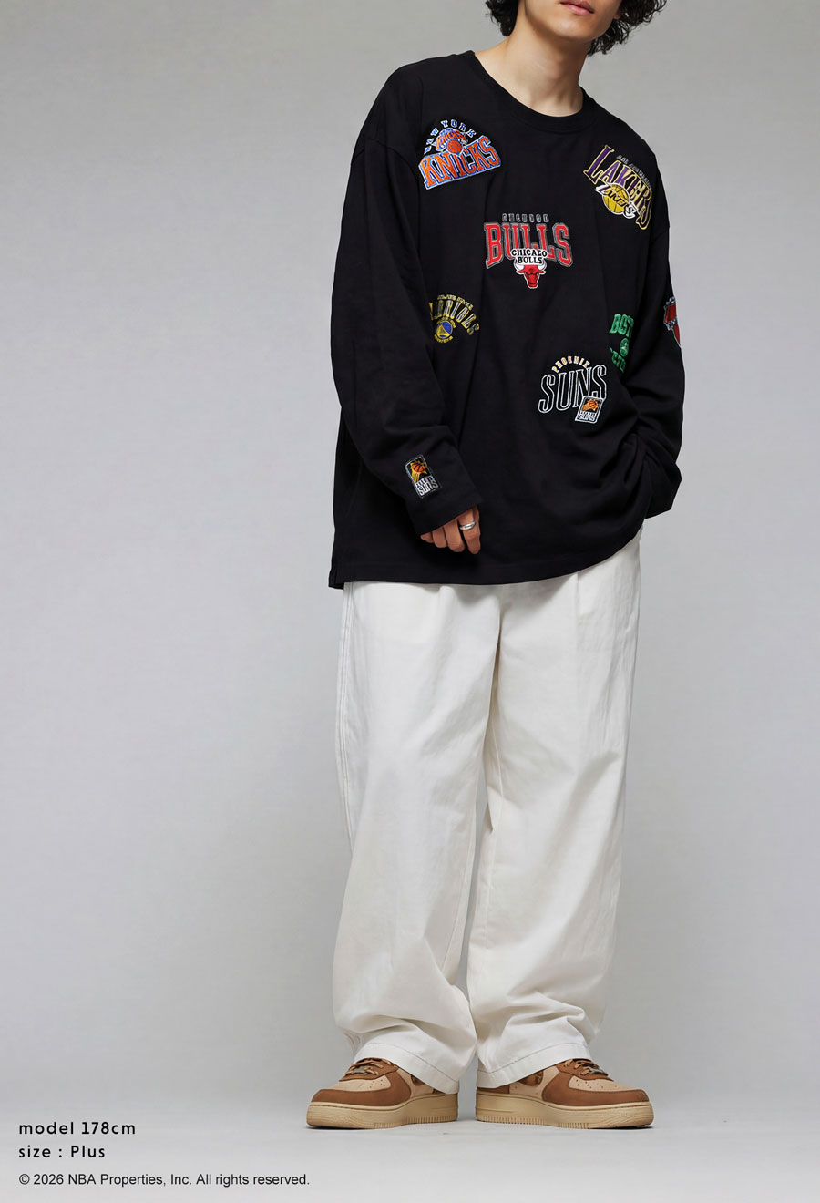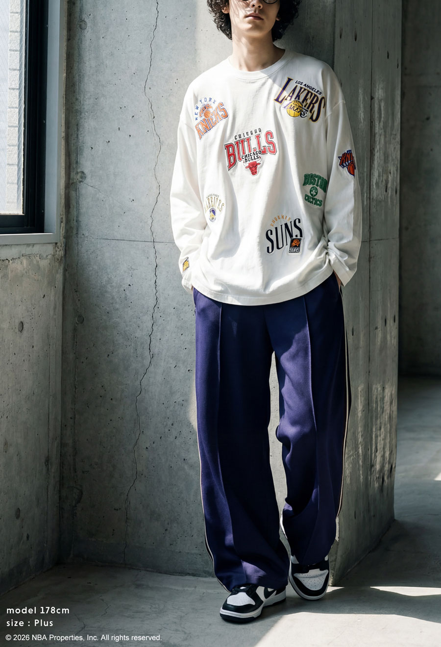 人気のNBAロゴ刺繍を全身に散りばめた、目を引くデザインのロンT(カットソー)です。