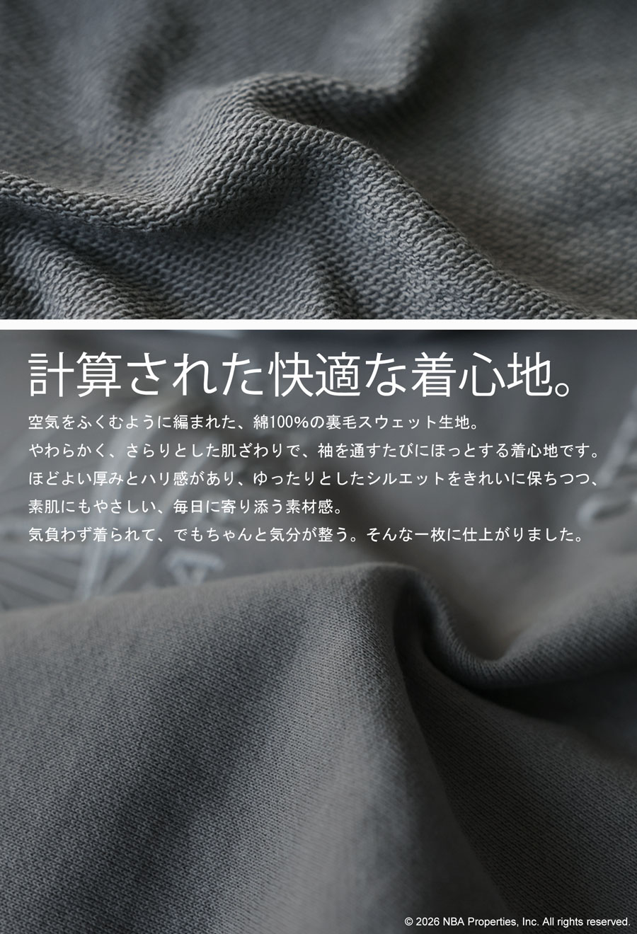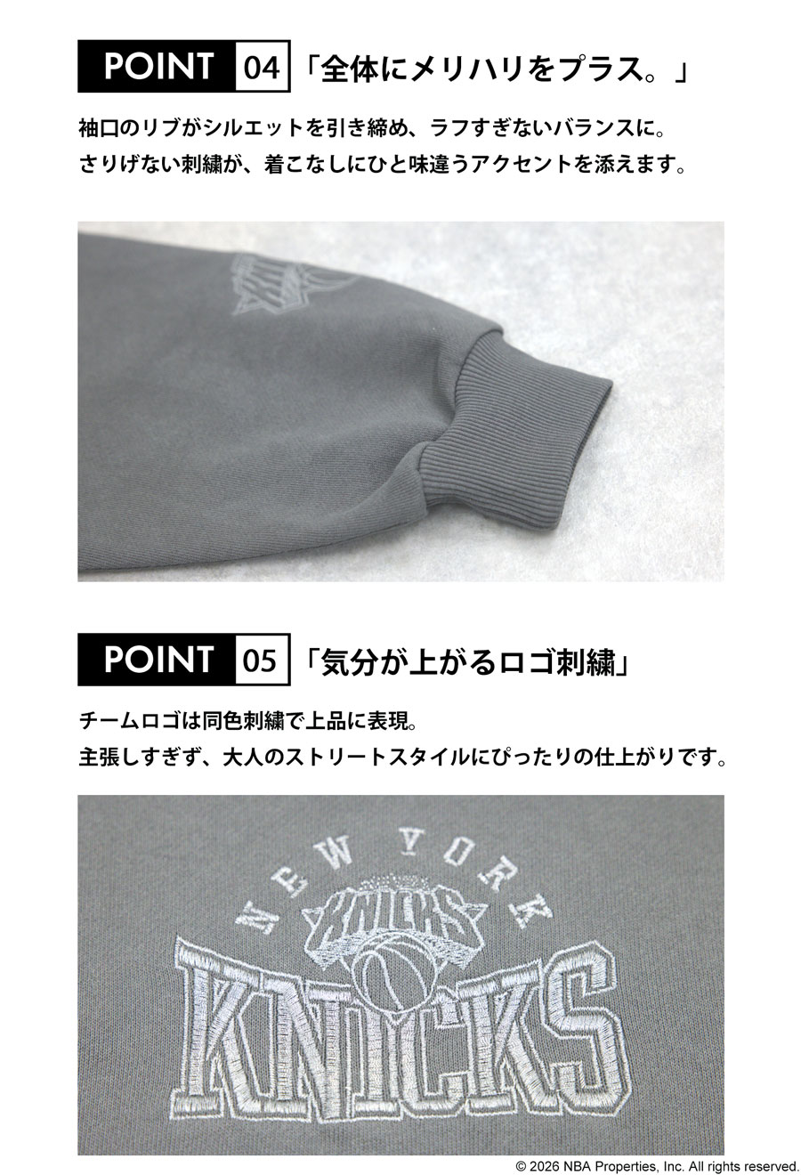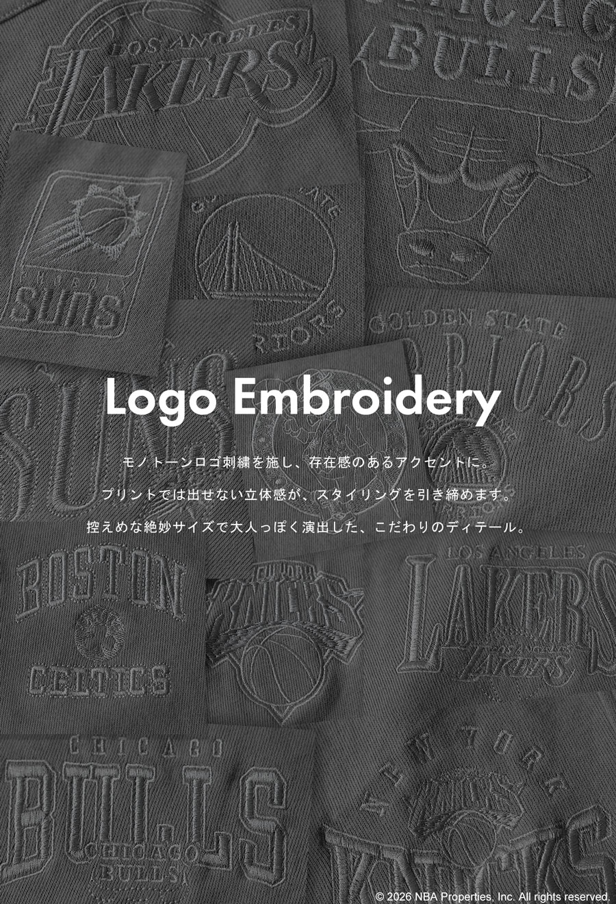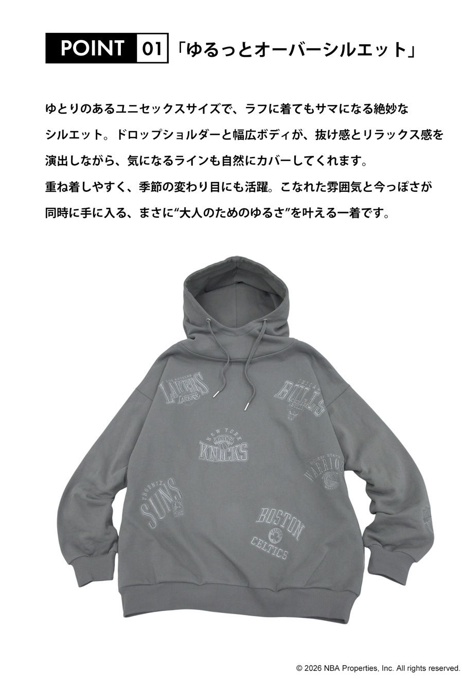 NBA公式の刺繍ロゴが存在感を放つ、綿100%(コットン)の裏毛スウェットパーカーです。