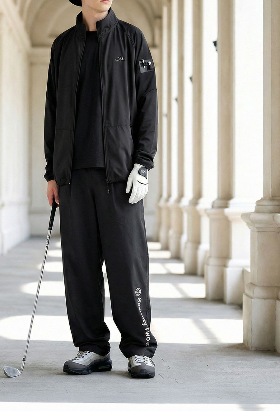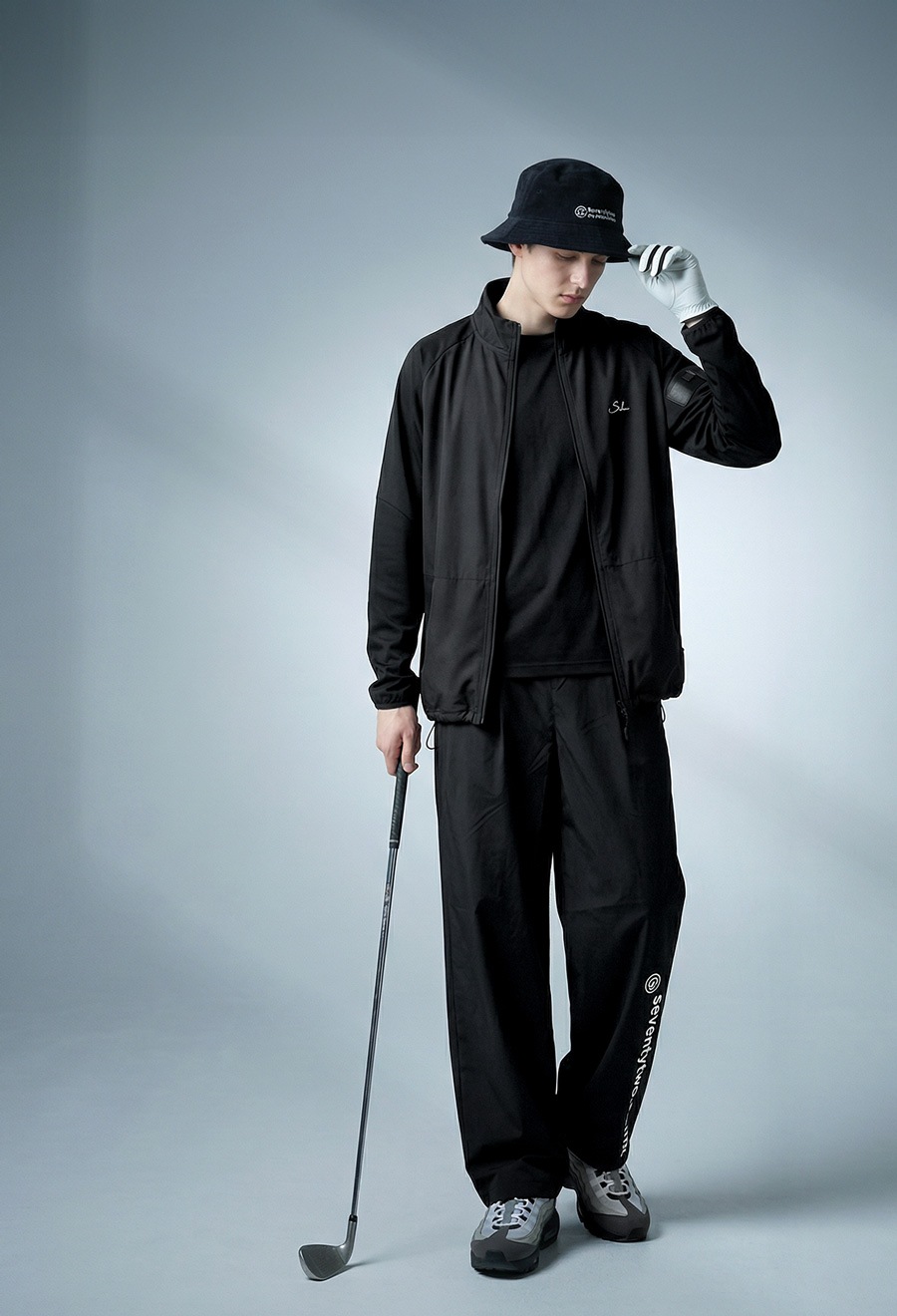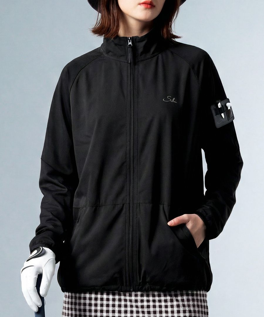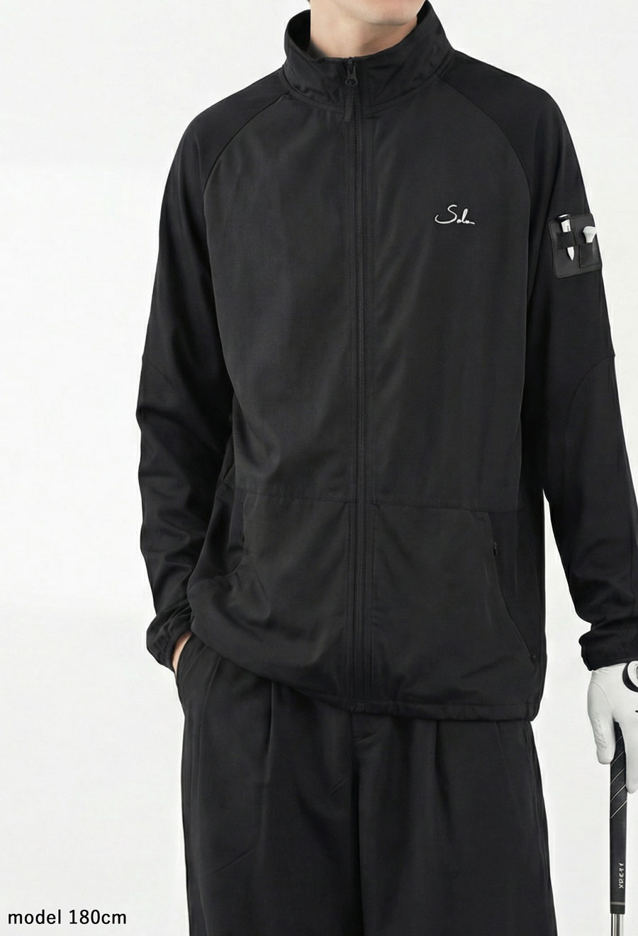 無地ベースの切替デザインにブランドロゴとティーホルダー付きポケットを添え、さりげないアクセントに。