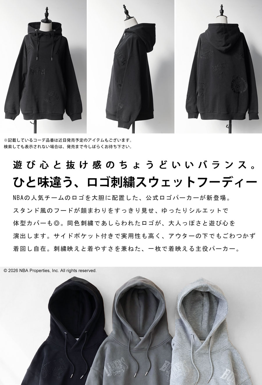 NBA公式の刺繍ロゴを同色であしらい、落ち着いたストリート感を演出できる裏毛スウェットフーディーです。