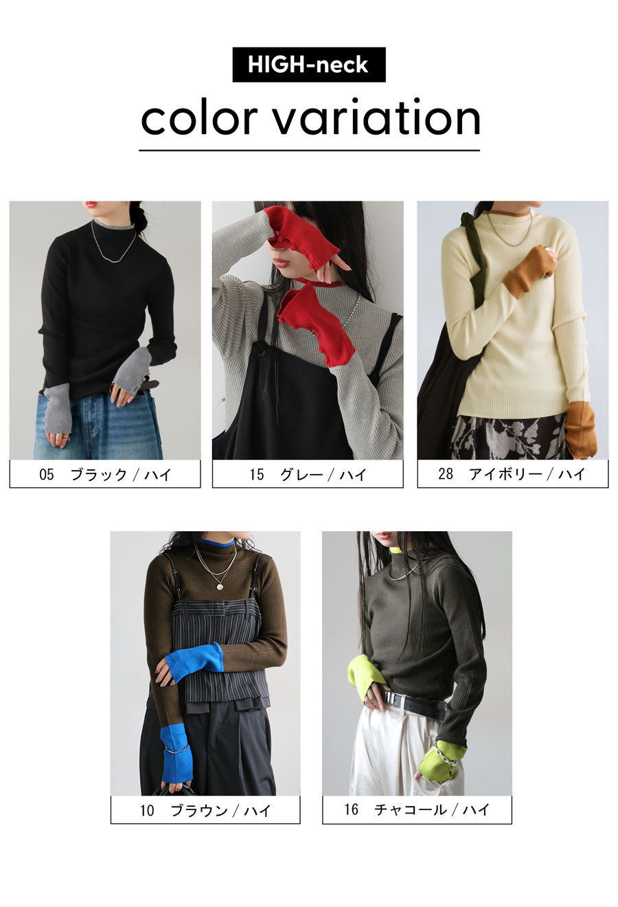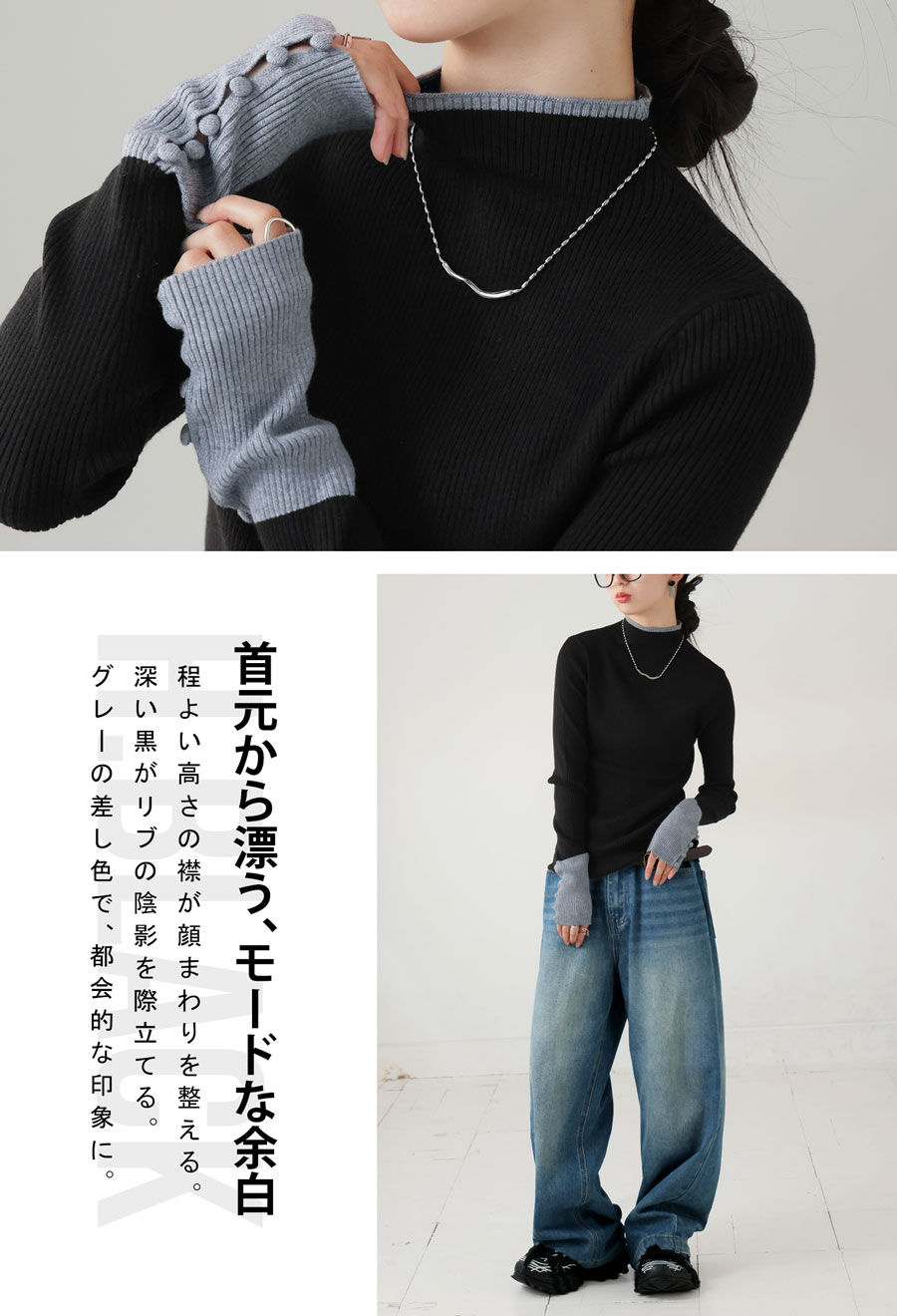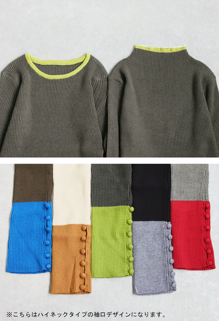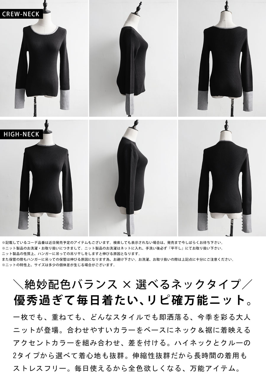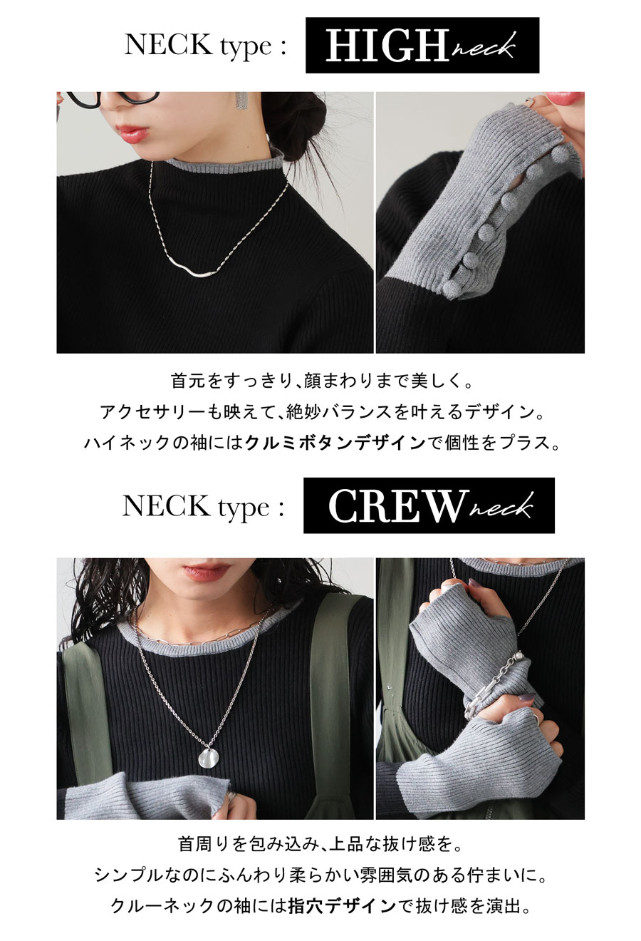 ネックラインはモックネック(ハイネック)とラウンドネック(クルーネック)の2タイプ展開で、着こなしや好みに応じて選べます。
