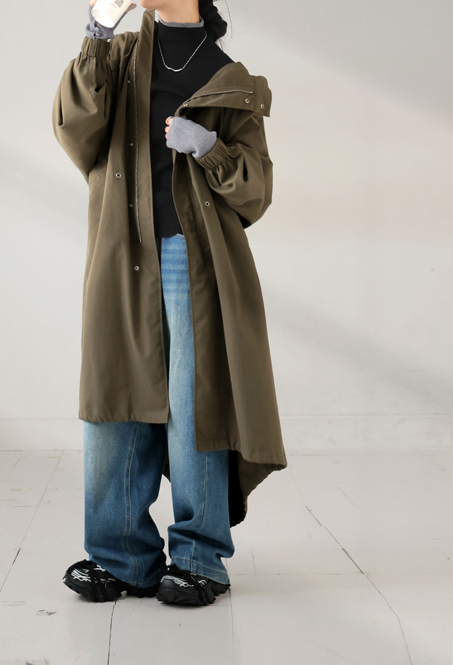 袖丈は手の甲までかかる長袖で、指穴付きの袖に施された袖ボタンが程よいアクセントに。