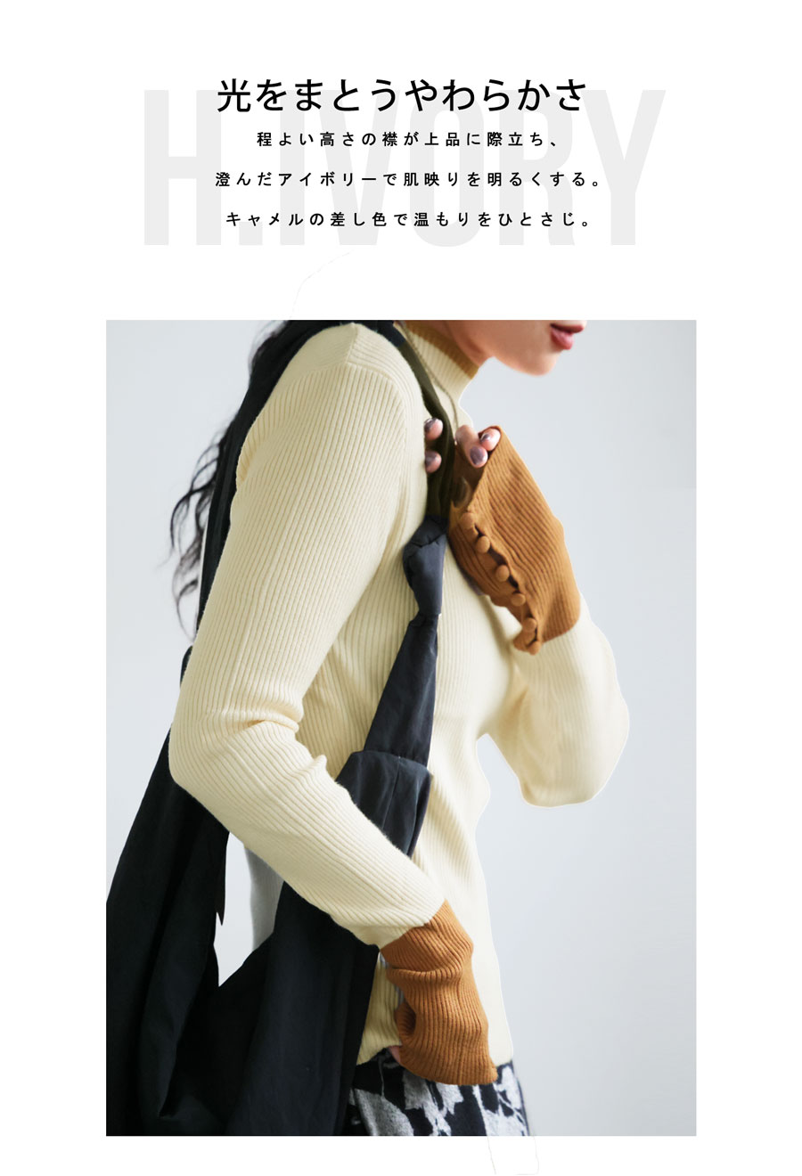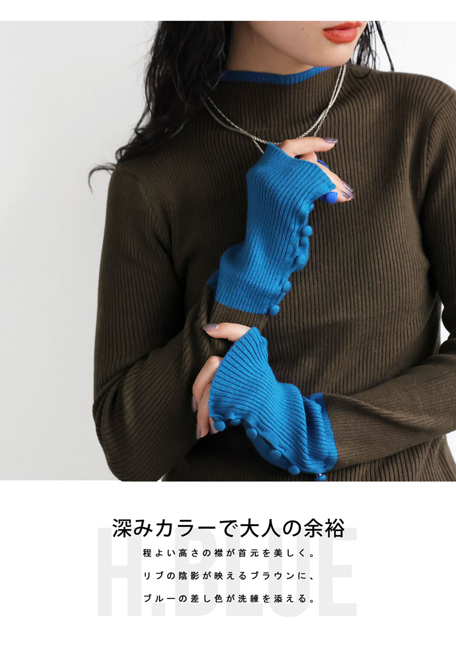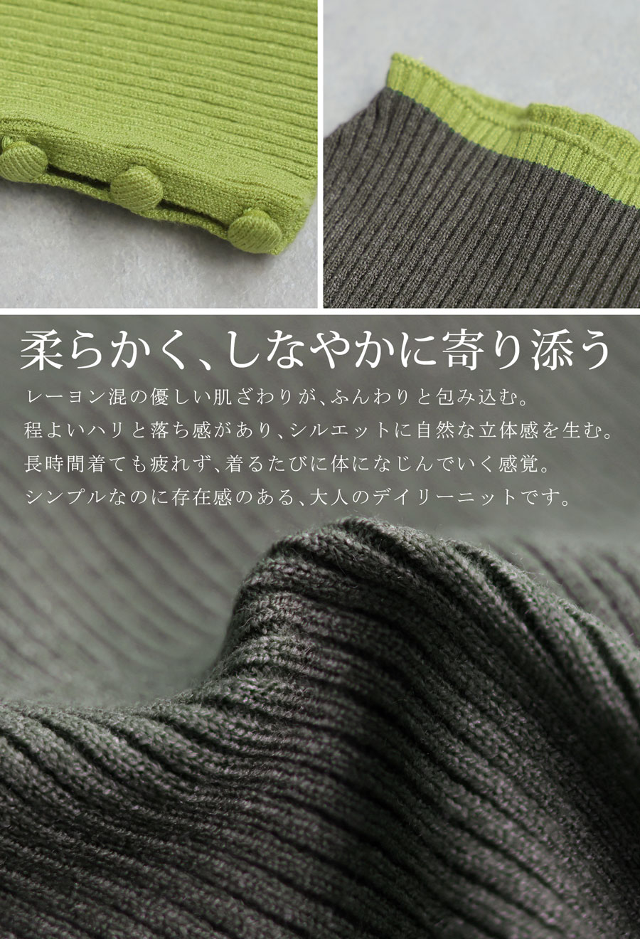 丈感は腰にかかる長さで、身体に優しく沿うリブ編みの形状が美しいシルエットを演出します。