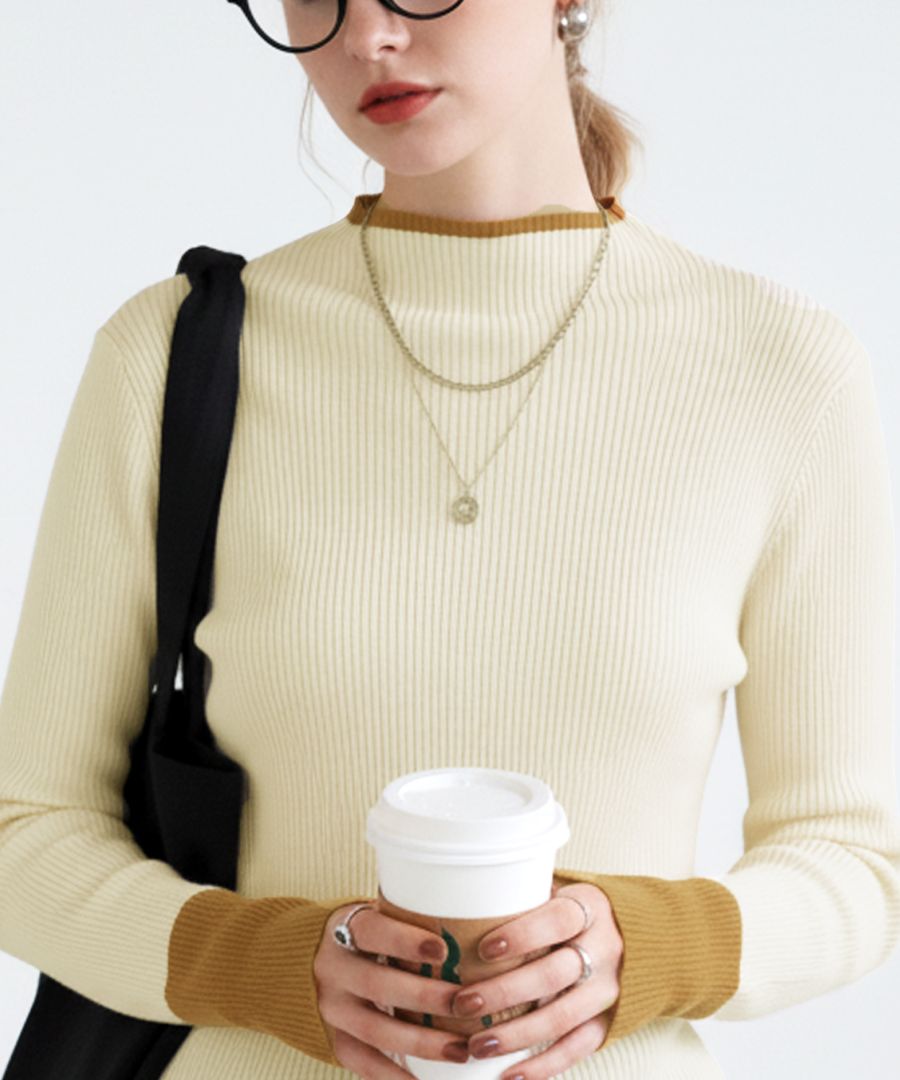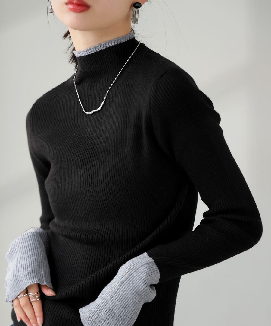 配色の切り替えが際立つ、きれいめなリブニットセーターです。