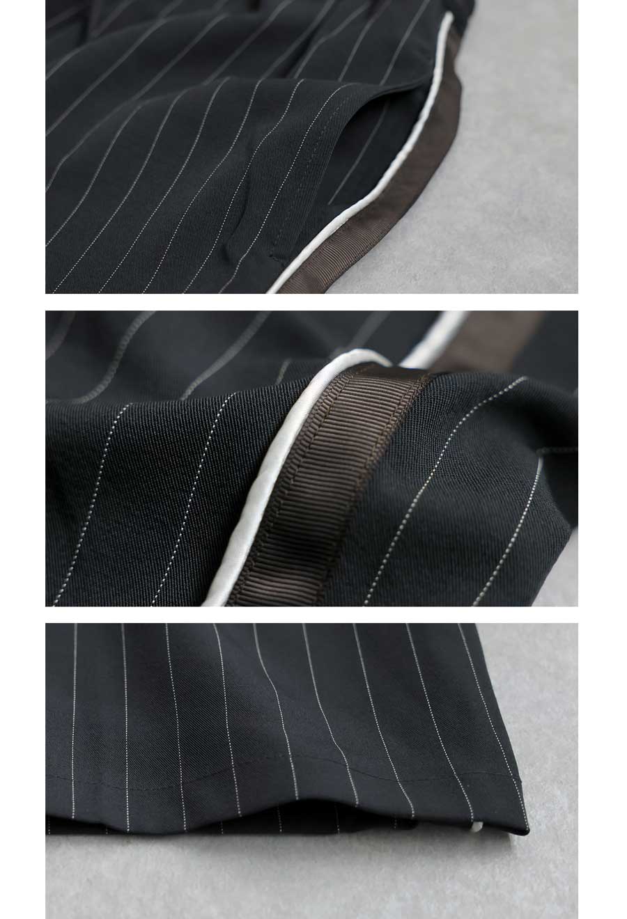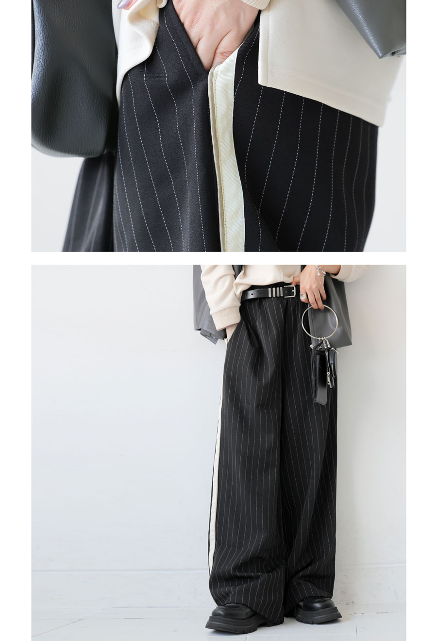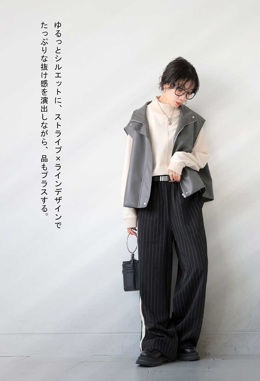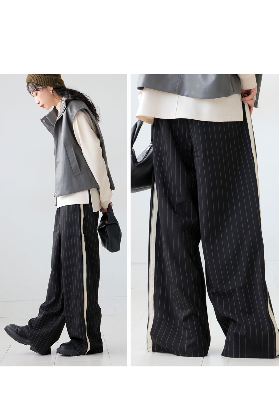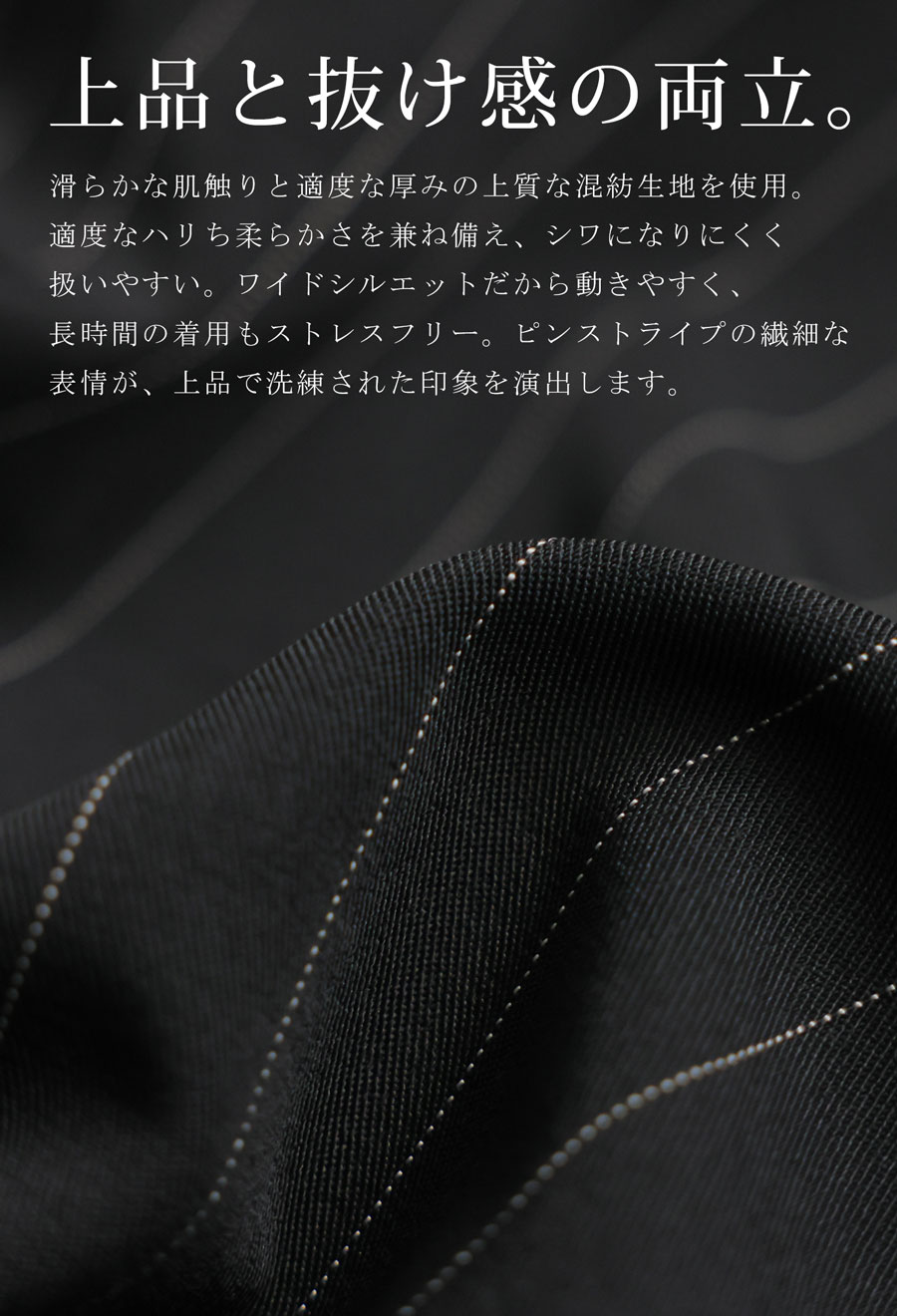 さりげないピンストライプ柄が縦のラインを強調し、スタイルアップ効果を演出するワイドパンツです。