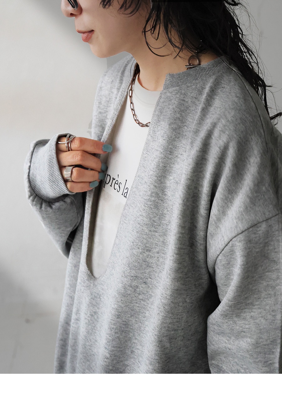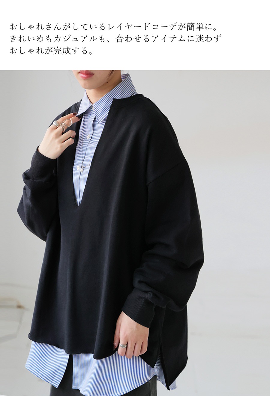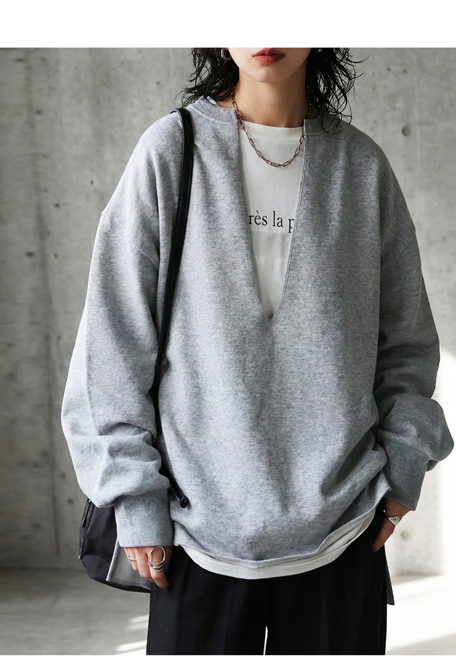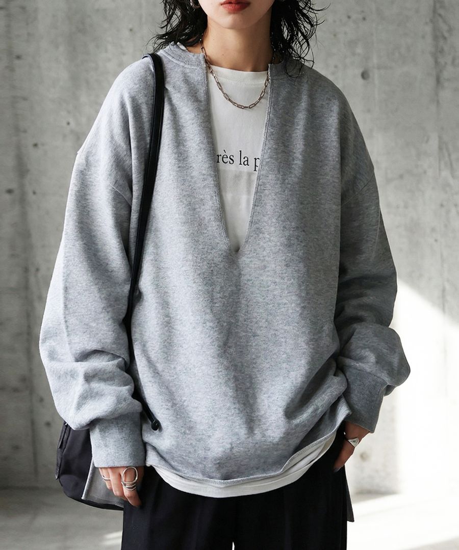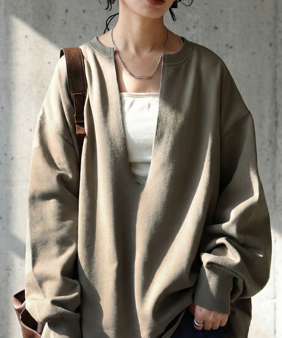 ネックラインは顔まわりをすっきり見せる深めのカットで、重ね着(レイヤード)にも適したバランスです。