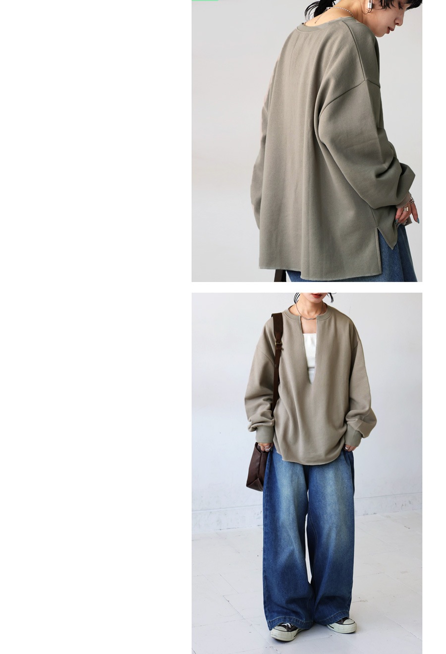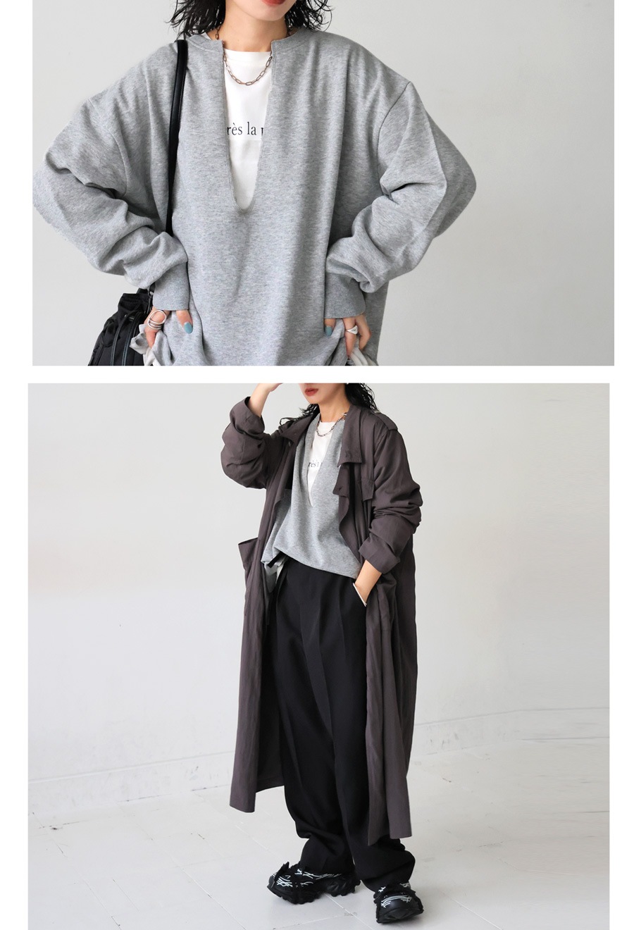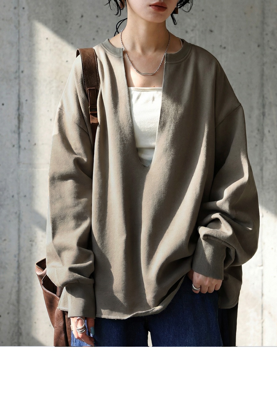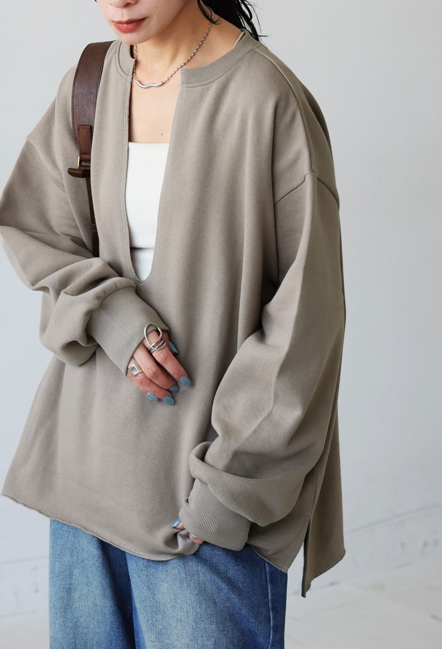 ネックラインは顔まわりをすっきり見せる深めのカットで、重ね着(レイヤード)にも適したバランスです。