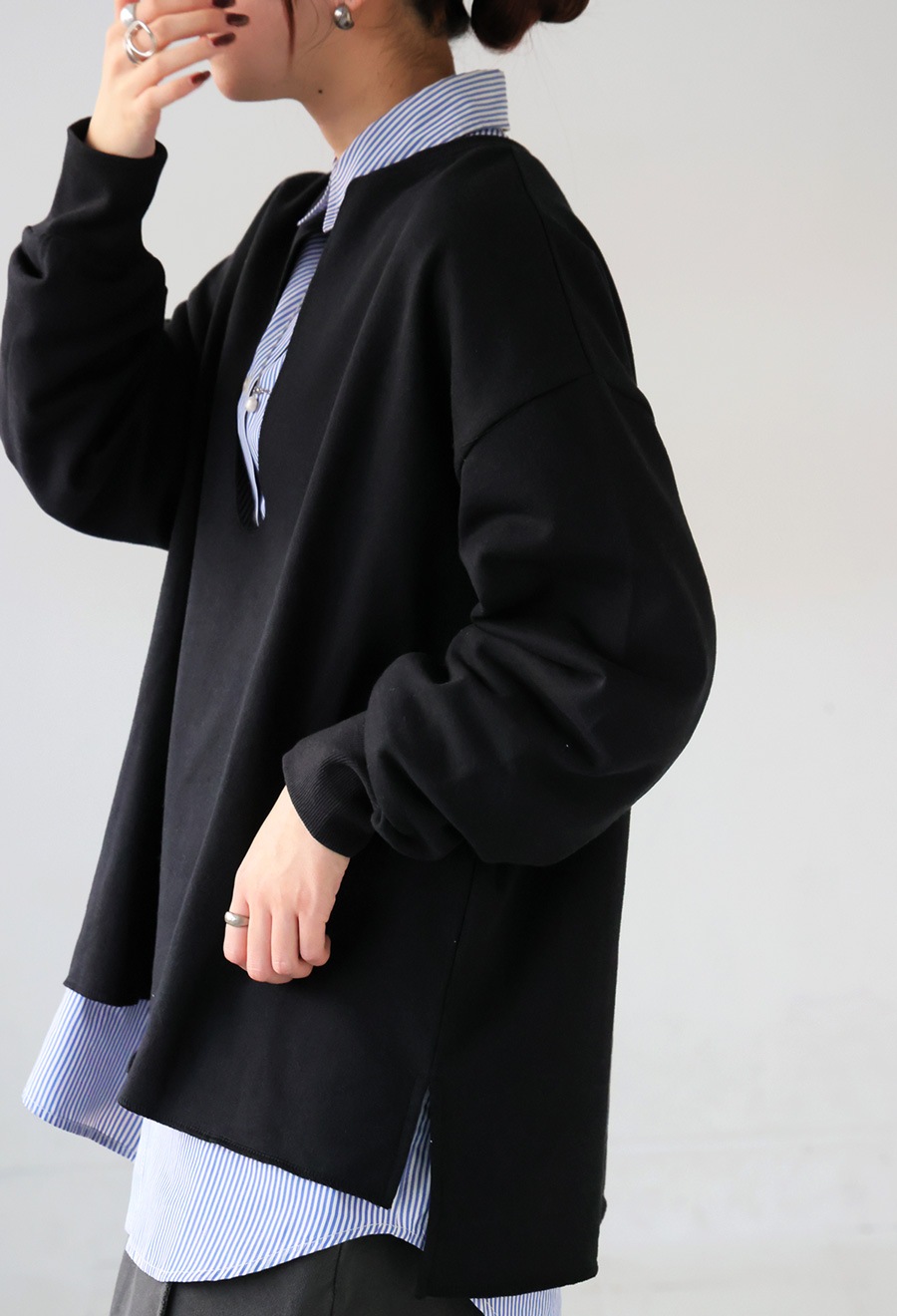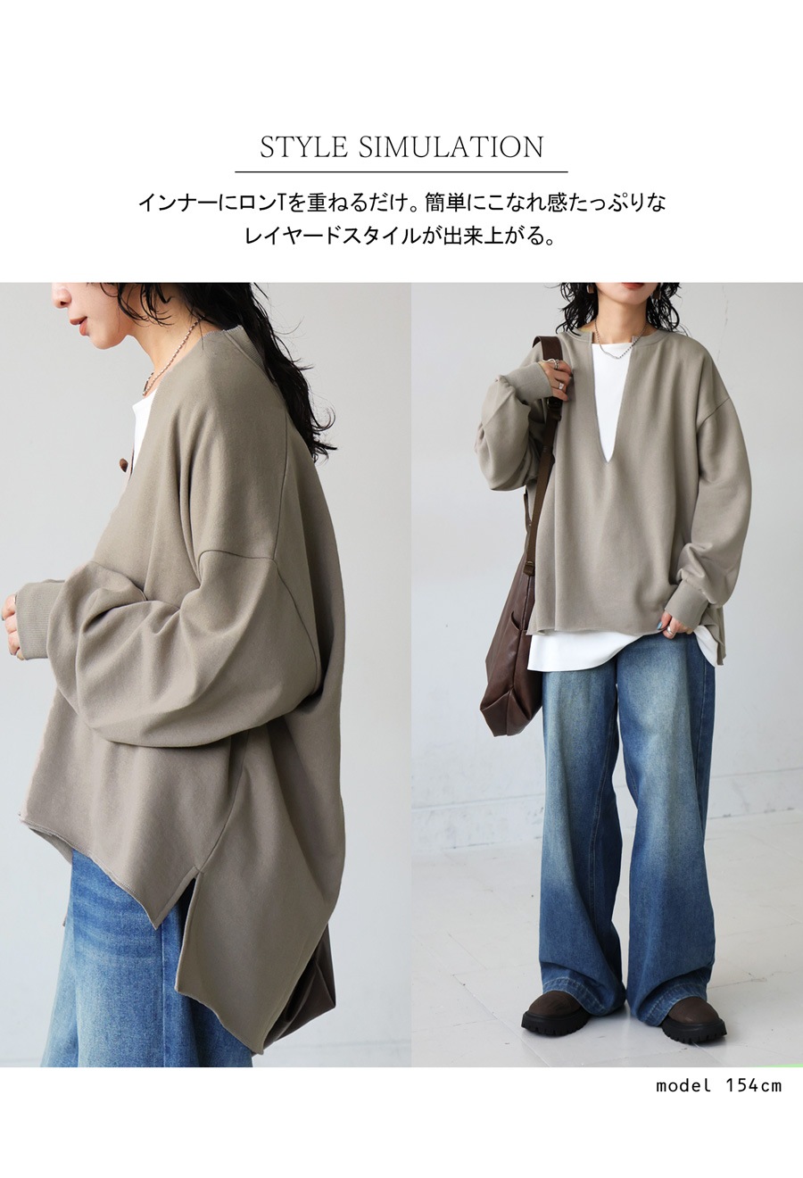 袖丈は手首まで届く長袖仕様で、ゆとりのあるシルエットがリラックス感をプラスします。
