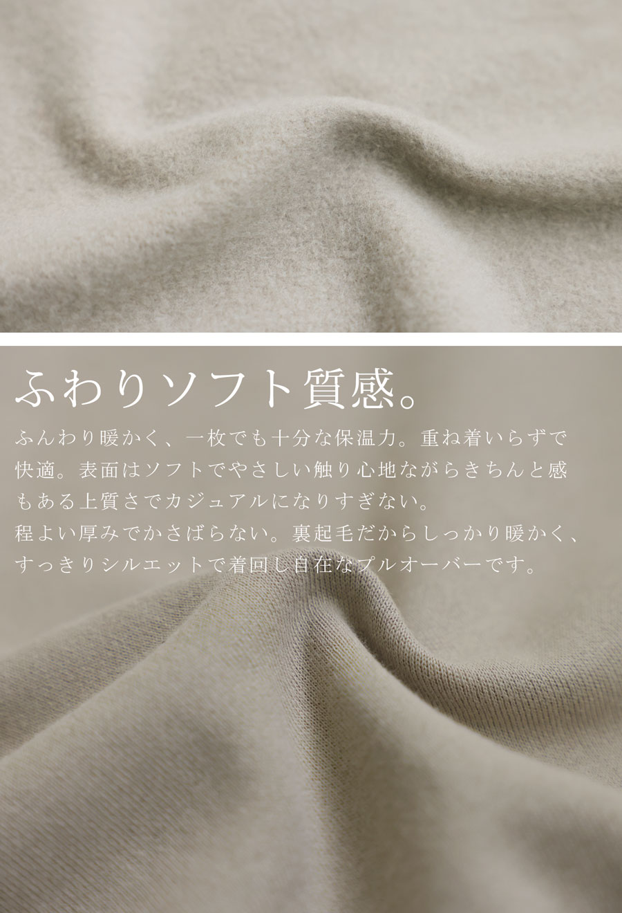 内側はふんわりとした裏起毛素材で、あたたかさと快適な着心地を兼ね備えています。