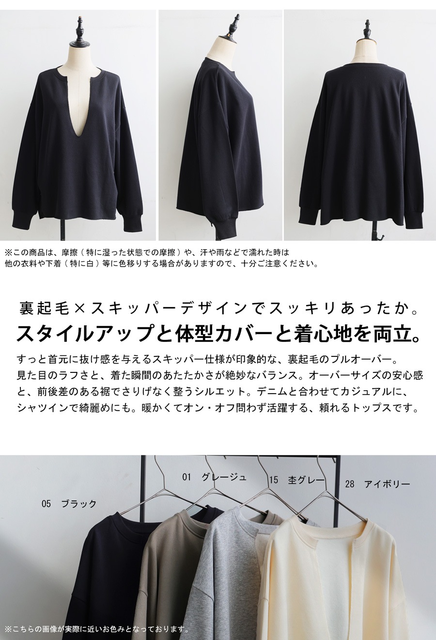 カラーはブラック(黒・クロ・Black)、アイボリー(生成・オフホワイト・Ivory)、グレージュ(灰ベージュ・Greige)、杢グレー(灰色・グレー・Heather Gray)の4色展開。